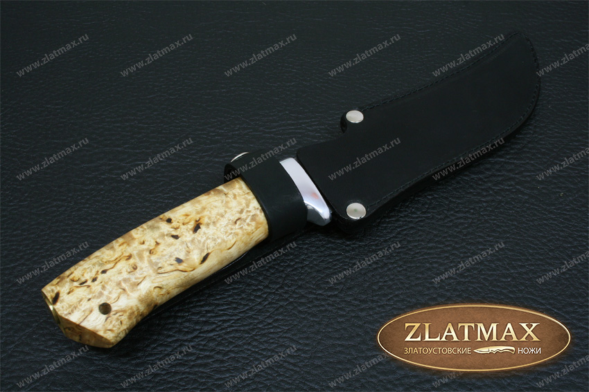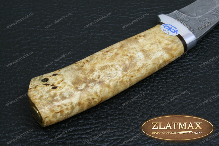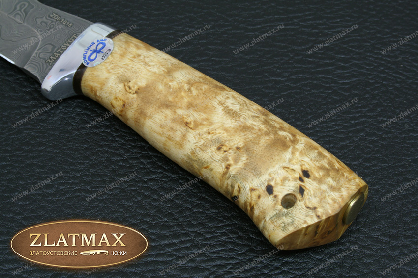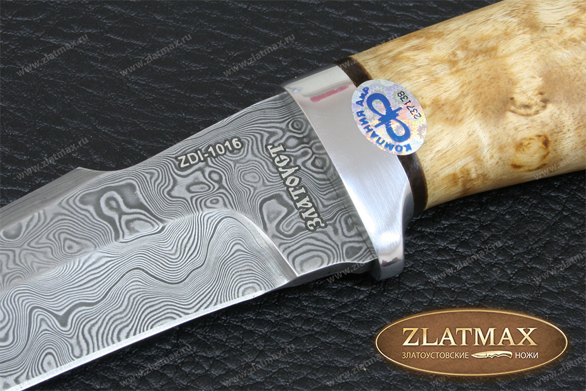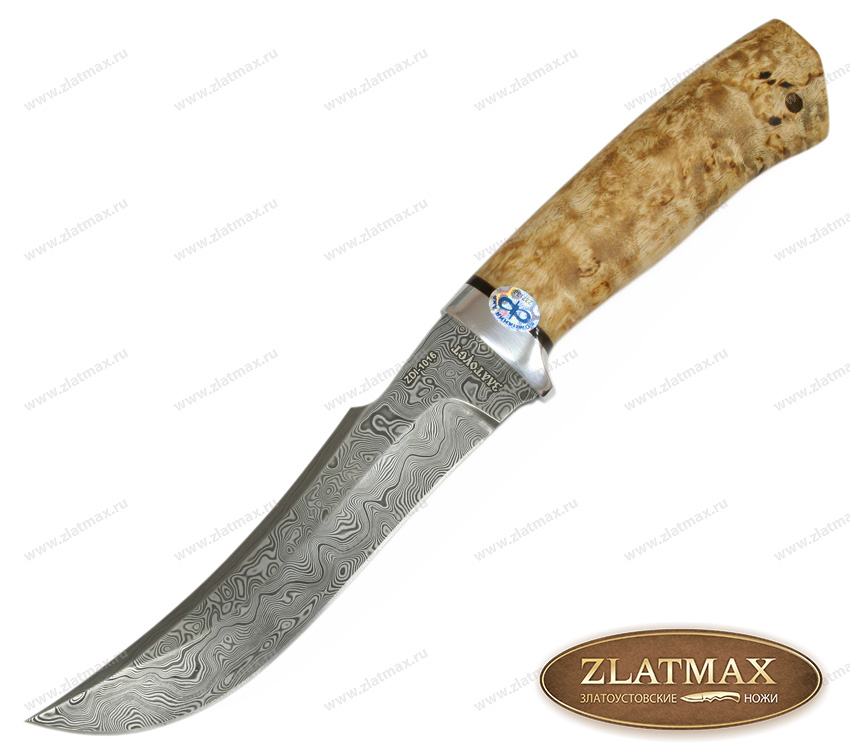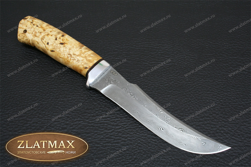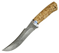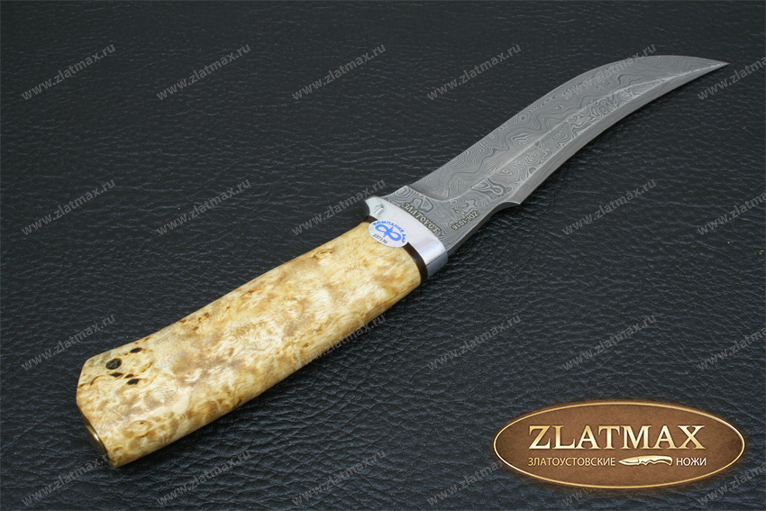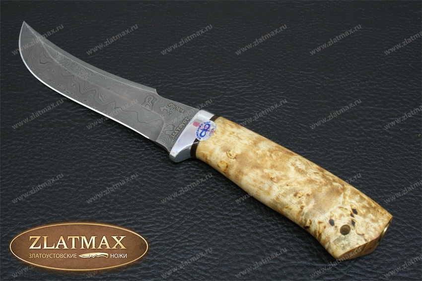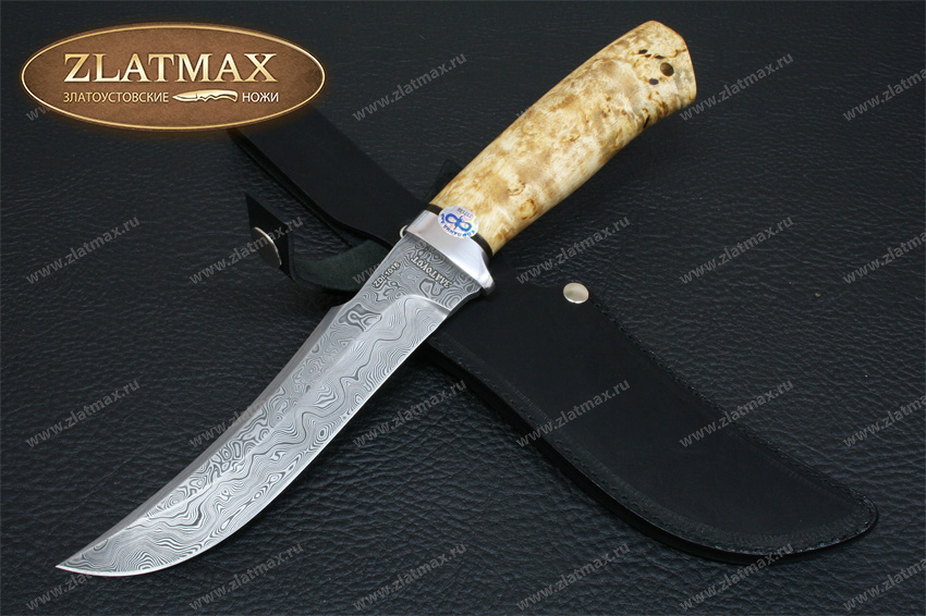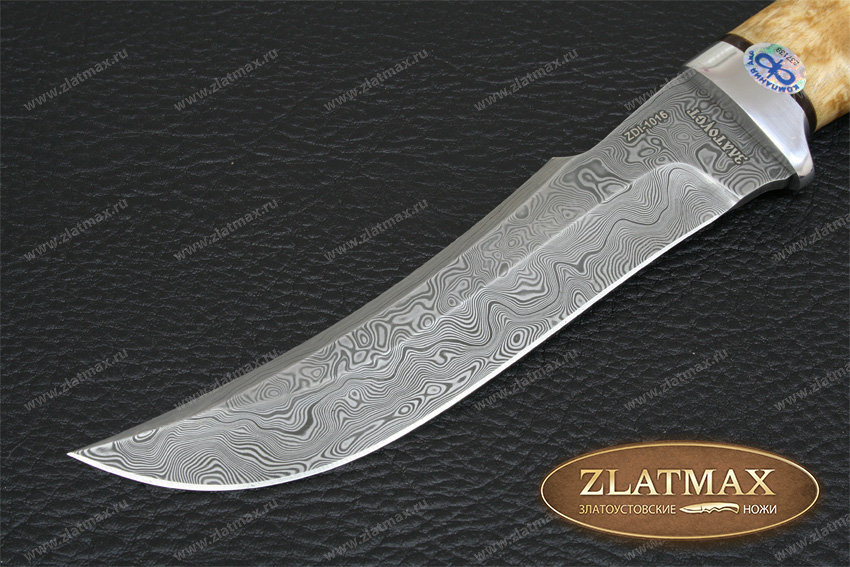 Нож подкупает покупателей своим хищным клинком, откуда и получил название «Клык». Орудие универсальное, в то же время крупное и прочное, выполненное в восточном стиле ятагана с вогнутыми спусками. Не смотря на свою тонкость, лезвие имеет отличные режущие качества, демонстрирующиеся при использовании. Благодаря прогнутому фальшлезвию на ¾ длины клинка с толщиной обуха в 3,7 мм., инструмент может быть использован в процессе рубки костной части и хрящей туши. Полноценная форма рукояти и имеющаяся гарда ножа подходит для любого размера ладони, почему и уверенно ложиться в нее и не соскальзывает. Так же есть отверстие под темляк, а не разборный монтаж придает инструменту особую прочность. Используется для многих видов работ, в том числе и в лесу.