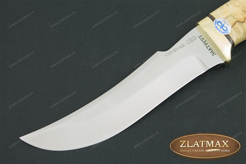 Нож подкупает покупателей своим хищным клинком, откуда и получил название «Клык». Орудие универсальное, в то же время крупное и прочное, выполненное в восточном стиле ятагана с вогнутыми спусками. Не смотря на свою тонкость, лезвие имеет отличные режущие качества, демонстрирующиеся при использовании. Благодаря прогнутому фальшлезвию на ¾ длины клинка с толщиной обуха в 3,7 мм., инструмент может быть использован в процессе рубки костной части и хрящей туши. Полноценная форма рукояти и имеющаяся гарда ножа подходит для любого размера ладони, почему и уверенно ложиться в нее и не соскальзывает. Так же есть отверстие под темляк, а не разборный монтаж придает инструменту особую прочность. Используется для многих видов работ, в том числе и в лесу.