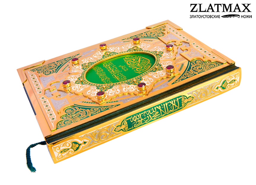 Оклад для Корана выполнен в традиционной технике Златоустовской гравюры на металле. Украшен орнаментом, который выполнен в восточном стиле.