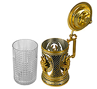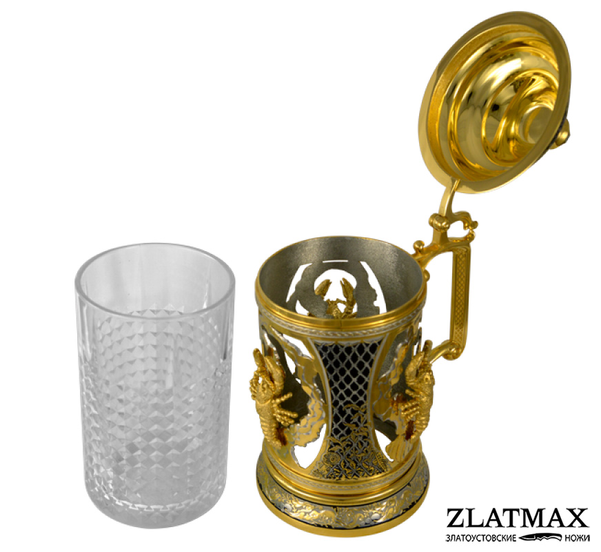 Изделие выполнено в традиционной технике Златоустовской гравюры на металле. Кружка изготовлена из латуни. Корпус кружки цилиндрический, имеет три просечных картуша и декорирован тремя литыми раками. Крышка куполообразная, объёмная, фигурная. Рукоять литая из латуни. Пивной бокал изготовлен из хрусталя.