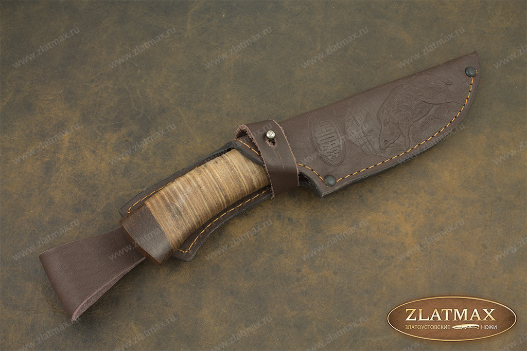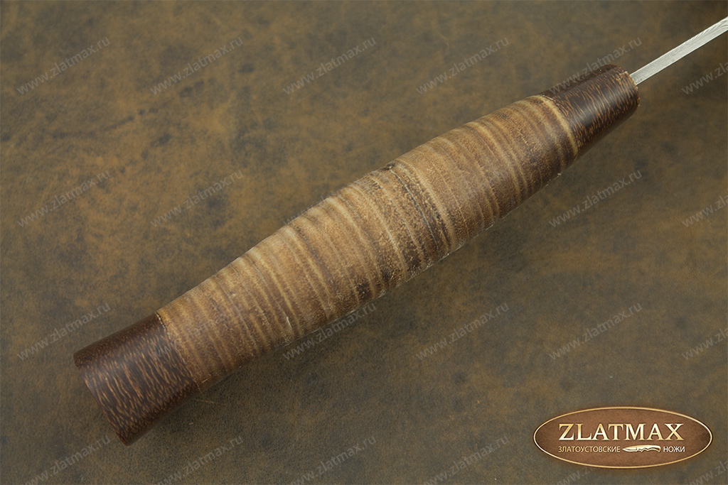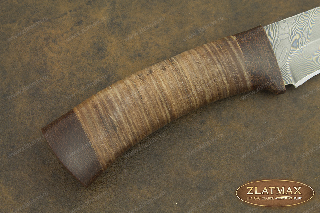 Наборная кожа - представляет из себя склеенные кожаные полоски. Из них получаются приятные на ощупь, теплые, удобные в руке рукояти для ножей. Такое изделие будет теплым даже при минусовой температуре, однако в условиях высокой влажности кожа мокнет, потребуется время, чтобы ее высушить.
