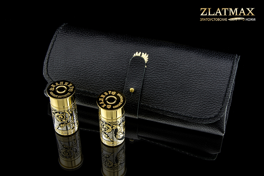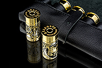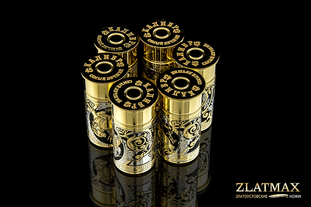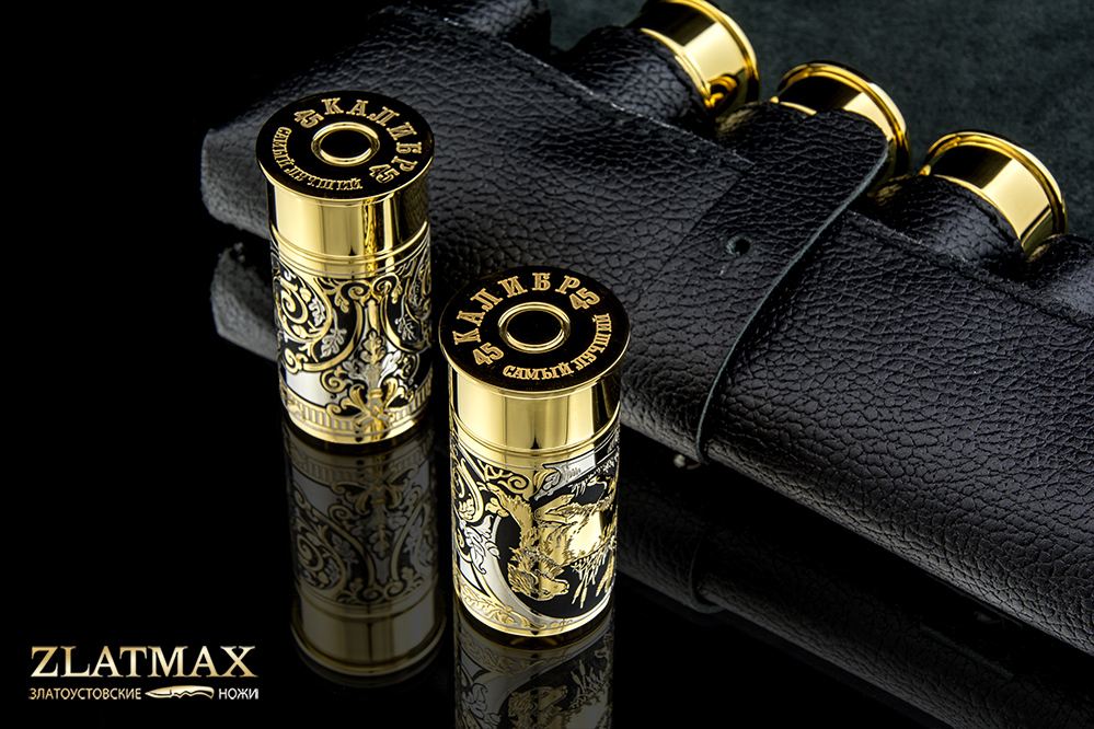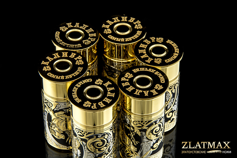 Набор включает в себя 6 латунных стопок, стилизованные под ружейную гильзу 45 калибра (объем глотка взрослого человека), украшенные изображением животных и растительным орнаментом.