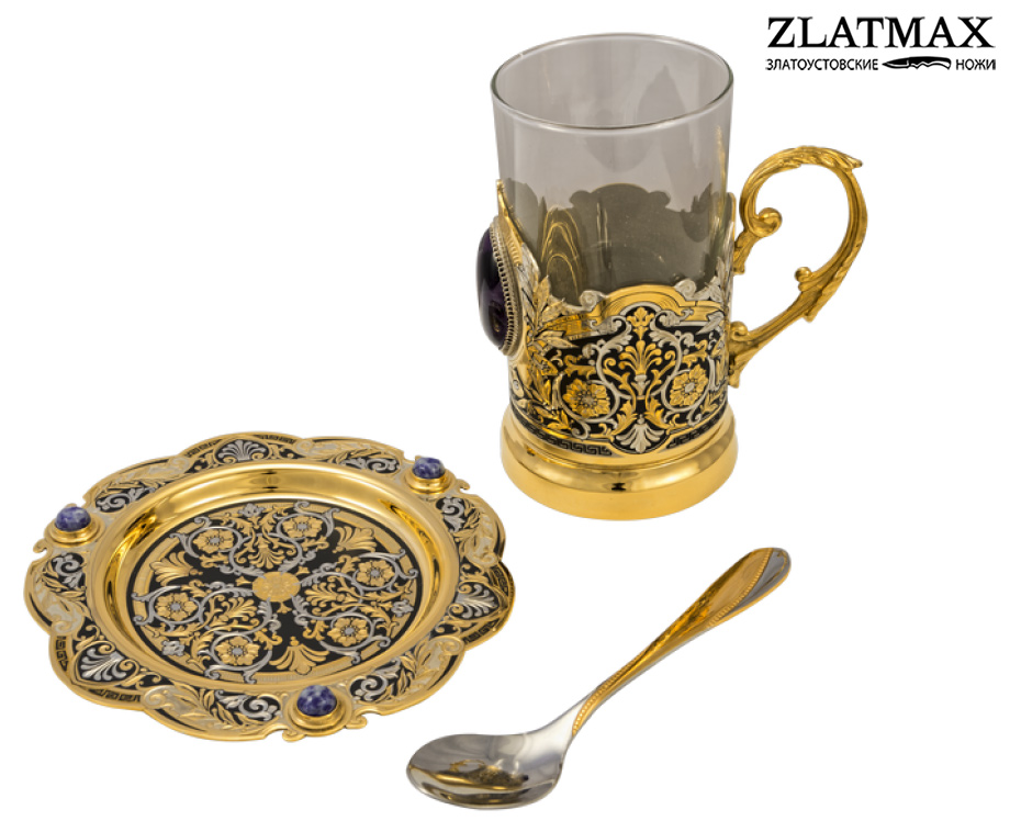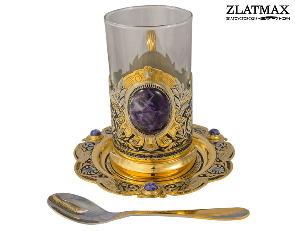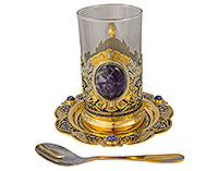 В состав чайного набора входит: хрустальный стакан, боковые грани которого украшены искусным узором; подстаканника и ажурного блюдца, которые инкрустированы кабошонами из аметиста.