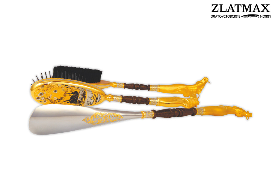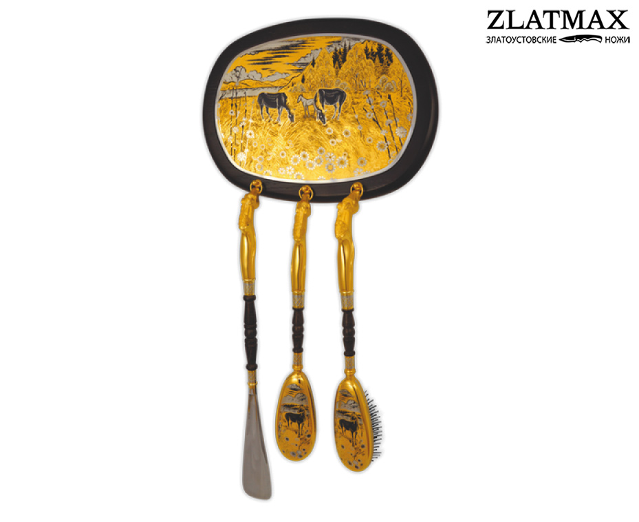 Самое первое помещение с которого начинается и заканчивается любая квартира – это прихожая. Прихожая не только встречает нас, но и первой предлагает ощутить теплоту и домашний уют. Основным назначением прихожей является возможность в удобной обстановке снять или надеть обувь и верхнею одежду. Для ухода за обувью предлагаем Вам приобрести набор для прихожей «Лошади на лугу». Украшенный набор для прихожей выполнен Златоустовскими мастерами гравюры в традиционной технике. Набор состоит из: панно для размещения предметов набора, украшенное гравюрой с анималистической сценой из дикой природы. Панно снабжено петлей, позволяющей закрепить набор на стене; рожок или ложка для обуви на длинной рукояти; овальная щетка для удаления загрязнений с одежды; расческа для ухода за обувью. Каждый инструмент набора для прихожей декорирован рукоятью, выполненной в форме головы лошади. Декоративные накладки щетки и расчески оформлены гравюрным рисунком, перекликающимся с основной композицией панно. В каждом элементе набора, включая панно, присутствуют вставки из натуральной сосны. Применены декоративные операции: Рисовка кистью Гравировка иглой Гравировка резцом Чернение латуни Литьё Слесарные работы