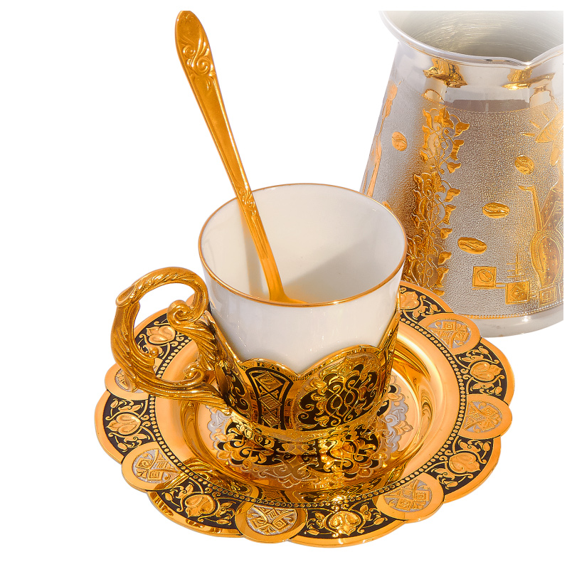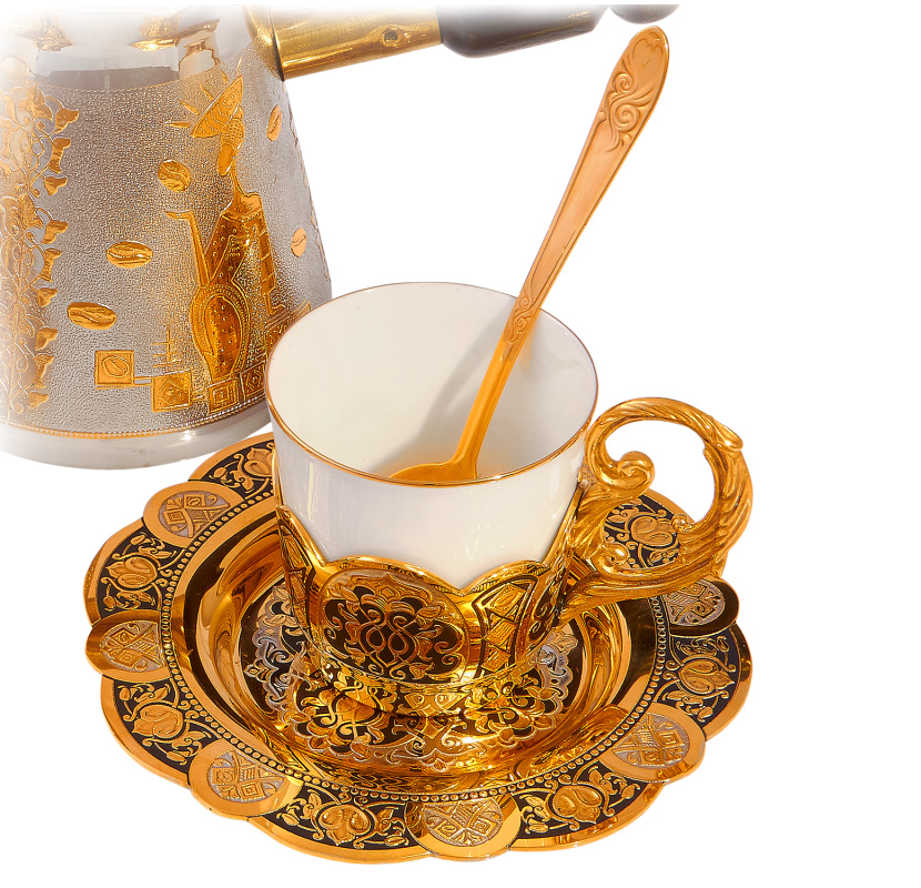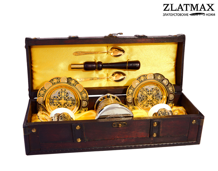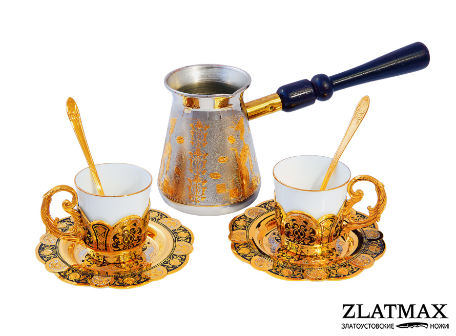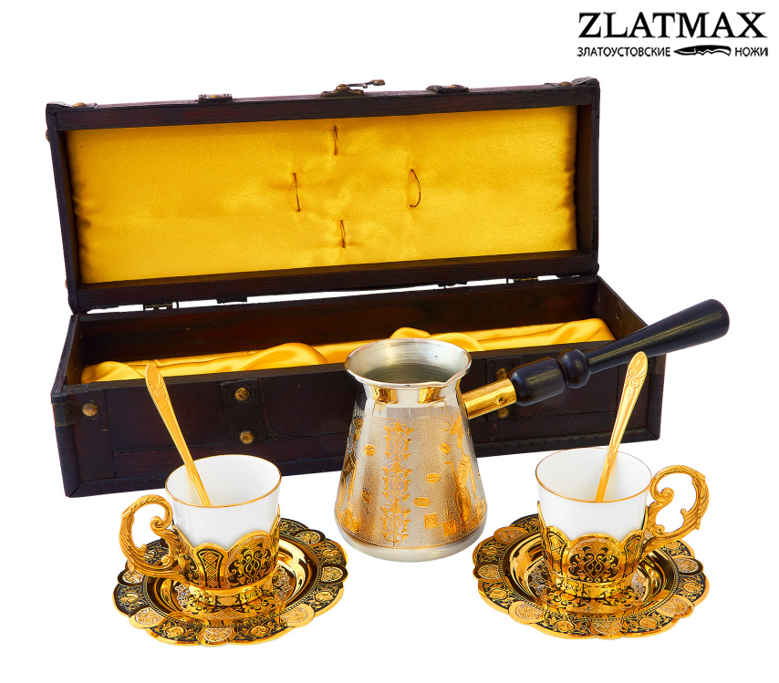 Изделие выполнено в традиционной технике Златоустовской гравюры на металле. В набор входят: две фарфоровые чашечки, размещенные в фигурном латунном подстаканнике; две ложечки изготовленные из пищевой нержавеющей стали; два блюдца с фигурным краем диаметром 115 мм; турка, изготовленная из меди; подарочная коробка в виде морского сундучка. Применены декоративные операции: Токарные и слесарные работы; Рисовка кистью; Гравировка иглой по лаку; Гравировка штихелем; Слесарные работы; Травление; Никелирование; Золочение; Эмалирование.