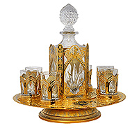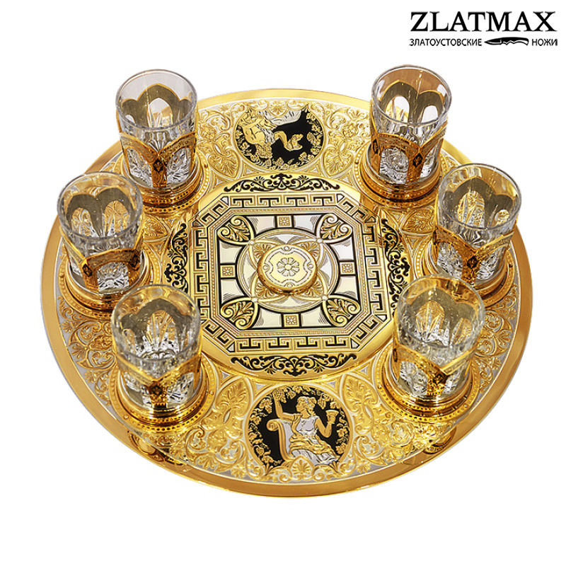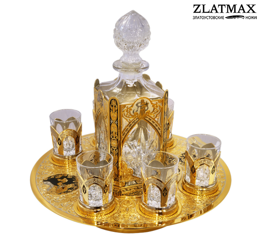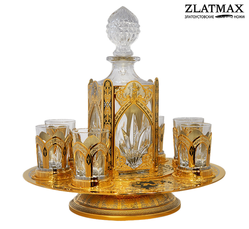 Коньячный набор "Бахус" Изделие выполнено в традиционной технике Златоустовской гравюры на металле. Коньячный набор представляет собой композицию из центрального подноса (диаметр 287 мм), графина и шести стопок из хрусталя. Каждый элемент набора украшен тематическим орнаментом.