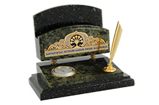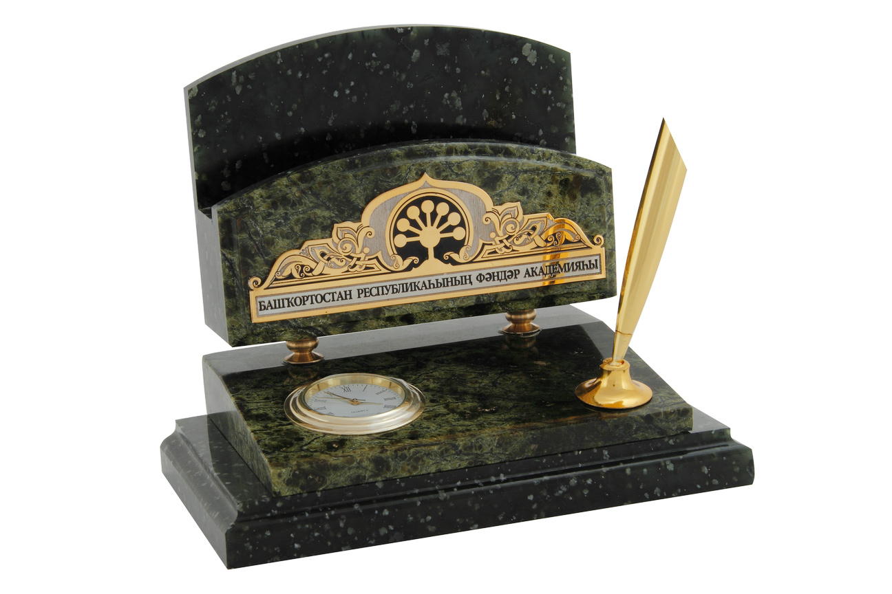 Набор изготовлен из натурального поделочного камня, имеет отделение для визиток, которое украшено латунной накладкой с традиционным орнаментом и символикой Республики Башкортостан, встроенные часы и подставку для шариковой ручки.