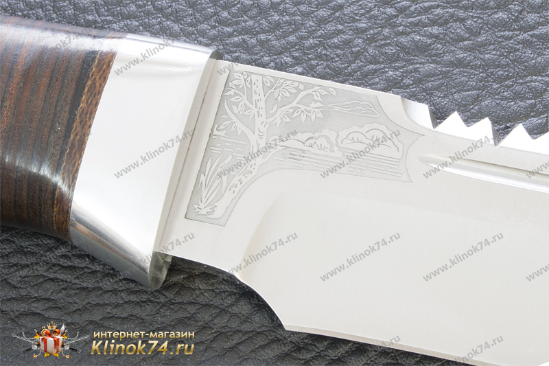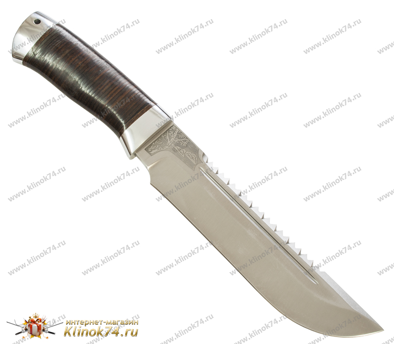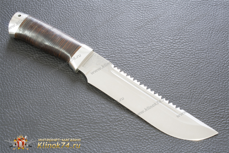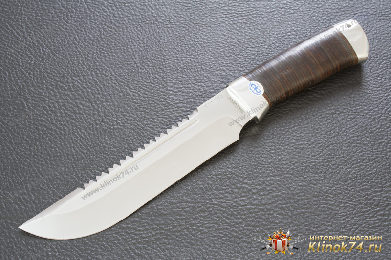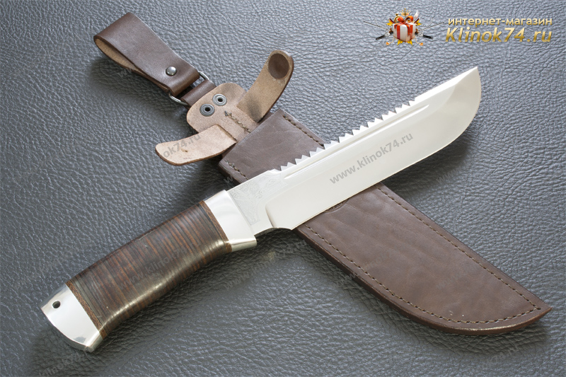 Внушительный нож с огромным клинком классической формы, с толщиной обуха 5 мм. Долы на голомени клинка придают ему дополнительную жесткость. По обуху клинка выведена пила, которая может быть использована для надпилки рогов и костей. Вогнутые линзовидные спуски образуют тонкое, хорошо режущее лезвие толщиной около 0,7 мм в районе подводов. Рукоять большая, удобной для рубки формы, имеет на навершии отверстие для темляка. Монтаж рукояти сквозной, неразборный. Небольшая подпальцевая выемка не дает соскользнуть руке при резах от себя. Этот нож хорош для рубки веток под колеса застрявшей машины и при обустройстве стоянки.