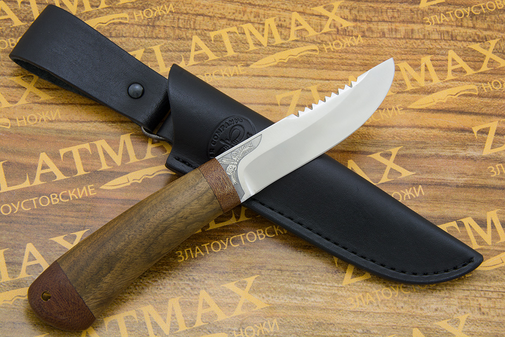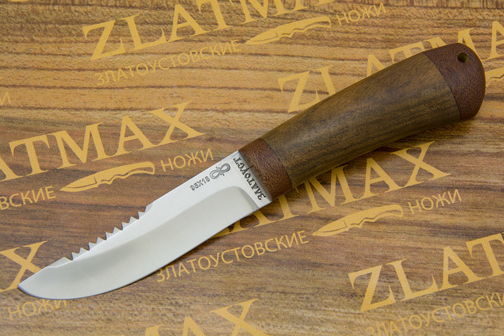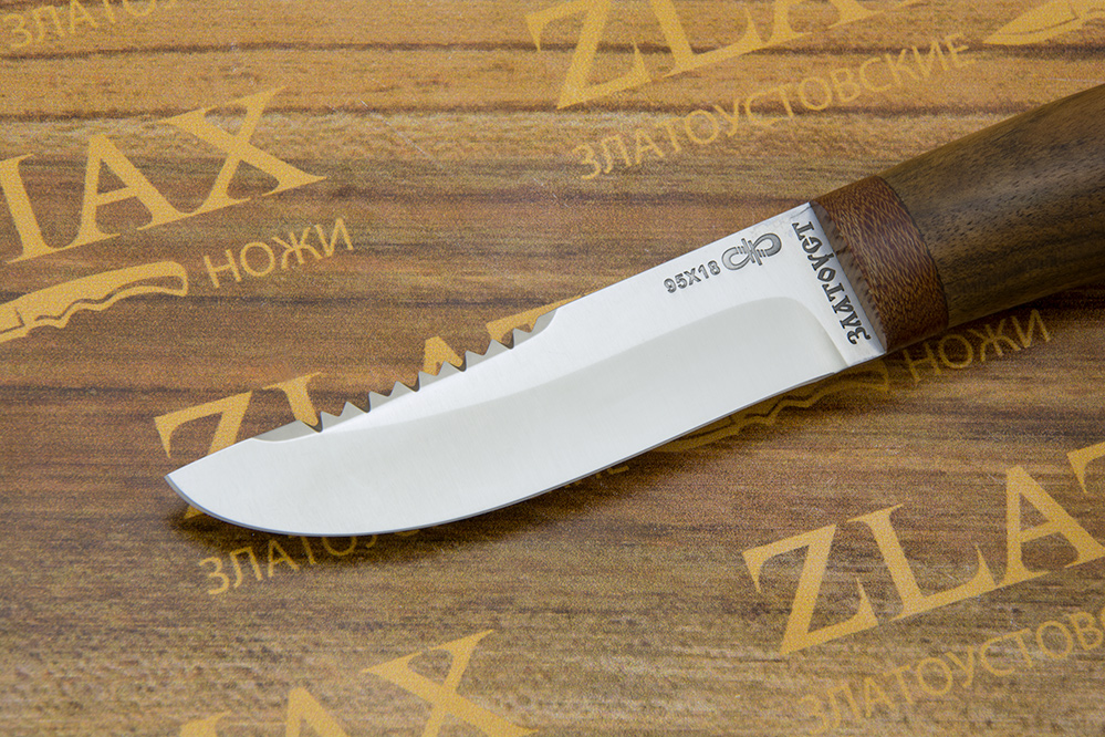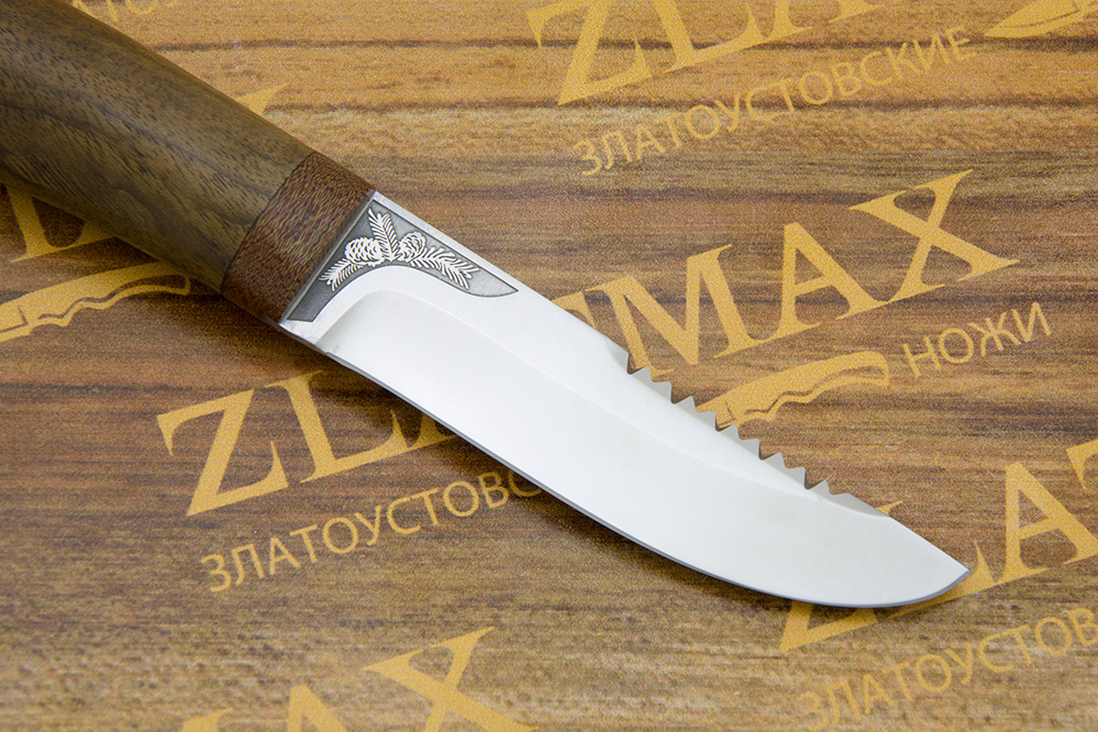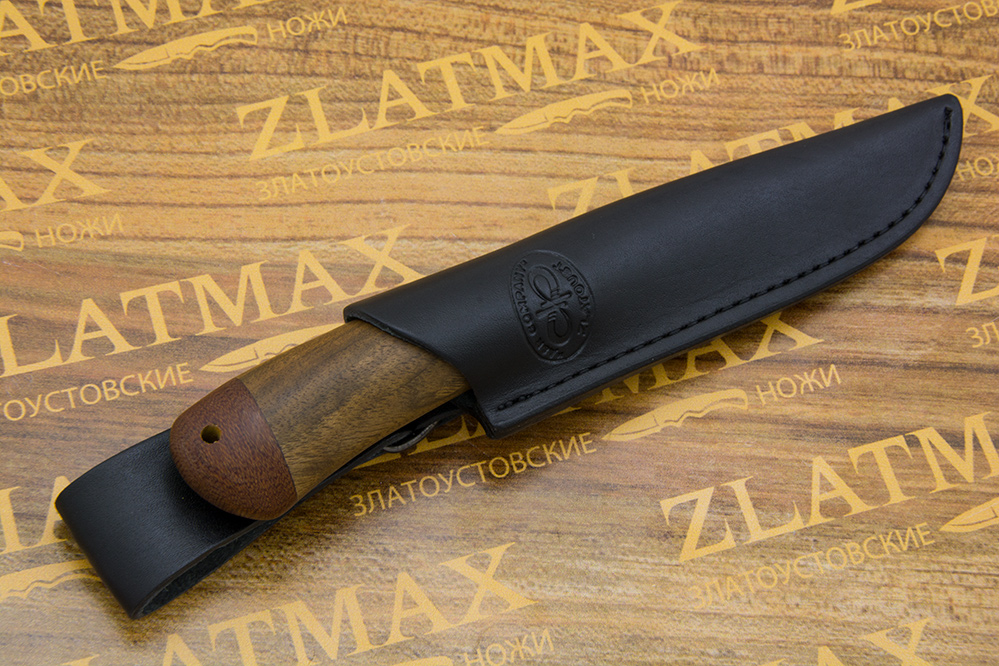 Небольшой универсальный, очень легкий и прочный нож с изящным клинком классической формы. Клинок имеет пологие вогнутые линзовидные спуски от середины ширины клинка. При толщине обуха в 2,1 мм имеет широкие спуски, что придает ему великолепные режущие свойства. Однако, необходимо проявлять некоторую осторожность при работе с большими боковыми нагрузками на лезвие ножа, ввиду небольшой толщины клинка в рабочей части. Хороший нож для коротких прогулок в лес, на пикник или за грибами. Монтаж рукояти сквозной, неразборный. На навершии рукояти имеется отверстие под темляк. Форма клинка и отсутствие гарды делает этот нож хорошим помощником при работе с продуктами, разделке боровой и водоплавающей птицы, мелкого пушного зверя, чистке рыбы. Хорош как вспомогательный нож к основному рабочему ножу.