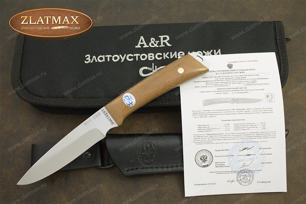 Нож Снегирь является ножом разделочным и не относится к гражданскому холодному оружию. Соответствует требованиям ГОСТ Р 51644-2000 «Ножи разделочные и шкуросъемные. Общие технические условия».