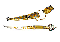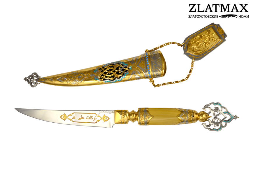 Купить величественный нож - символ власти шаха - подарить виновнику торжества веру в силы на поприще бизнеса. Изготавливаемые Златоустовскими мастерами эксклюзивные ножи ручной работы идеально подходят для дарения руководителям и предпринимателям, имеющим интерес в странах востока. Нож изготовлен из латуни, богато украшен традиционным восточным орнаментом и инкрустирован фианитами. Ножна выполнена в сложной ажурной технике, на ней имеется надпись: "О, сердце! Ради одной души не оказывай благодеяние всем душам". Клинок металлический с надписью: "Я положился на Аллаха!" Применены декоративные операции: Рисовка кистью Гравировка иглой и резцом Инкрустация