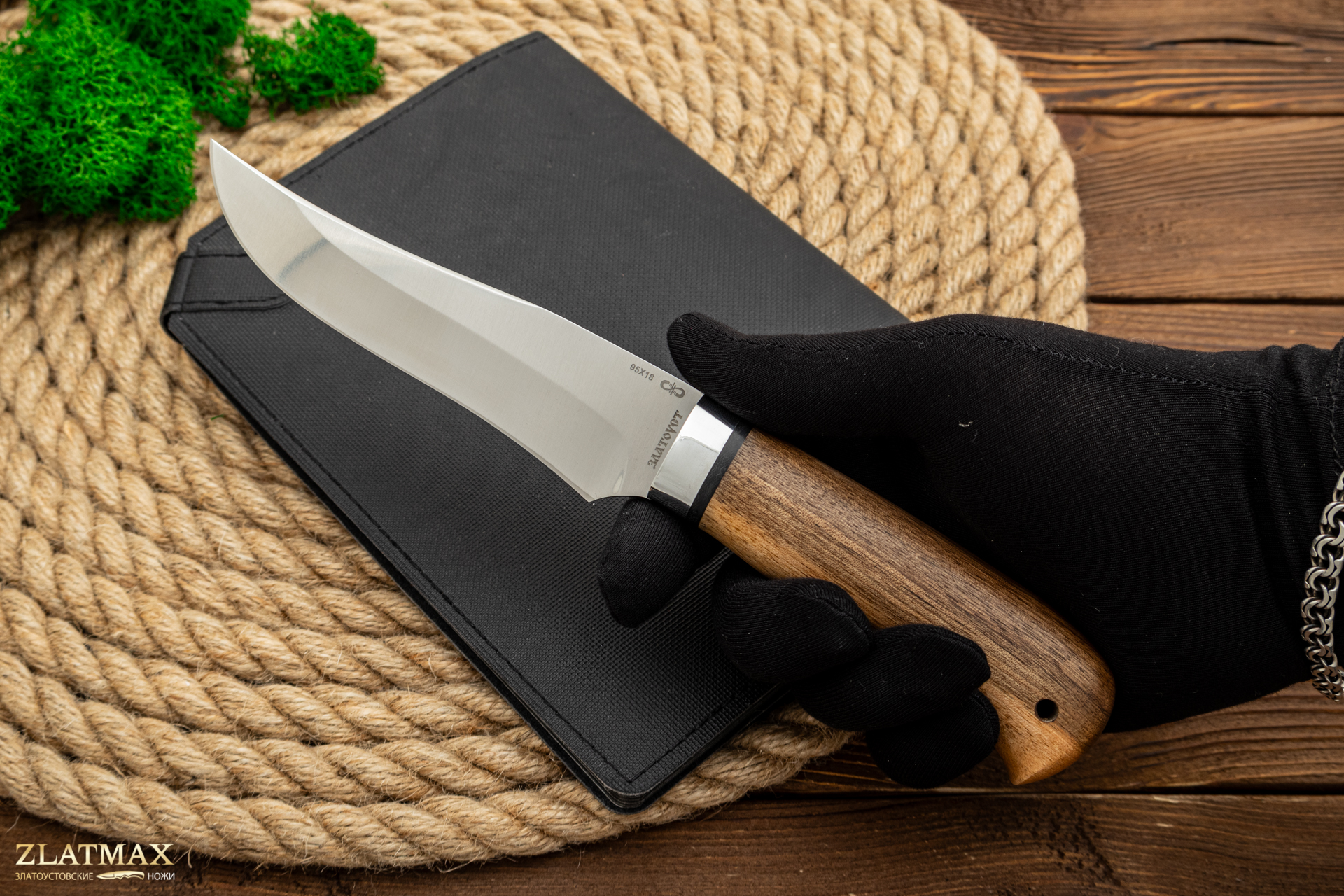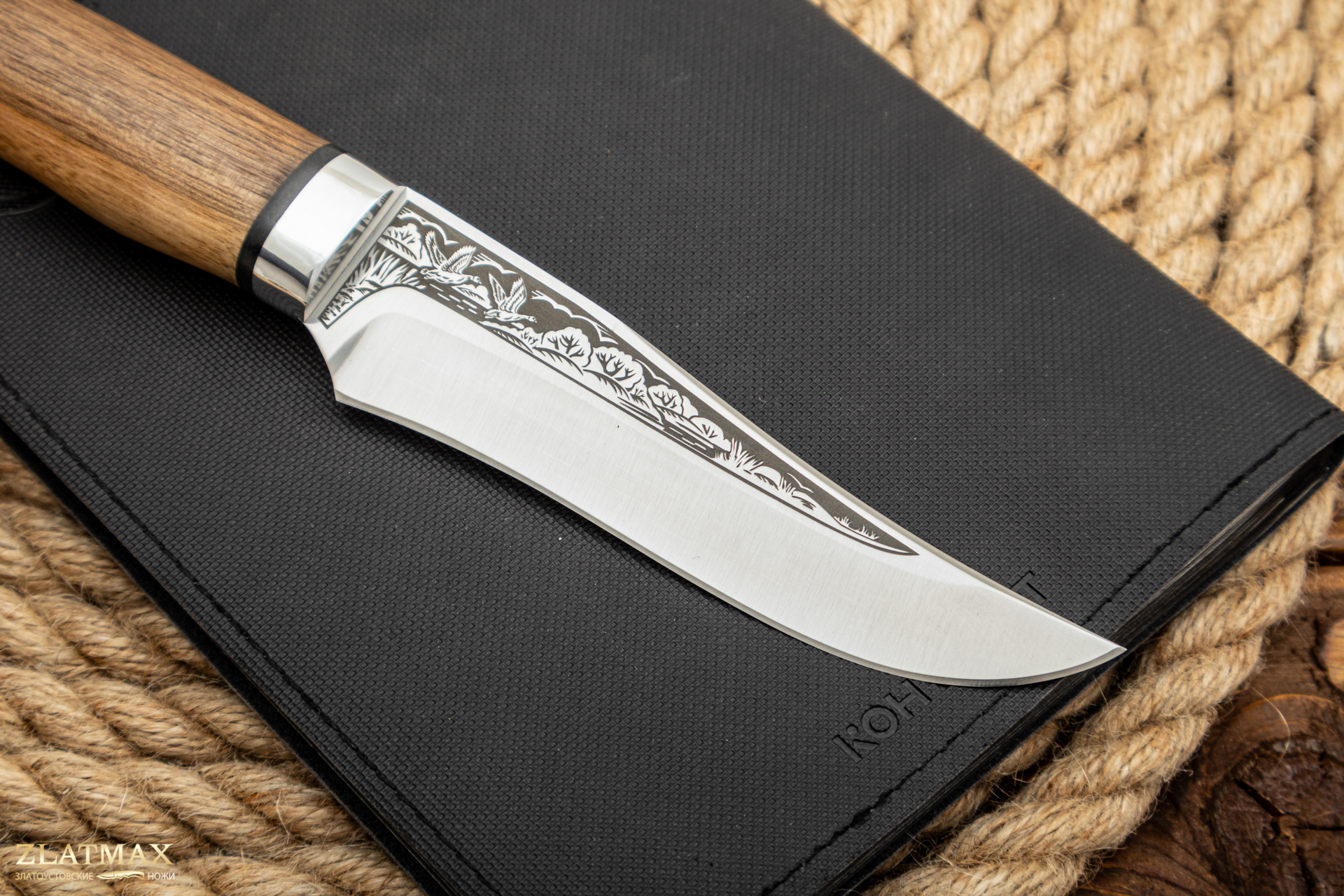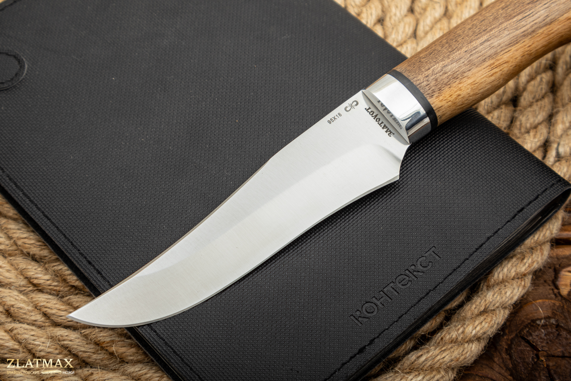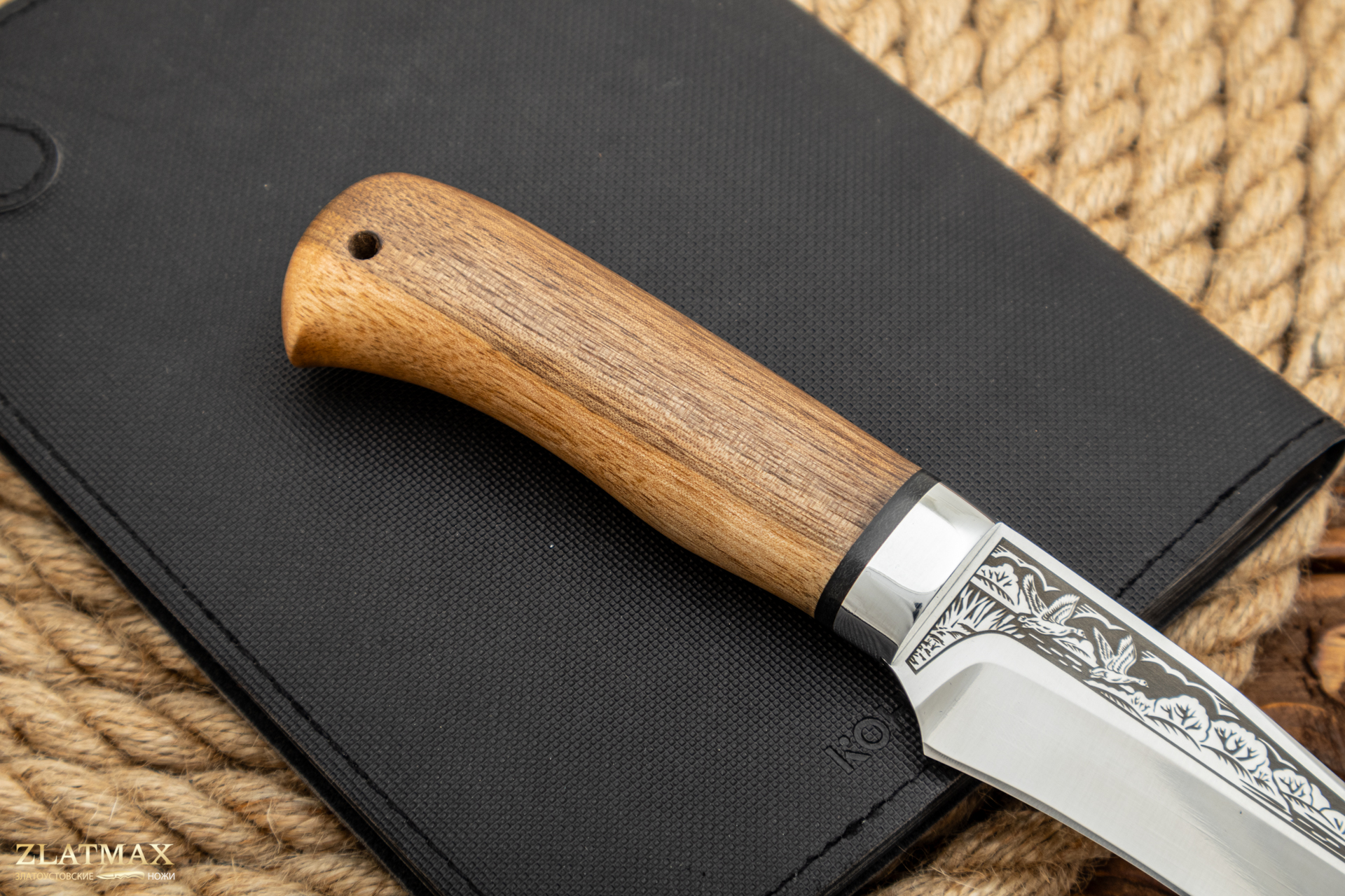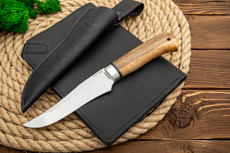 Небольшой универсальный, легкий и прочный нож с клинком ятаганной формы, имеющим вогнутые линзовидные спуски от середины ширины клинка. Клинок с толщиной обуха в 3 мм имеет широкую голомень, что придает ему дополнительную прочность. Удобная форма рукояти позволяет уверенно работать ножом. А пята клинка, заменяющая упор, не дает соскользнуть пальцам при резах от себя. Монтаж рукояти всадной, неразборный. Хороший выбор для большинства видов работы в лесу.