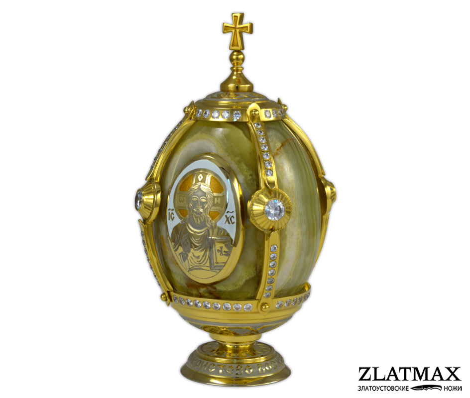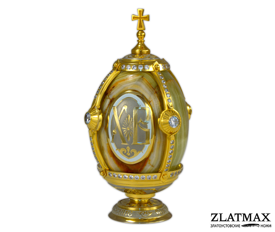 Изделие изготовлено в традиционной технике Златоустовской гравюры на металле. Выполнено из латуни и инкрустировано фианитами. Изделие украшено в православной тематике растительным орнаментом и надписью: "Светлое Христово Воскресение!" Применены декоративные операции: Рисовка кистью Гравировка иглой и резцом Травление Никелирование Золочение Инкрустация