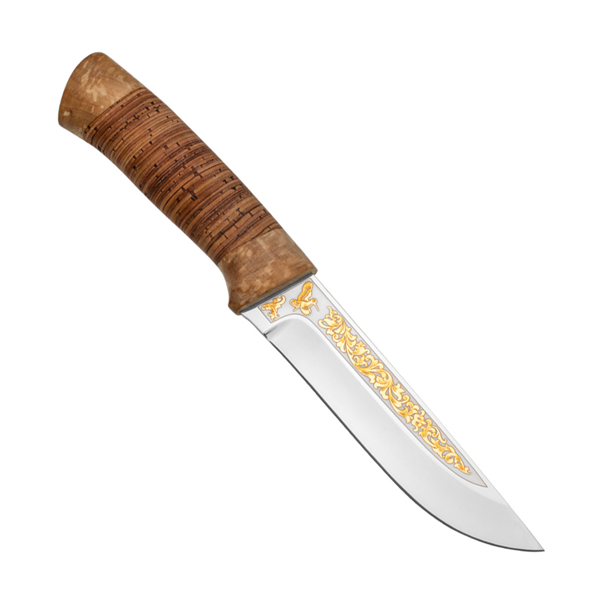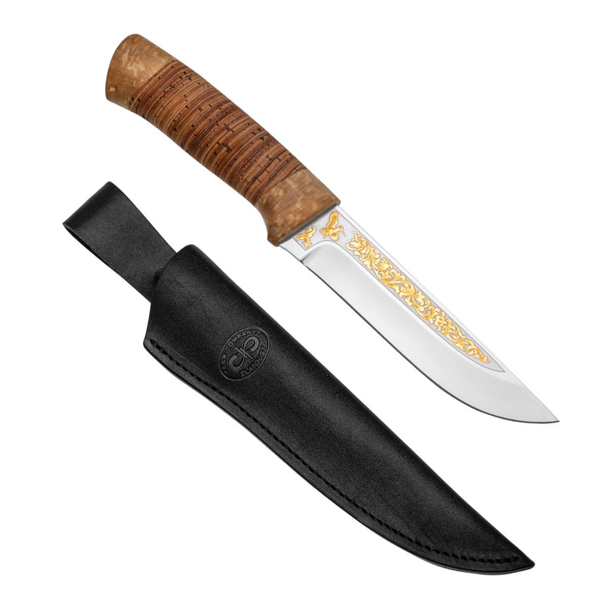 На клинке ножа методом травления, золочения, гравировки нанесен орнамент или рисунок на природные и охотничьи темы. Нож, украшенный златоустовскими узорами, – вполне функциональный инструмент, а не сувенирное изделие. Даже при частом использовании в быту или в дороге, он сохранит свои режущие свойства, и с золотым покрытием на клинке ничего не случится. Это связано с особой техникой нанесения золотого узора – он наносится гальваническим методом на глубину 1 мкм, благодаря чему рисунок не сотрется.