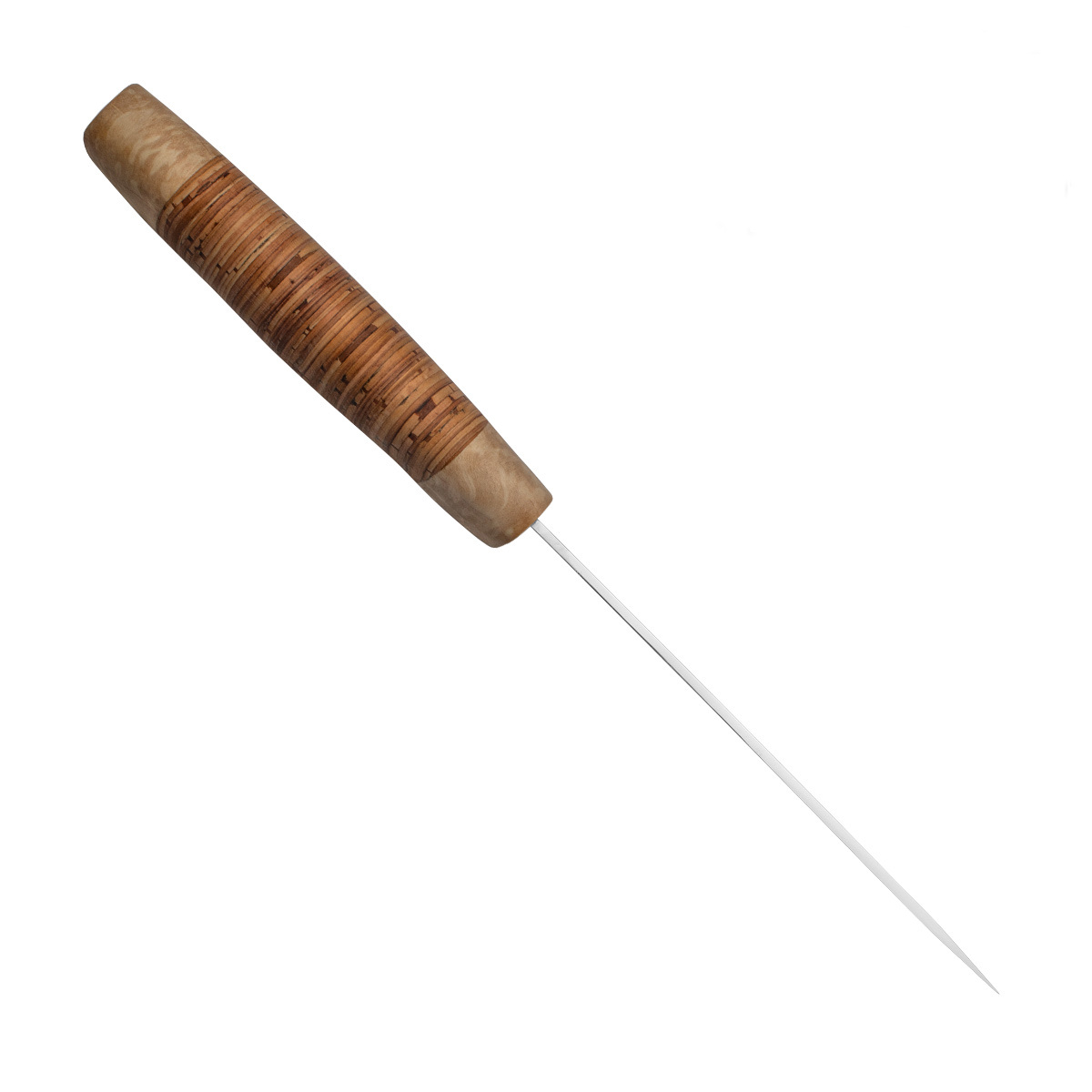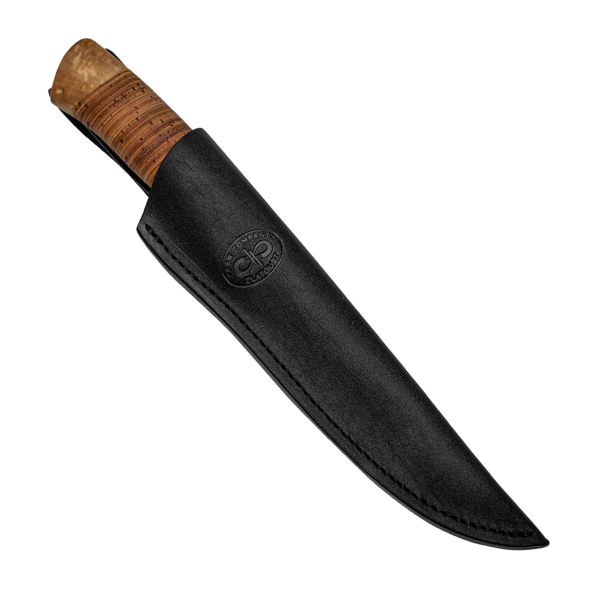 Небольшой универсальный, легкий и прочный нож классической формы с нешироким клинком, имеющим вогнутые линзовидные спуски, образующие тонкое, прекрасно режущее лезвие. Демонстрирует отличные режущие качества. Поэтому в умелых руках становится весьма серьезным инструментом. Клинок с толщиной обуха в 2,4 мм имеет узкие долы с обеих сторон, что придает ему дополнительную прочность. Классическая форма рукояти подкупает: она удобна даже для большой руки, уверенно и прочно ложится в любую ладонь. А оптимальной величины гарда не дает соскользнуть пальцам при резах от себя. Монтаж клинка сквозной, неразборный. Отличный выбор для большинства видов работы в лесу. Пользуется неизменной популярностью у покупателей.