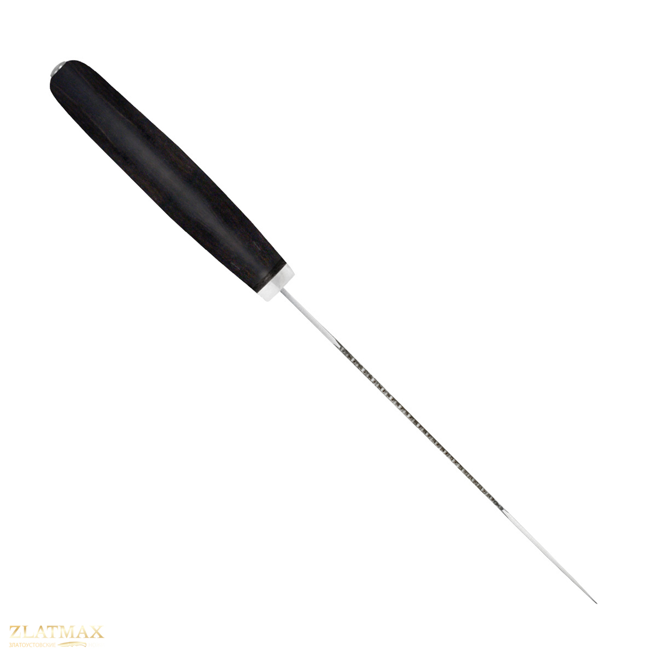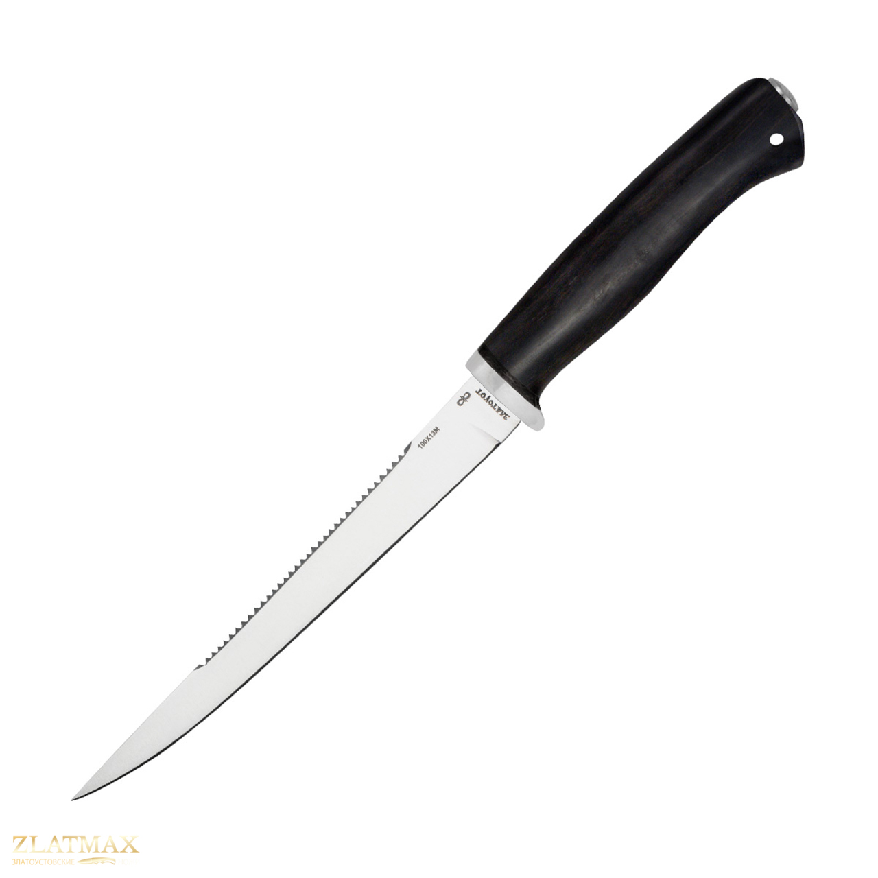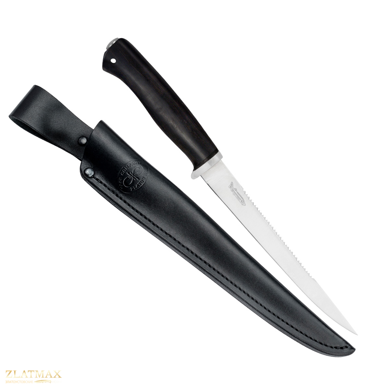 Большой разделочный нож для крупной рыбы с узким клинком и пилообразной заточкой на обухе для чистки чешуи. Клинок толщиной 2 мм имеет прямые спуски, образующие тонкое, прекрасно режущее лезвие. Классическая форма рукояти уверенно и прочно лежит в любой ладони. А оптимальной величины гарда не дает соскользнуть пальцам при резах от себя. Монтаж рукояти сквозной, неразборный. Отличный выбор для разделки крупной рыбы.