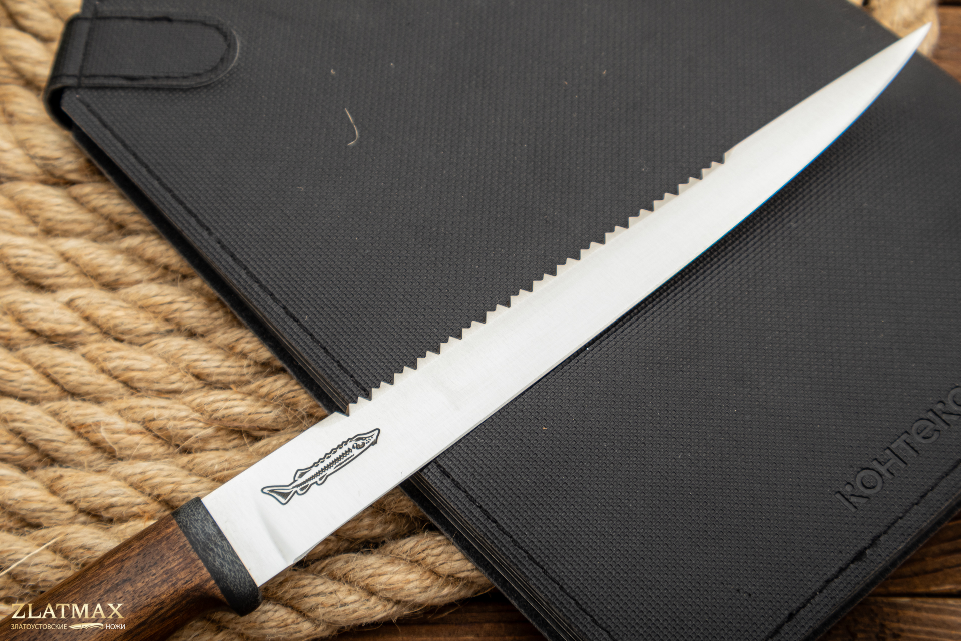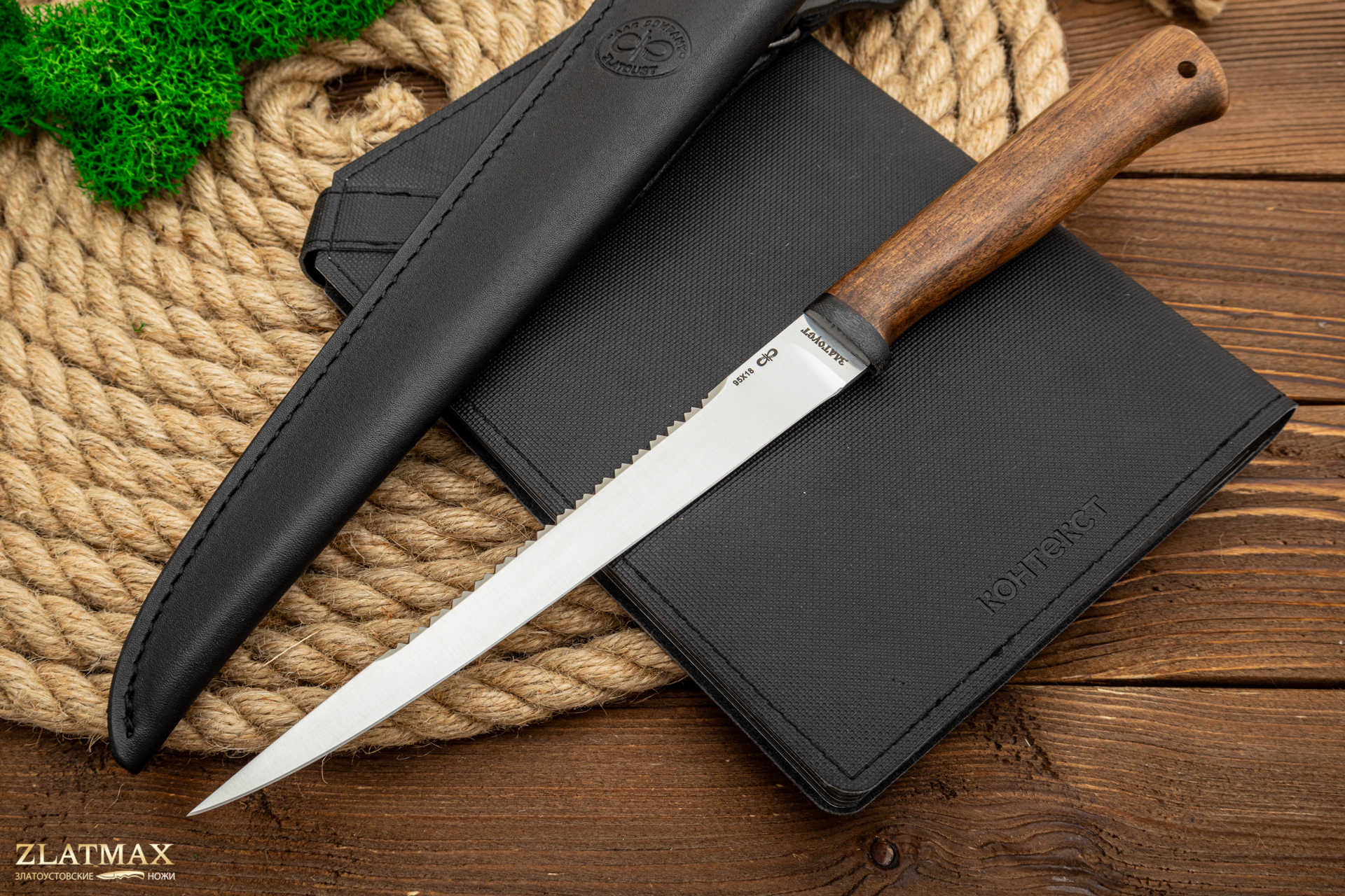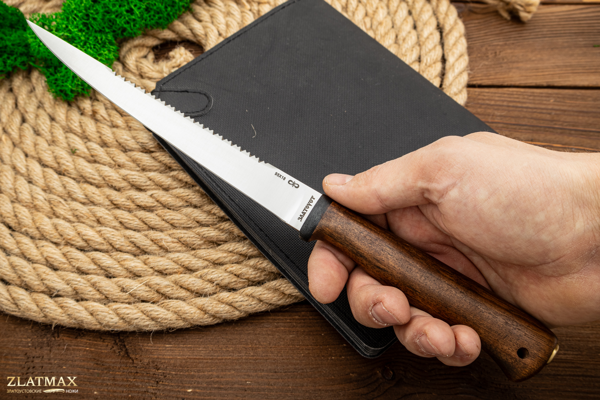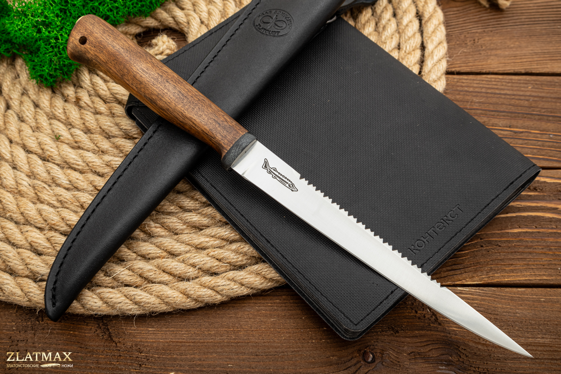 Большой разделочный нож для крупной рыбы с узким клинком и пилообразной заточкой на обухе для чистки чешуи. Клинок толщиной 2 мм имеет прямые спуски, образующие тонкое, прекрасно режущее лезвие. Классическая форма рукояти уверенно и прочно лежит в любой ладони. А оптимальной величины гарда не дает соскользнуть пальцам при резах от себя. Монтаж рукояти сквозной, неразборный. Отличный выбор для разделки крупной рыбы.