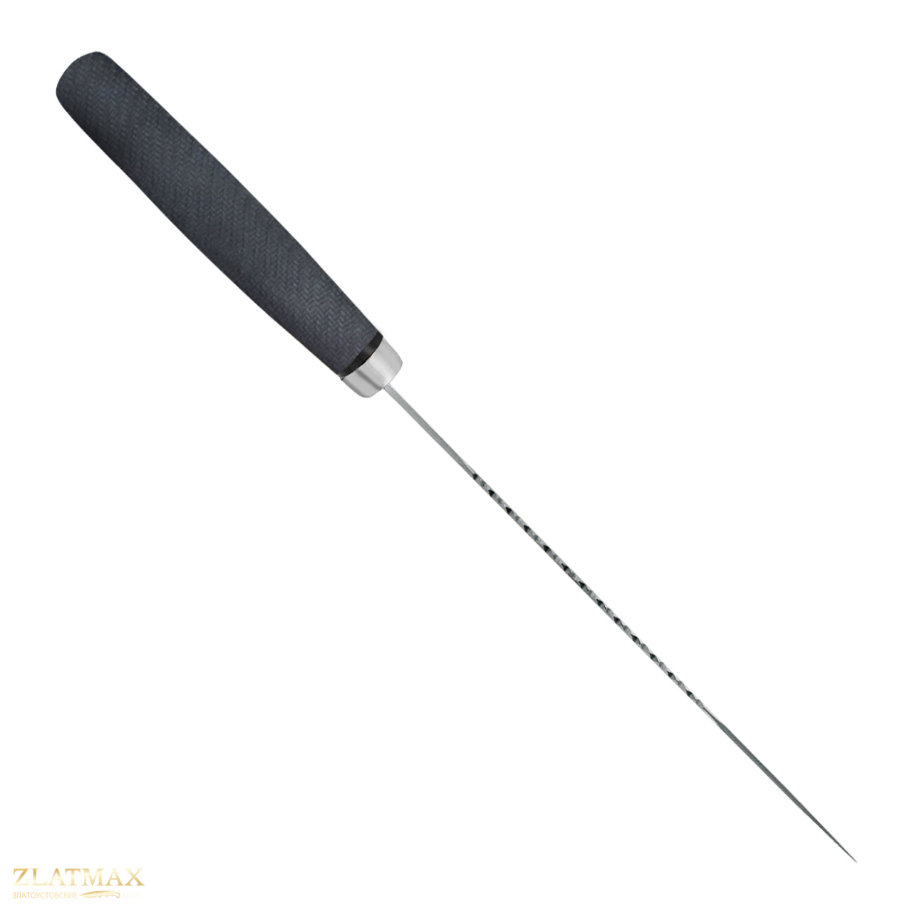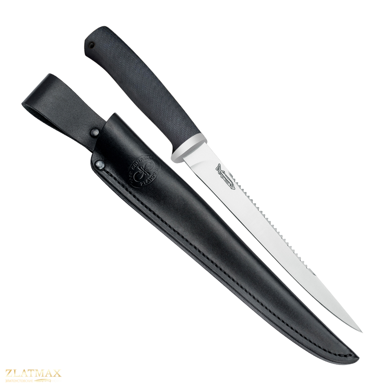 Большой разделочный нож для крупной рыбы с узким клинком и пилообразной заточкой на обухе для чистки чешуи. Клинок толщиной 2 мм имеет прямые спуски, образующие тонкое, прекрасно режущее лезвие. Классическая форма рукояти уверенно и прочно лежит в любой ладони. А оптимальной величины гарда не дает соскользнуть пальцам при резах от себя. Монтаж рукояти сквозной, неразборный. Отличный выбор для разделки крупной рыбы.