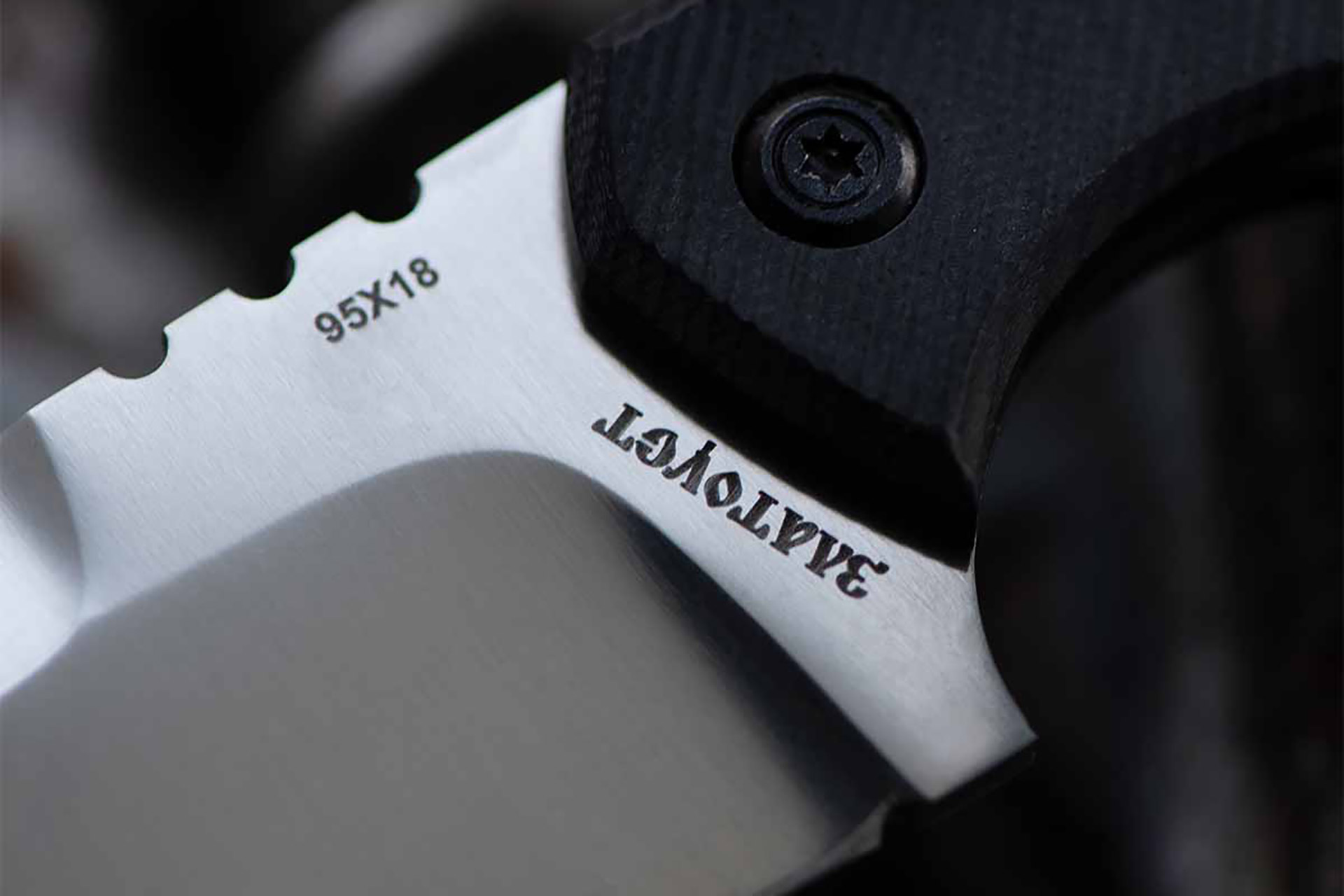 • 95Х18 - это без преувеличения лучшая сталь российского производства, а потому она пользуется огромной популярностью у отечественных и зарубежных компаний. При правильном изготовлении металл получает отличную твердость, гибкость и прочность. Ножи из этого материала служат, как правило, не один год. И при этом могут выглядеть так, как будто были сделаны только вчера. Но надо только стараться избегать попадания на лезвие соли и долгое воздействие влаги. Единственный минус – клинок из такой стали очень сложно заточить. Придется потратить много сил или даже воспользоваться специальными устройствами. Но зато хорошую заточку ножи держат достаточно долго.