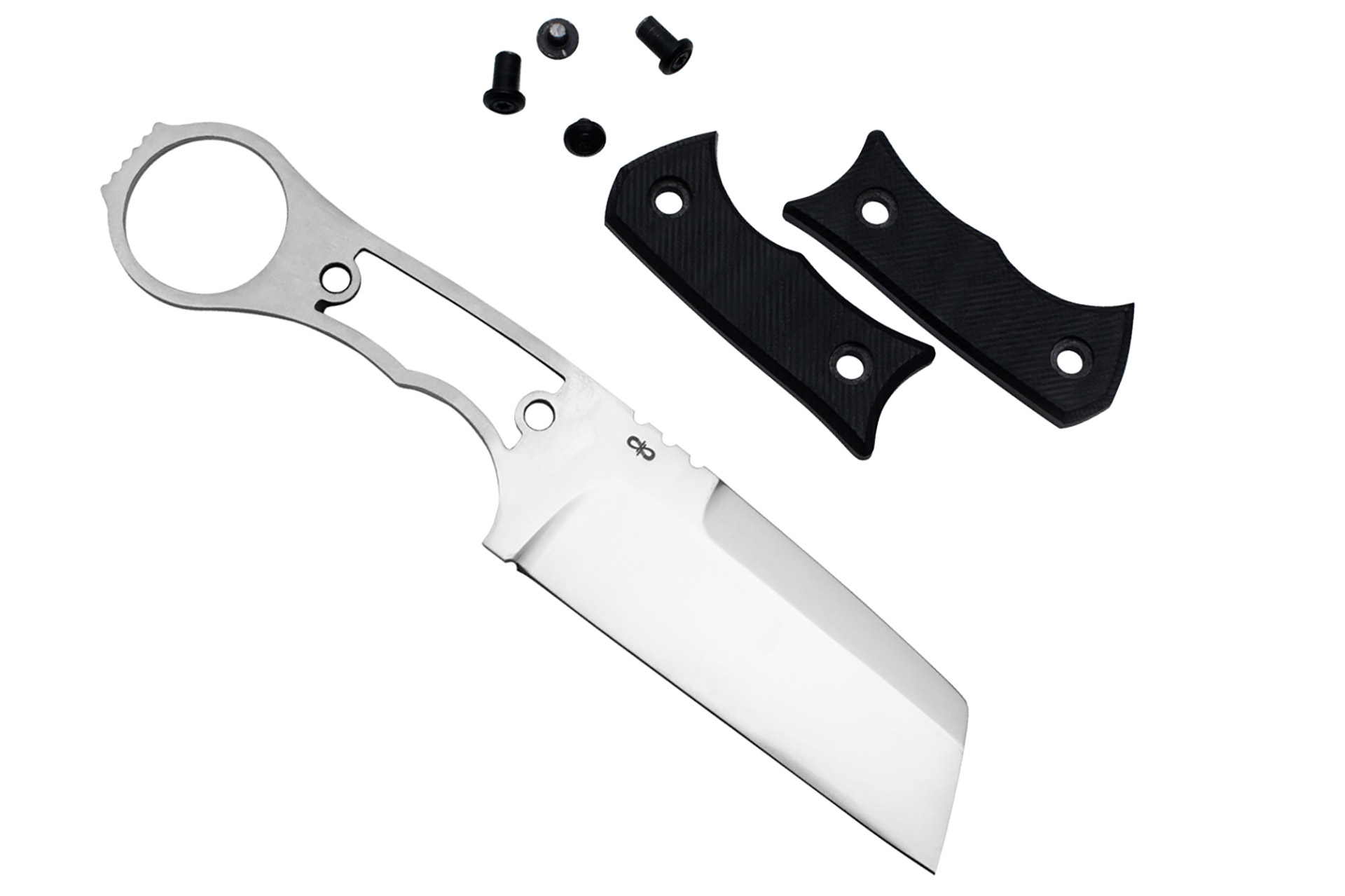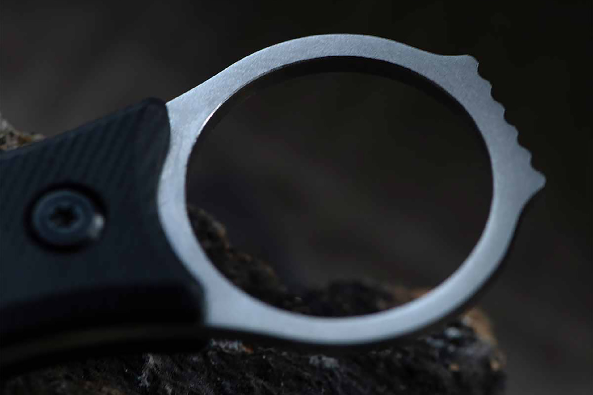 Тип профиля клинка Sheepsfoot Blade (sheep – овца, т.е. клинок в форме овечьего копыта) обеспечивает ножу неагрессивный кончик и безопасное использование, к примеру, в спасательных операциях. За счет выборки металла на клинке существенно уменьшена масса ножа. На ближней к рукояти части обуха имеются насечки под большой палец, чтобы не скользил при интенсивной работе. Хвостовик ножа имеет отверстие большого диаметра, оно служит для более удобного извлечения из ножен и более крепкого удержания в руке. С отверстием в тыльной части нож надежно фиксируется пальцем при прямом и обратном хвате, его практически невозможно выбить из руки. Насечки на тыльной части отверстия могут служить стеклоколом.