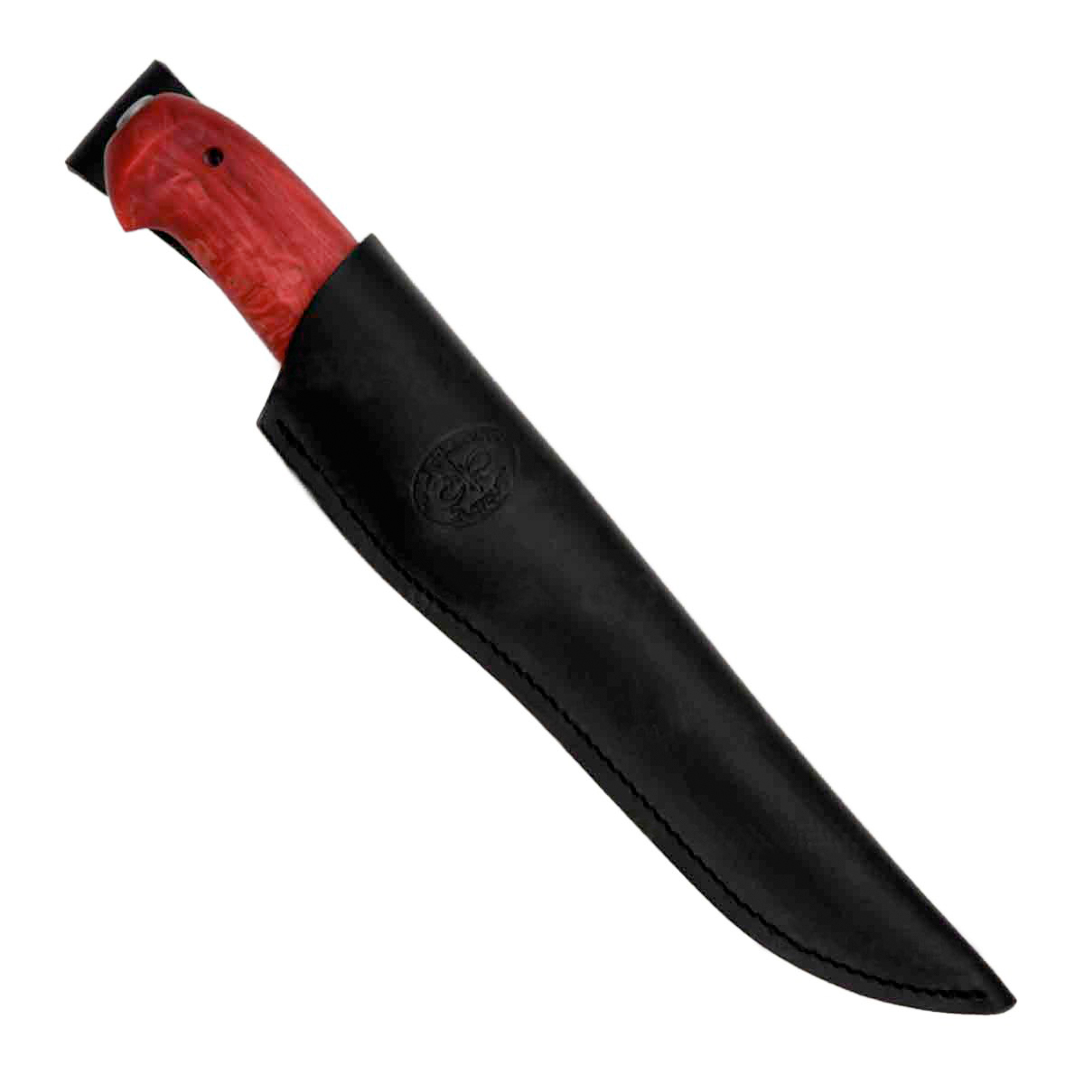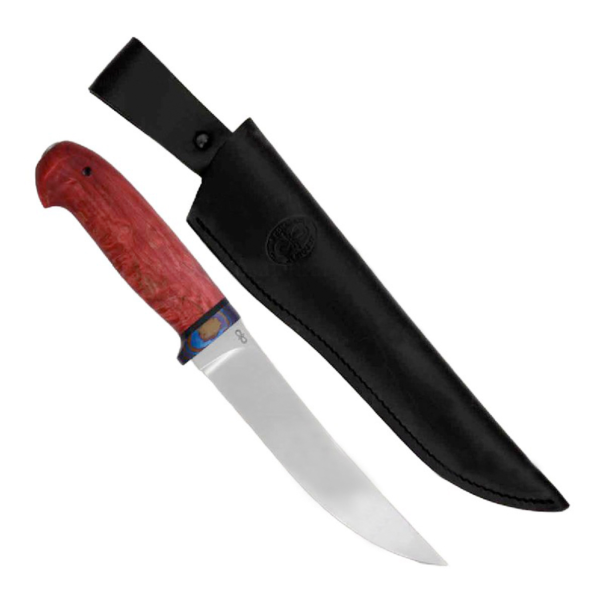 Очень легкий нож с формой клинка trailing-point – с повышением линии обуха. У клинка такого типа наибольшая длина лезвия, что удобно при нарезании нетвердых материалов. Прямые спуски от обуха. Геометрия клинка обеспечивает отличный рез. Монтаж рукояти всадной, неразборный. Травмобезопасная рукоять с характерным, значительно закругленным грибком на навершии. При хвате с упором в центре ладони нож «Чеглок» замечательно лежит в руке. При молоточном хвате – между подпальцевым упором и грибком помещаются 4 пальца даже довольно крупной руки. За счет сужения на рукояти и хорошо выраженного брюшка, нож идеально заполняет ладонь и обеспечивает комфортность использования. Гарда с упором и подпальцевая выемка обеспечивают очень надежное удержание ножа в руке даже при интенсивных нагрузках. Имеется отверстие для темляка. Отличный инструмент для того, чтобы взять «Чеглок» с собой в лес, на природу, а также для приготовления пищи, для строгания и других видов работ.