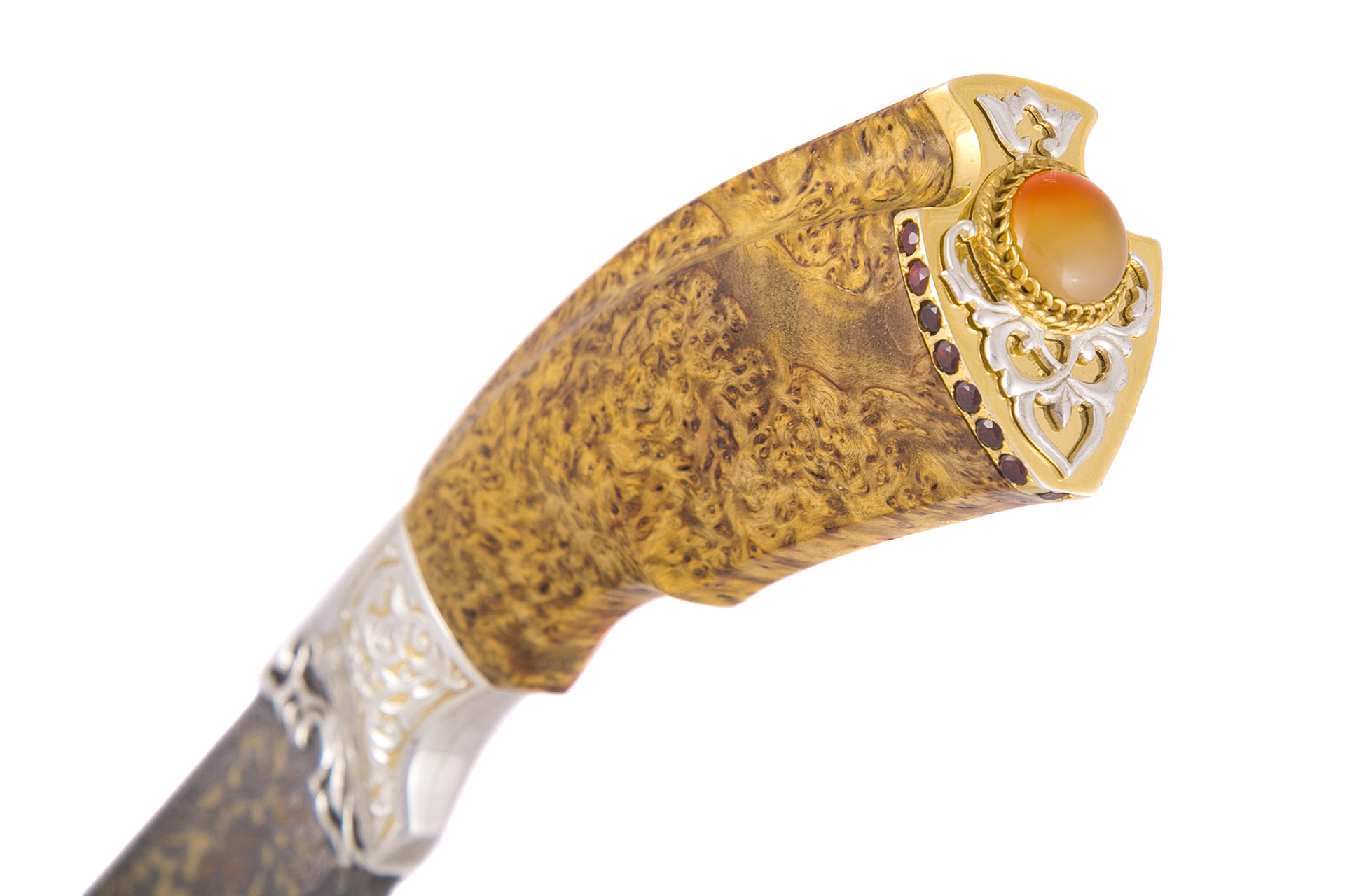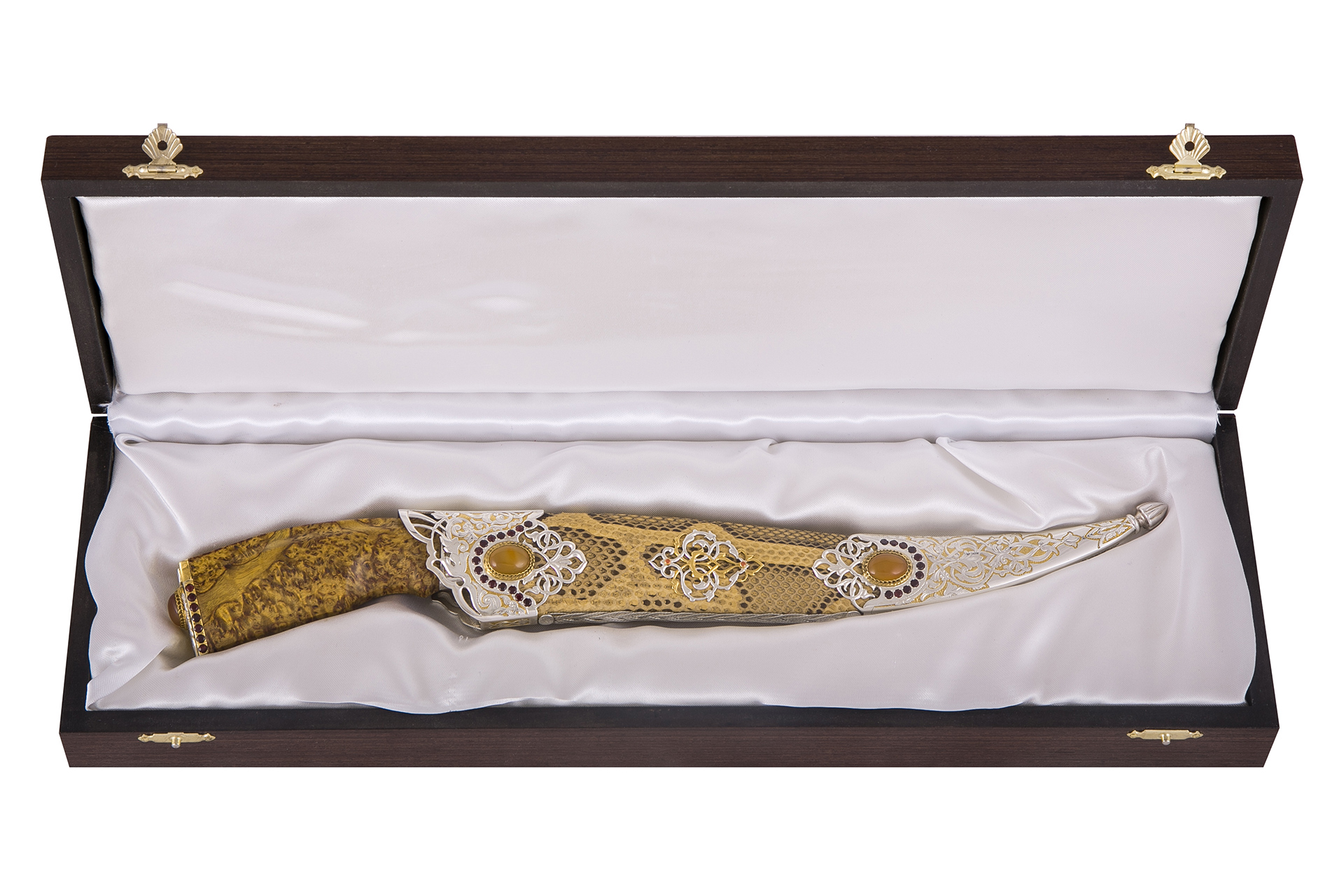 Нож подарочный Азия - это не рядовой сувенир, который ляжет на полку мертвым грузом. Это маленькое произведение искусства, рожденное под руководством опытных мастеров. Ножны имитируют змеиную кожу, что прекрасно сочетается с сердоликом и гранатом. Само лезвие заточено, как профессиональное холодное оружие. Однако это не мешает ему быть оформленным в лучших художественных традициях.