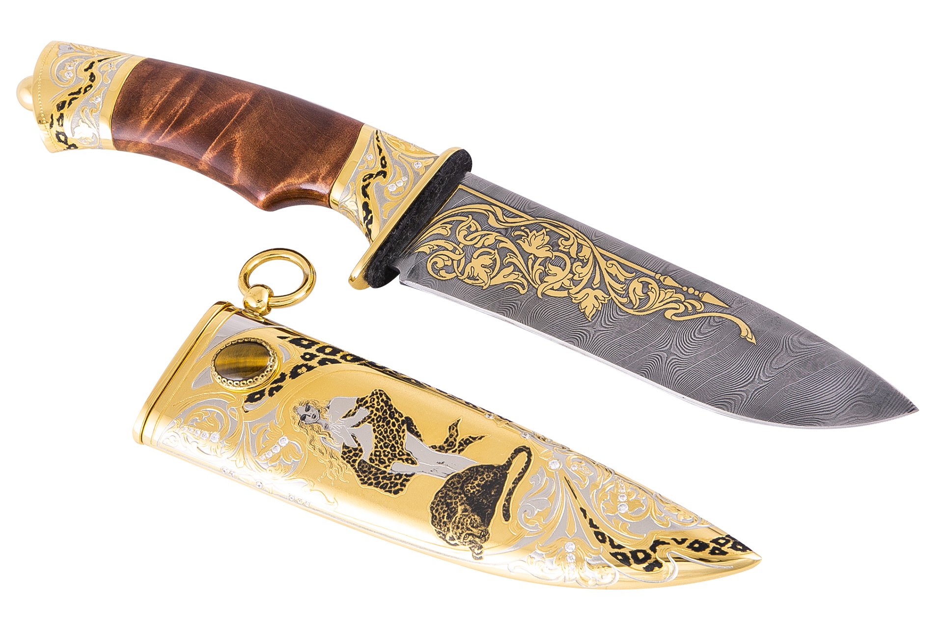 В создании холодного оружия также есть свое искусство: строгая сталь постепенно приобретает изящные формы, становится острой и даже опасной. Но любой металл нуждается в достойном обрамлении, роль которого отлично сыграет древесина. Роспись клинка продумана до мельчайших подробностей, поэтому выглядит она по-настоящему волшебно. Отдельного внимания заслуживают и ножны: на них, в меховом одеянии, изображена та самая хищница, у ног которой лежит леопард. Причудливо смотрятся и фианиты, россыпью разбросанные по композиции.