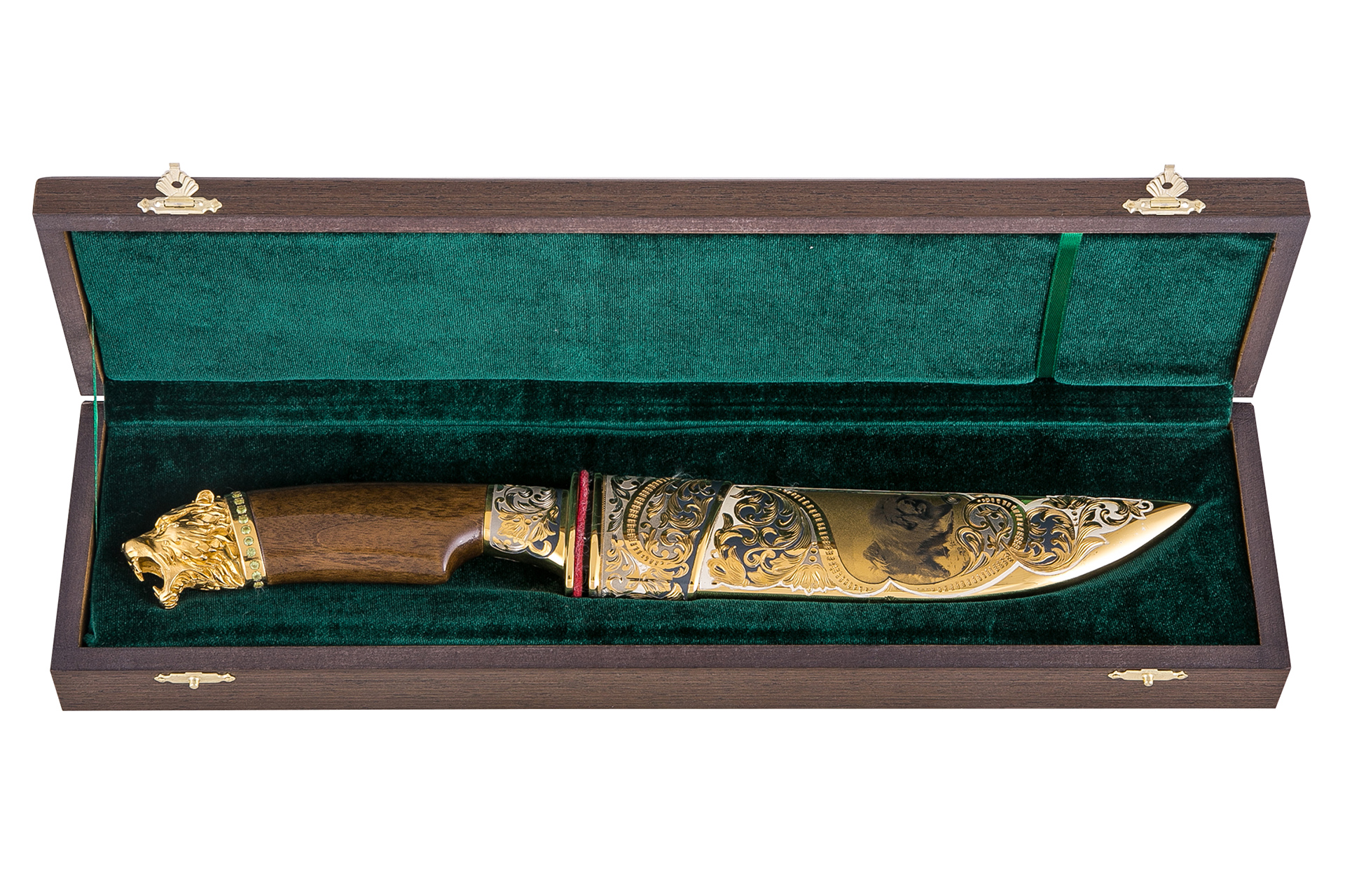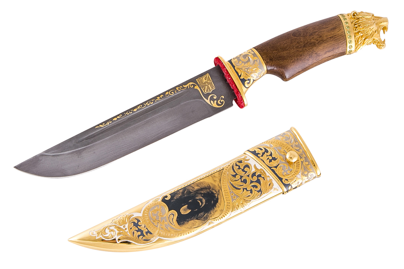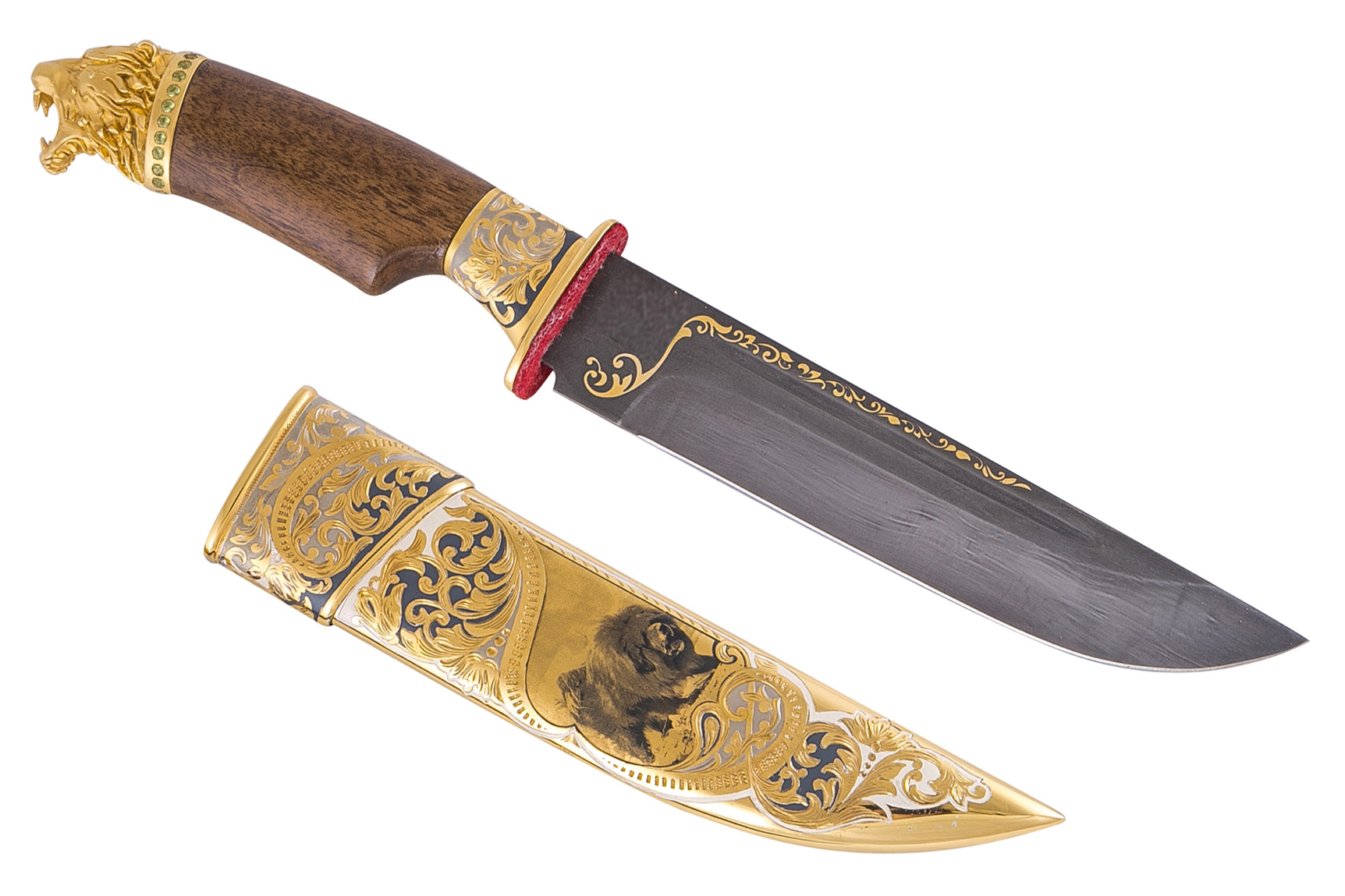 Подарок для заядлого охотника, настоящего волевого мужчины. Высокопрочный нож ручной работы из булатной с ореховой рукоятью. На латунных ножнах изображение тибетского охотничьего мастифа как олицетворение надежности и отваги. Изделие дорогое, эффектное, покрыто золотом, серебром и никелем, инкрустировано ювелирными камнями.