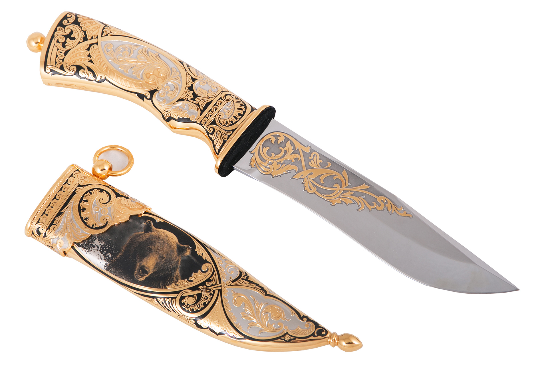 Эксклюзивным и оригинальным подарком для настоящих ценителей искусства станет нож «Классический – Медведь». Это дорогое изделие из высокопрочной стали выполнено вручную. Рукоять ножа изготовлена из ореха, а ножны из латуни, покрытые золотом, серебром и никелем. Клинок и рукоять эффектно украшены орнаментом, а на ножнах изображено животное – медведь. Нож станет предметом зависти и обсуждения среди коллег и конкурентов.