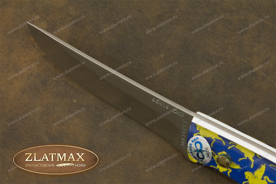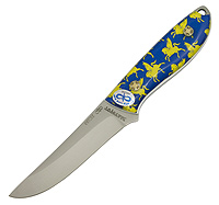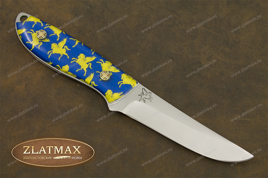 Цельнометаллический нож «Пегасик» сделан с фиксированным клинком и небольшим упором под пальцы (для большей безопасности), с удобной для ребенка рукоятью, украшенной крылатыми конями.