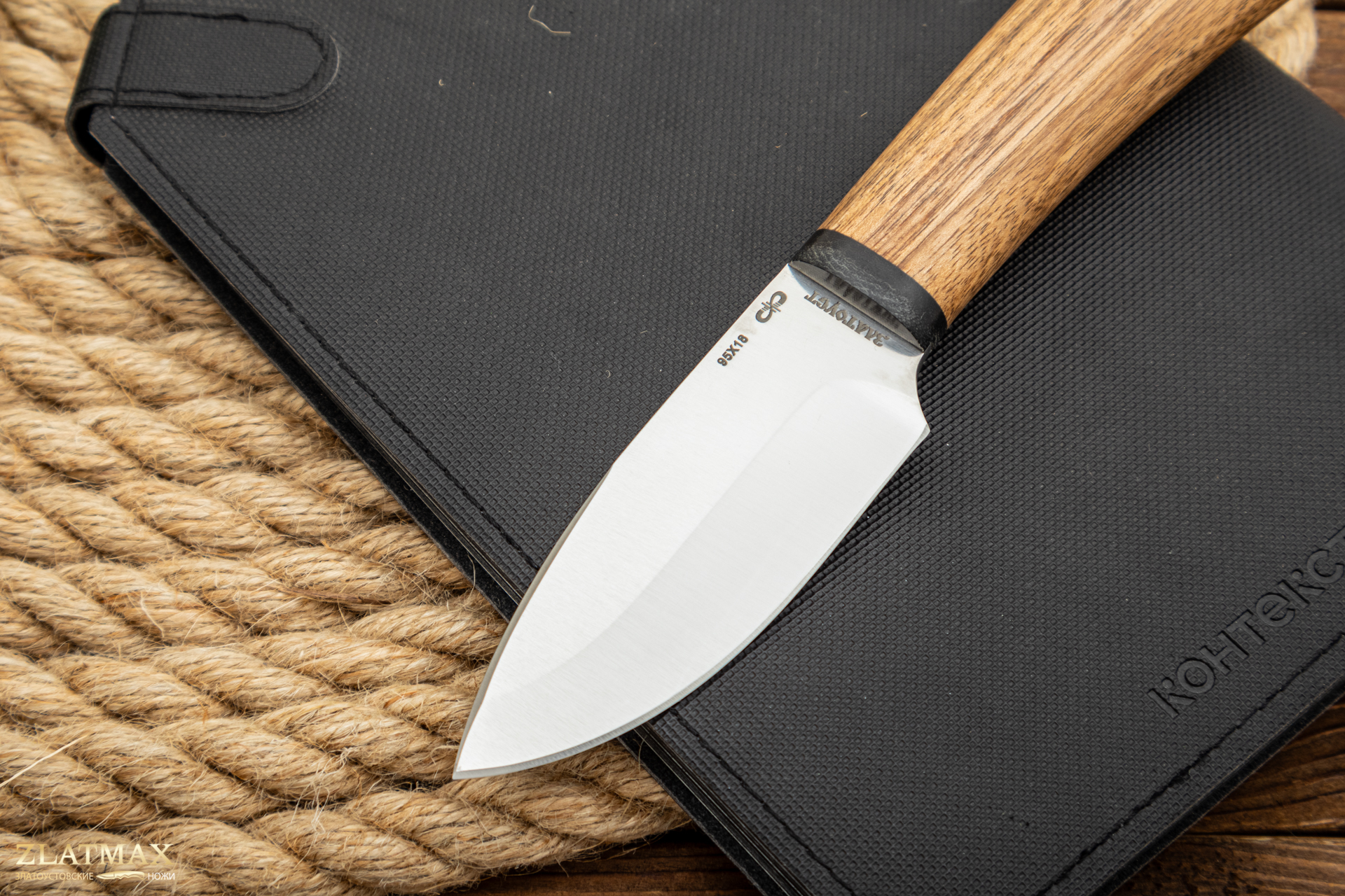 Небольшой универсальный, очень легкий и прочный нож с широким клинком. Клинок имеет вогнутые линзовидные спуски от середины ширины клинка. При толщине обуха в 2,4 мм имеет широкую голомень, что придает ему дополнительную прочность. Удобная форма рукояти позволяет уверенно работать ножом. Монтаж рукояти сквозной, неразборный. Новосибирские охотники давно полюбили этот небольшой нож и утверждают, что именно им разделывают добытого медведя.