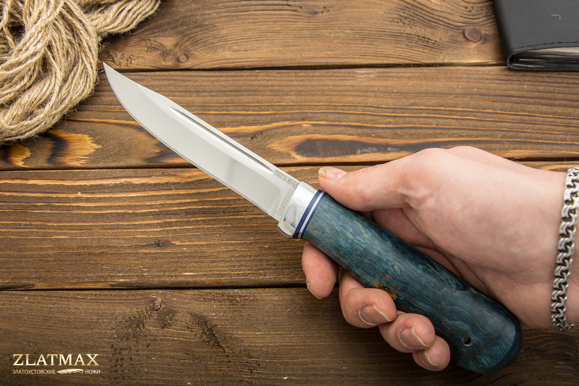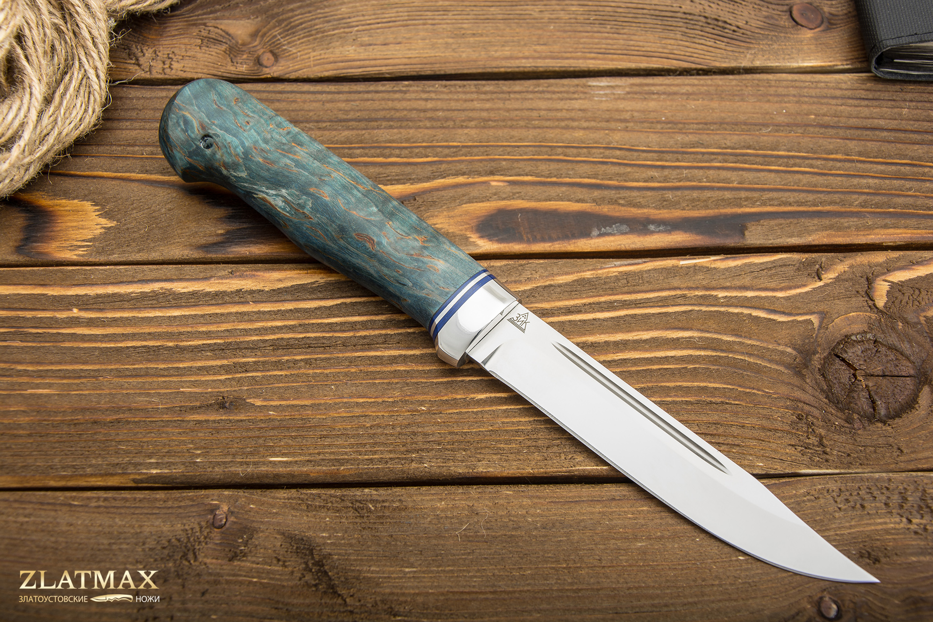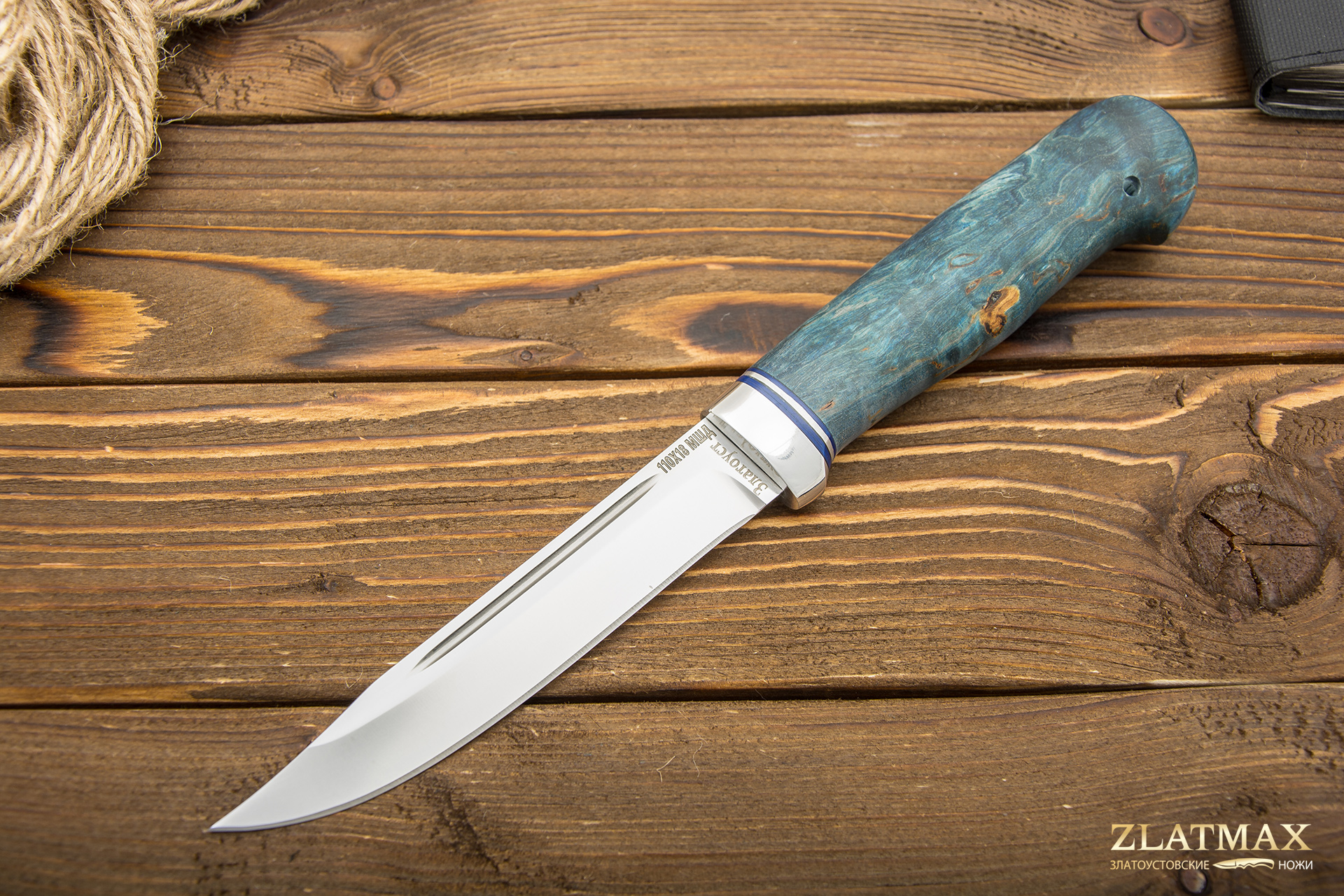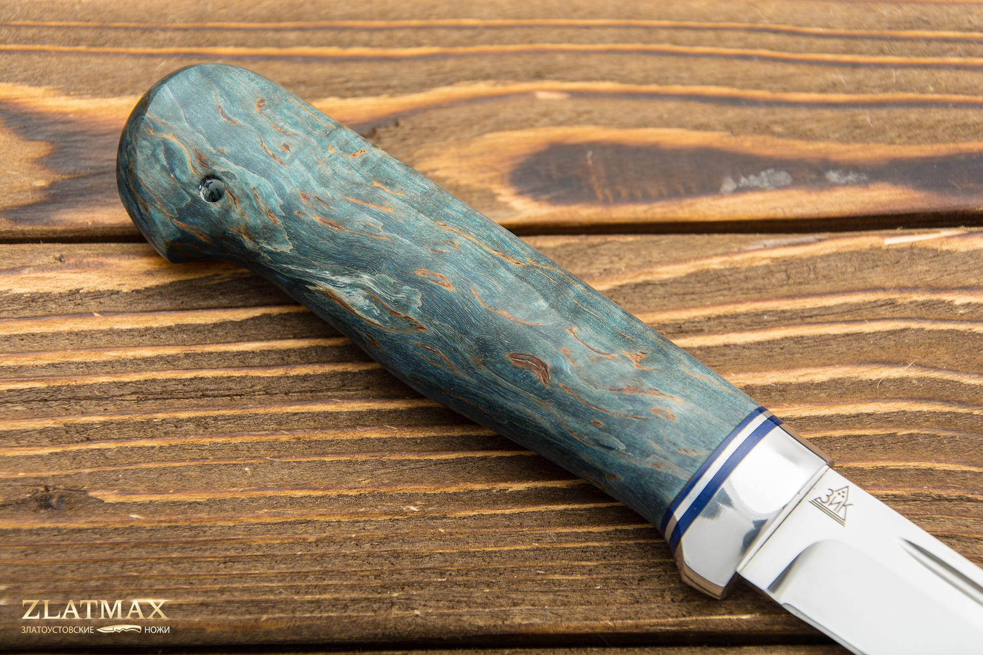 Древесина карельской березы смотрится очень эффектно на рукояти ножа. Необычная текстура материала и красивая палитра оттенков делают вид орудия очень презентабельным.