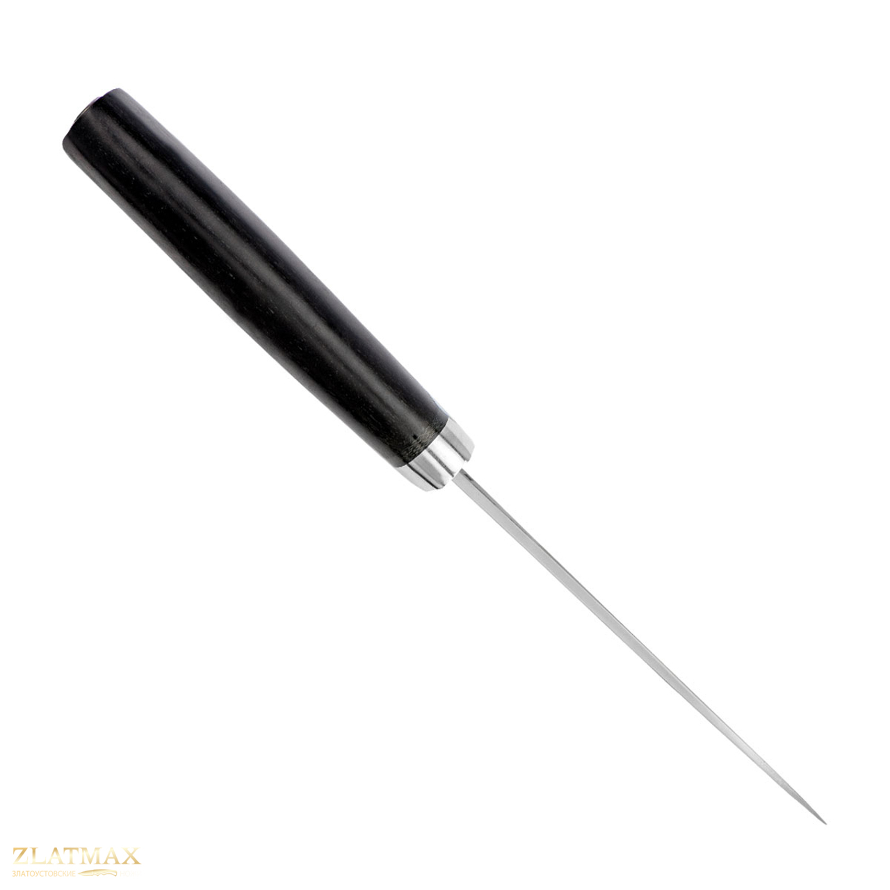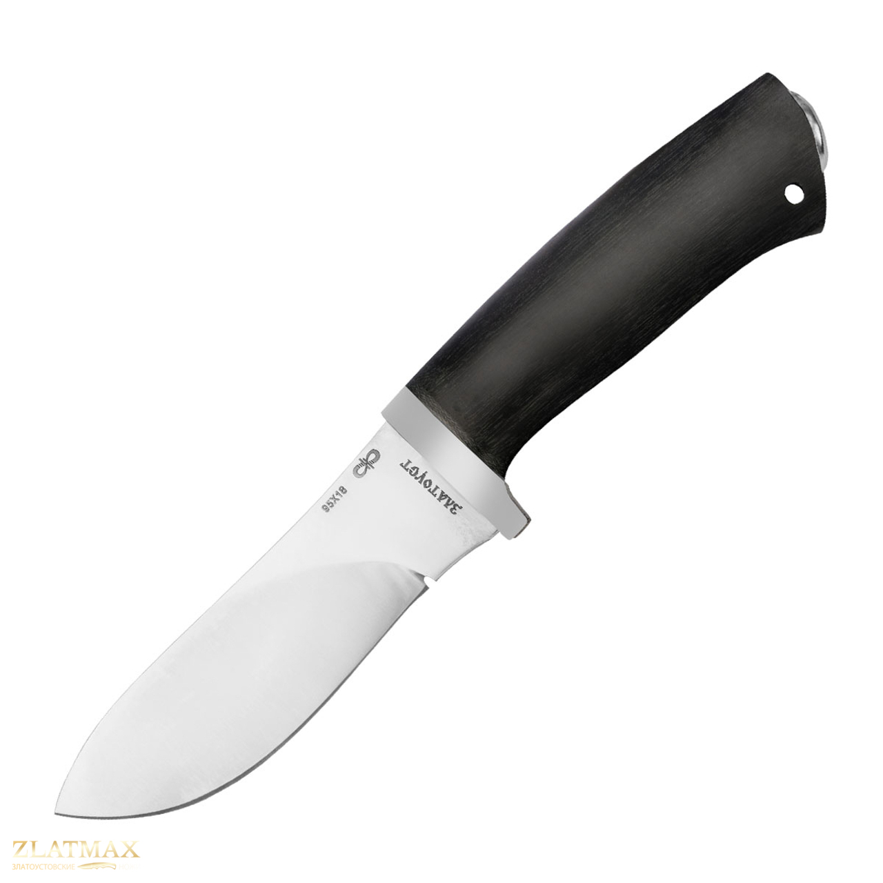 Хороший разделочный нож с широким клинком, имеющим пологие вогнутые линзовидные спуски от самого обуха образующие тонкое, прекрасно режущее лезвие. Демонстрирует отличные режущие качества. Форма клинка, типичная для скинера, позволяет снимать шкуру разделываемого животного, не боясь повредить при этом брюшину. Клинок с толщиной обуха в 3 мм имеет большую пяту, что позволяет работать ножом при разделке разными хватами. Рукоять прочно ложится в ладонь. Монтаж рукояти сквозной, неразборный. Отличный выбор для разделочных работ на охоте и на ферме.