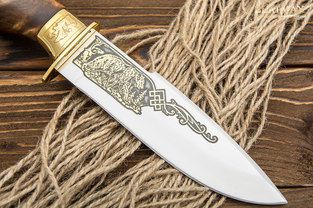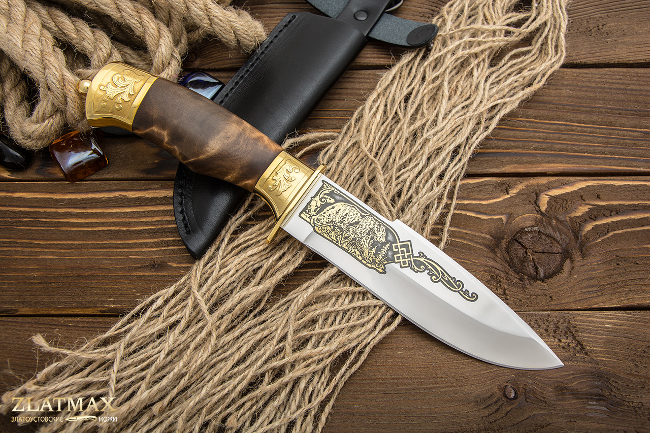 Нож подарочный Горностай-1. Клинок выполнен в технике златоустовской гравюры на стали, гравировка и фурнитура покрыты золотом.