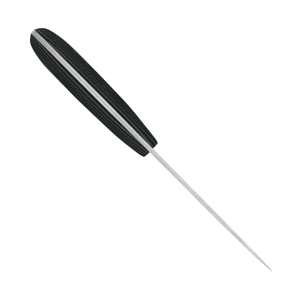 Красивый и удобный малый разделочный нож с клинком, имеющим прямые спуски от обуха, образующие тонкое, прекрасно режущее лезвие. Демонстрирует отличные режущие качества. Форма клинка, типичная для скинера, позволяет снимать шкуру разделываемого животного, без риска при этом повредить брюшину. Клинок имеет длину 89 мм и толщину обуха 3,4 мм. Рукоять удобно ложится практически в любую ладонь. Монтаж рукояти накладной, неразборный. Отличный выбор для разделочных работ на охоте и на ферме.