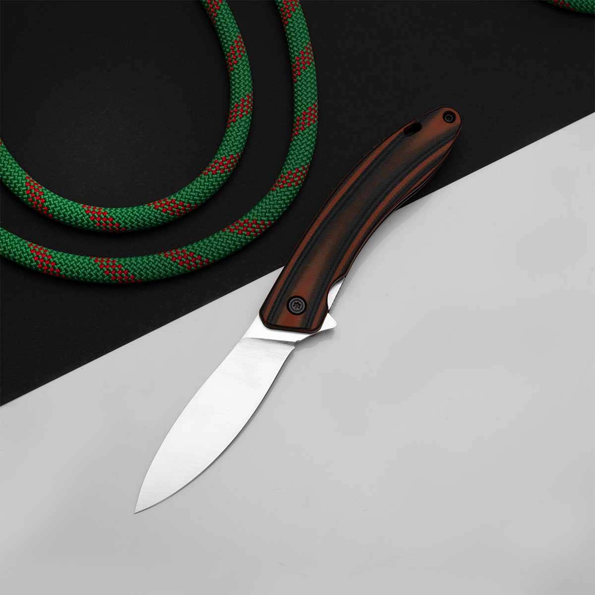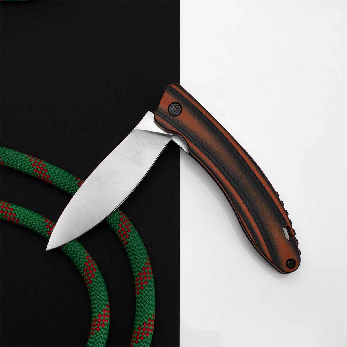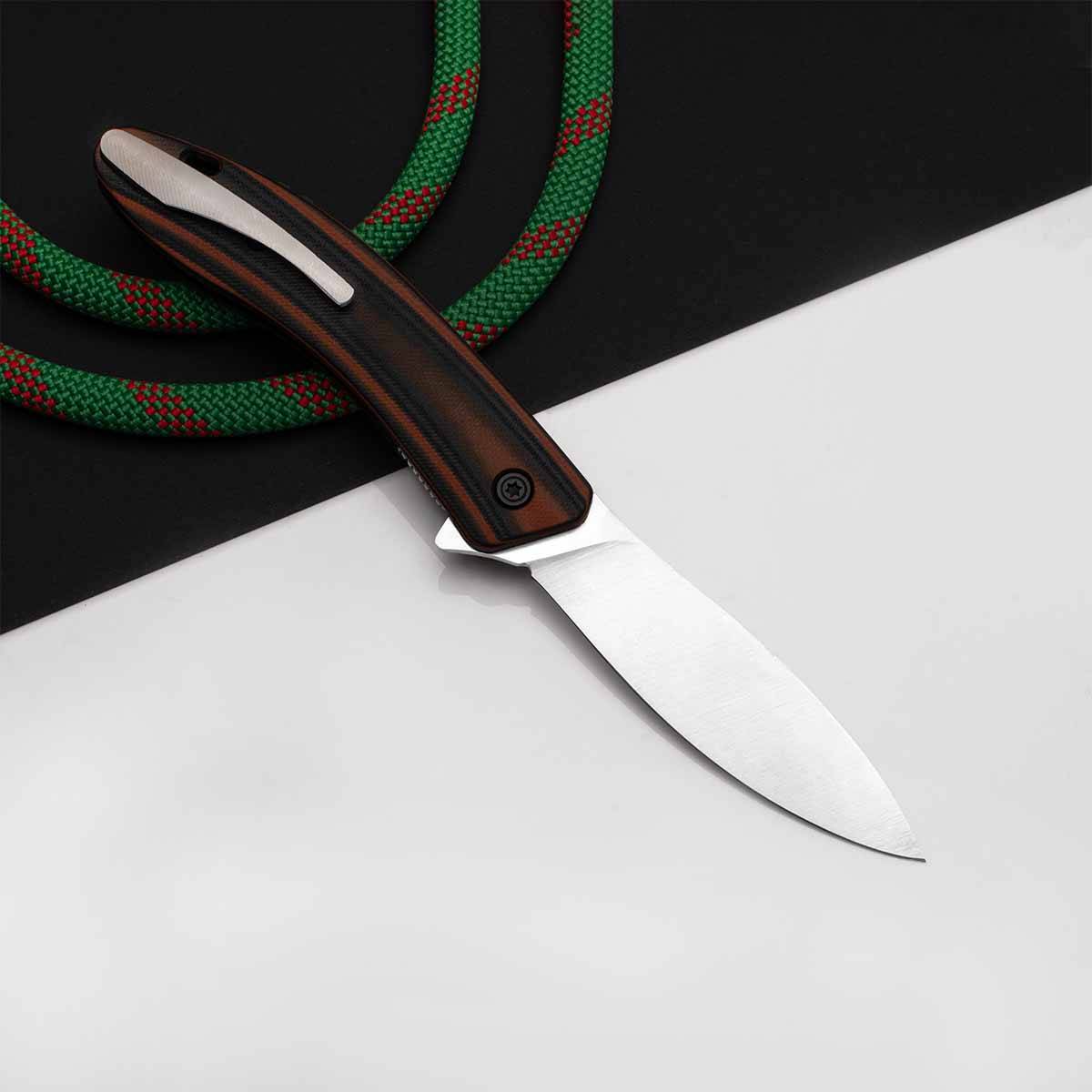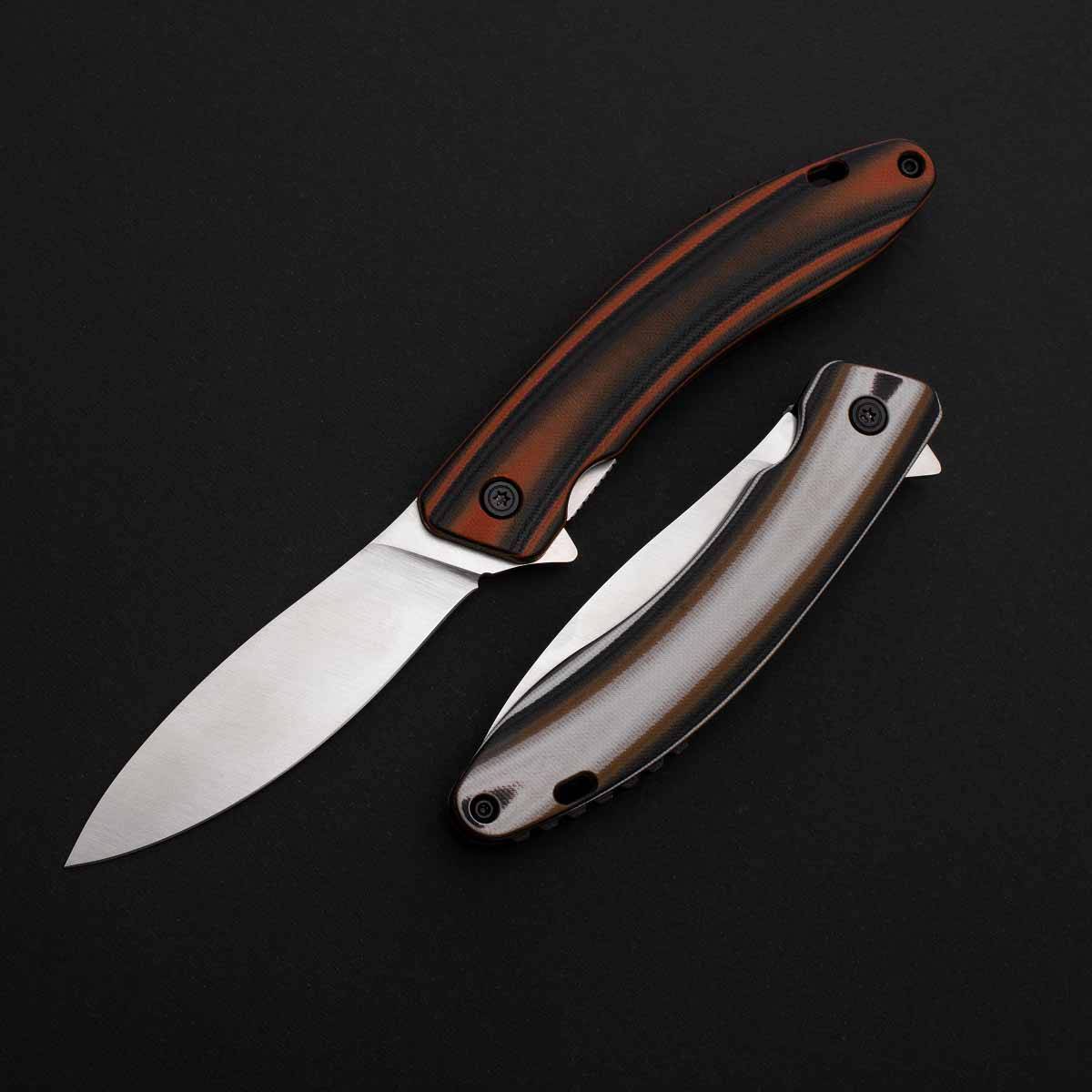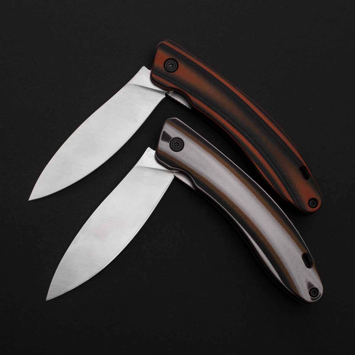 Форму клинка «Хантер» унаследовал от «Канадского малого (траппера)» – каплевидный клинок с прямыми спусками от обуха, который демонстрирует эффективность как в резе, так и в уколе. Клинок из нержавеющей стали стандартно выполняется с полировкой «сатин». Примечательно, что логотип производителя и марка стали нанесены на обух ножа, они видны даже в закрытом положении.