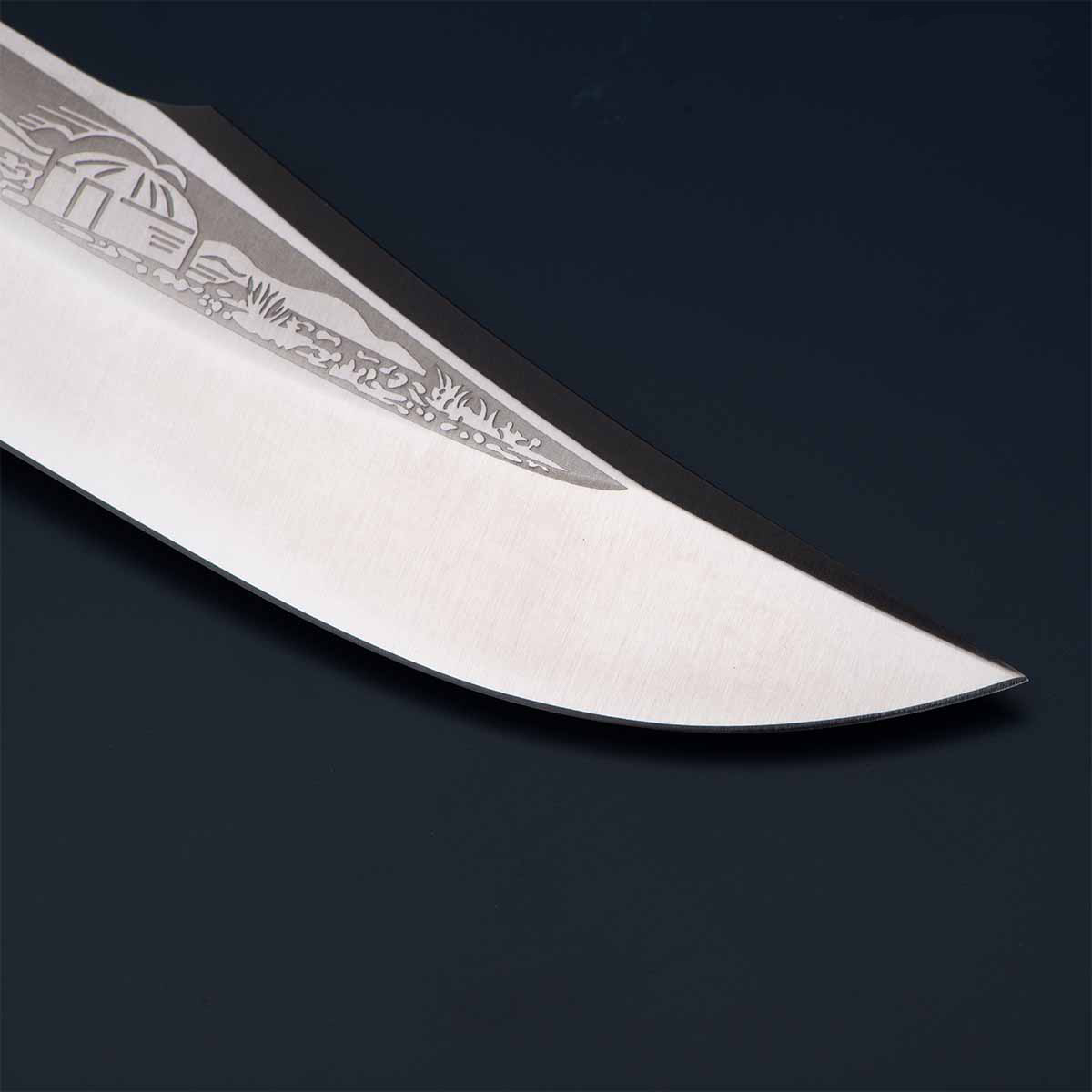 Средний универсальный прочный нож с хищным клинком восточного ятаганного вида, имеющим вогнутые линзовидные спуски от середины клинка, образующие тонкое, прекрасно режущее лезвие. Демонстрирует неплохие режущие качества. Весьма серьезный инструмент. Клинок толщиной обуха в 3 мм имеет прогнутое фальшлезвие двусторонней заточки, с углом заточки 60 градусов и может быть использовано для рубки мелких костей и хрящей. На пяте клинка есть подпальцевый вырез для указательного пальца. Форма рукояти удобна даже для большой руки, уверенно и прочно ложится в любую ладонь. Монтаж рукояти сквозной, неразборный. На навершии рукояти имеется отверстие под темляк. Отличный выбор для большинства видов работы в лесу.