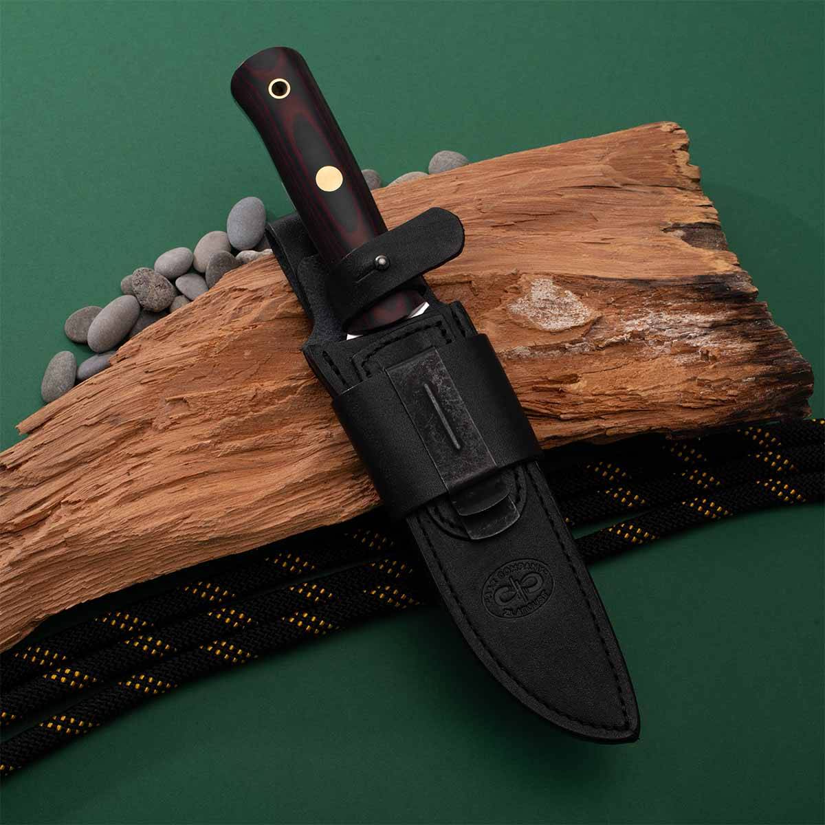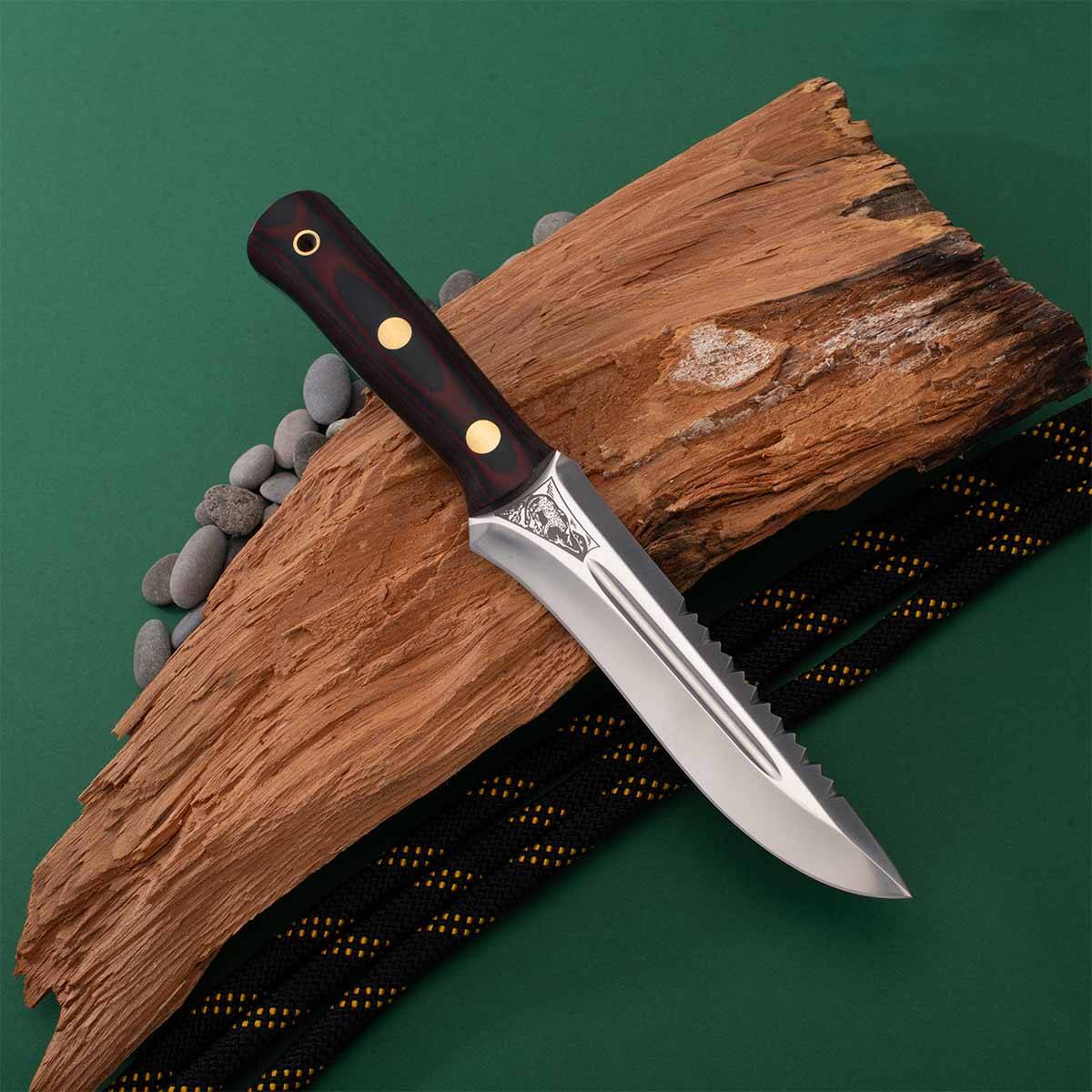 Внушительный нож с серьезным клинком классической формы, с толщиной обуха 6 мм. Долы на голомени клинка придают ему дополнительную жесткость. Пила по обуху клинка может быть использована для надпилки рогов и костей. Спуски образуют тонкое, хорошо режущее лезвие. Рукоять большая, удобной для рубки формы, имеет на навершии отверстие для темляка. Монтаж рукояти накладной, неразборный. Этот нож придется по вкусу любителям охоты, труднопроходимых дорог и экстремального туризма, он хорош при обустройстве стоянки или для рубки веток под колеса застрявшей машины.