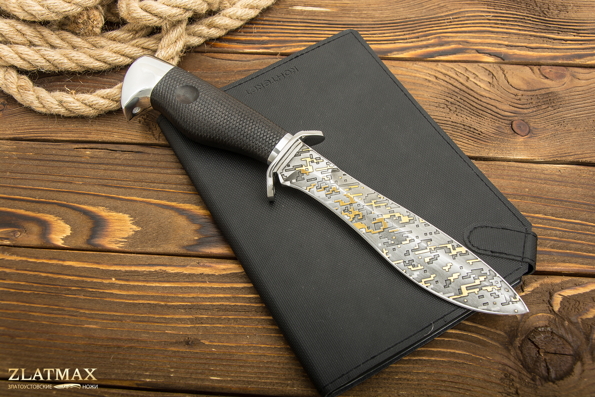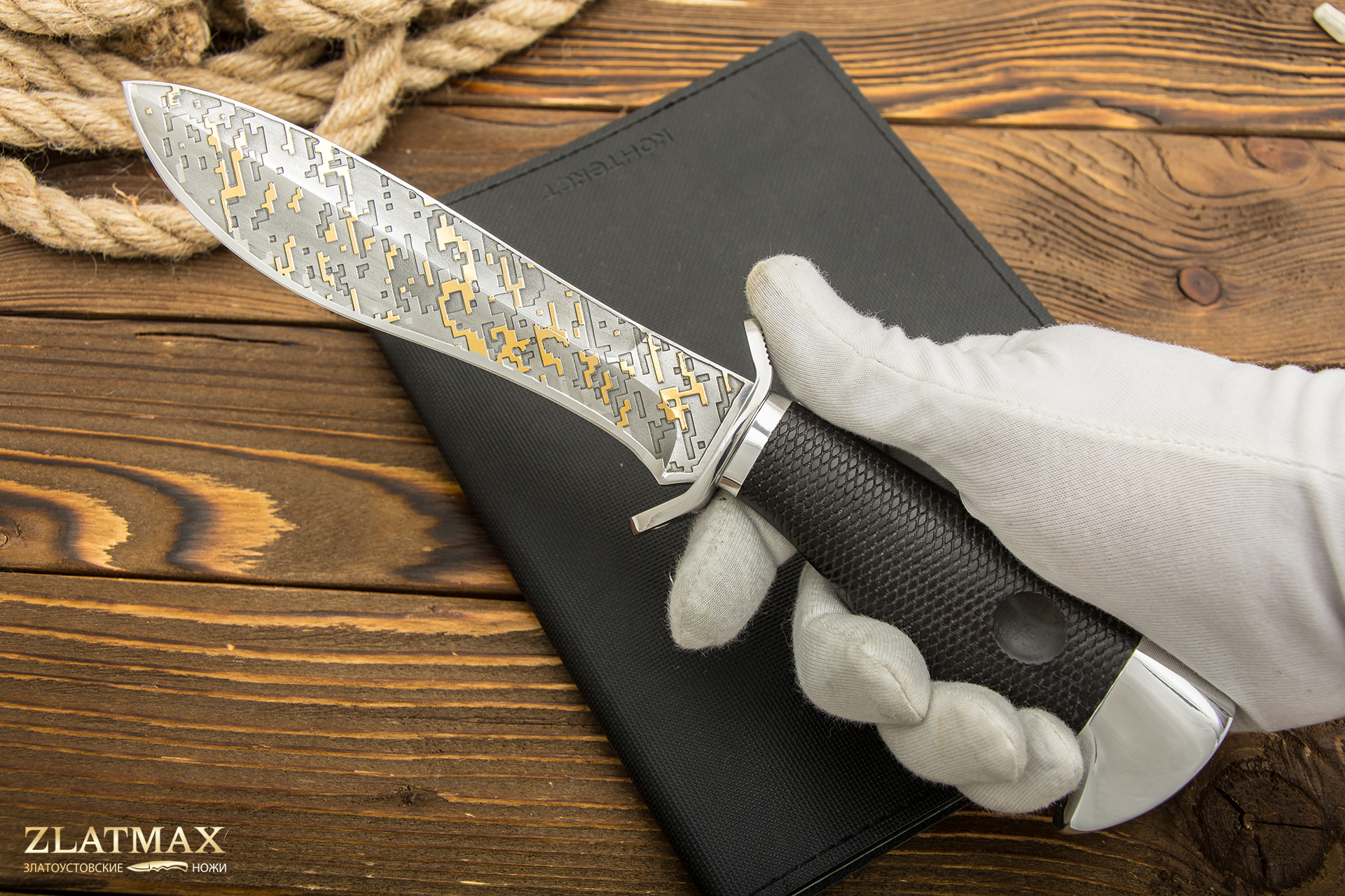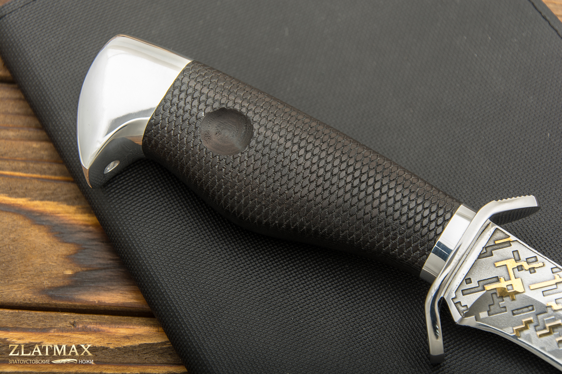 В нашем производстве используется мореный граб. Он повторяет структуру эбенового дерева, которое является ценной и красивой породой. Граб пропитан смолами, ему не страшно попадание влаги, он не растрескается со временем. Смотрится представительно и отлично подходит для подарочного варианта ножа.