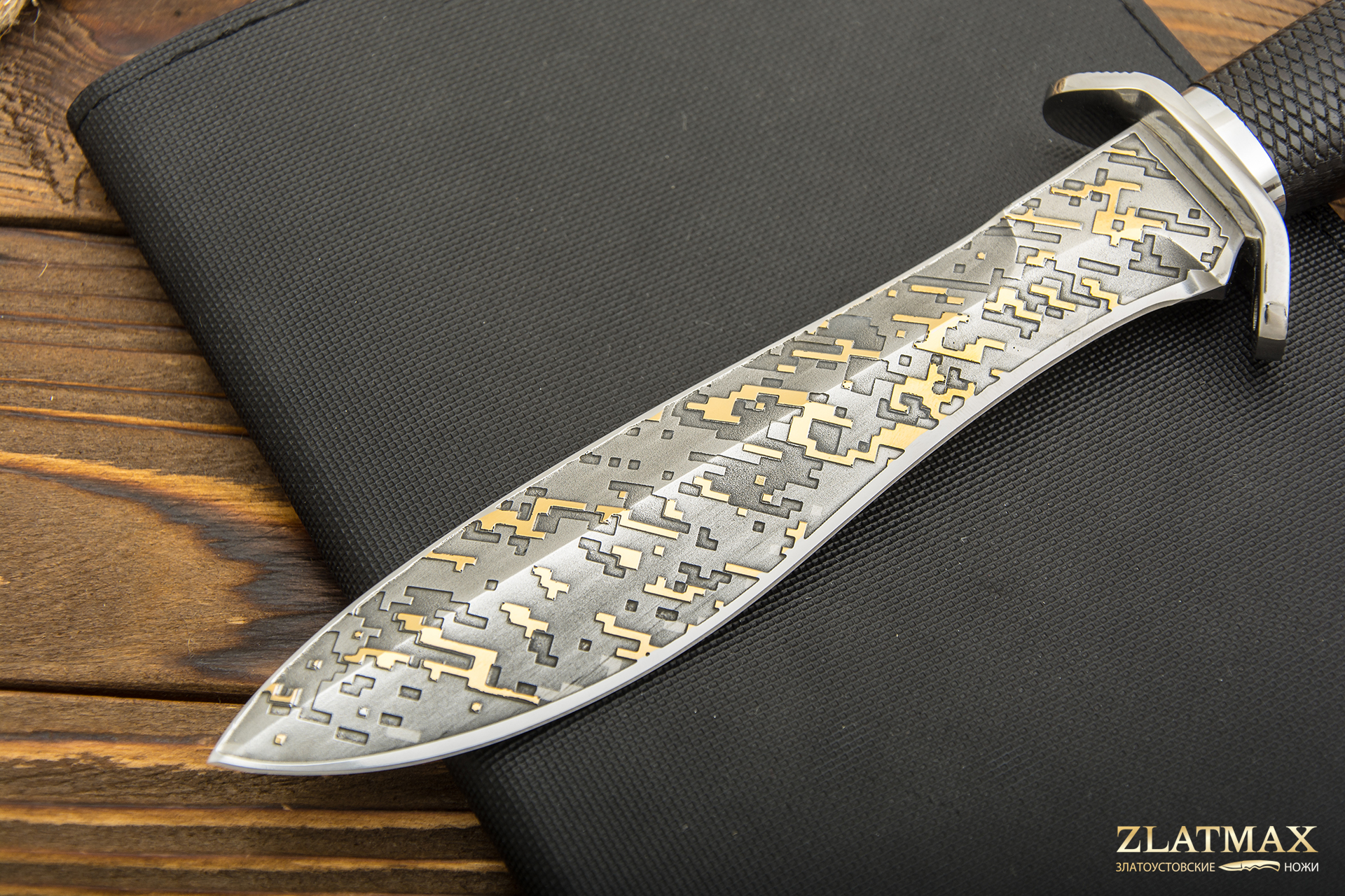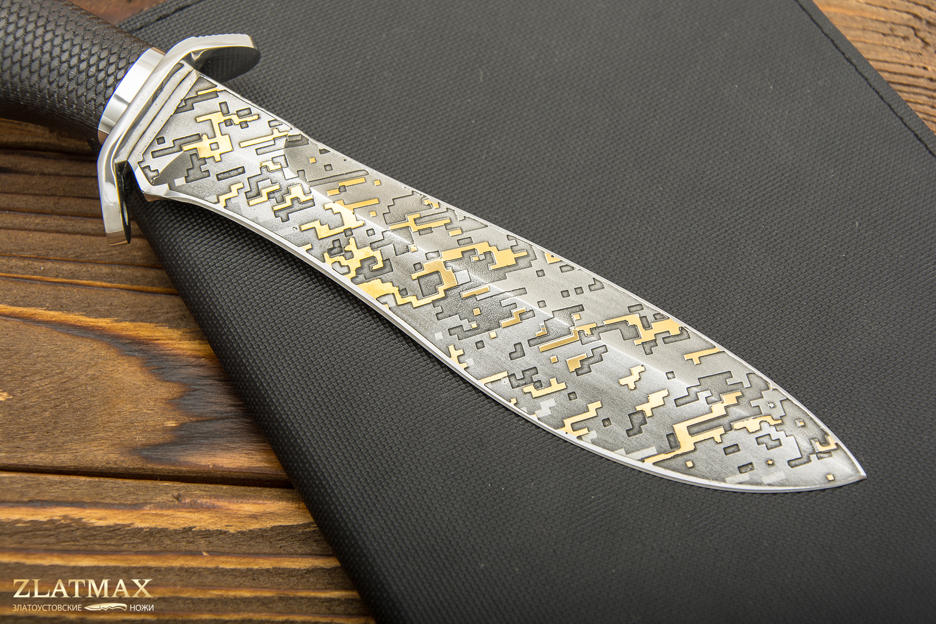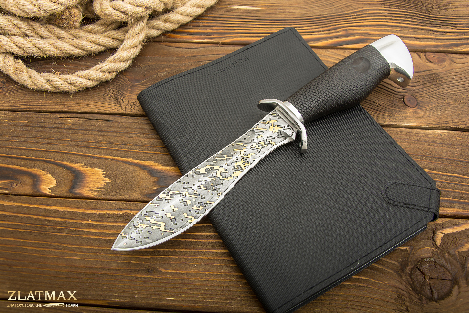 В нашем производстве используется мореный граб. Он повторяет структуру эбенового дерева, которое является ценной и красивой породой. Граб пропитан смолами, ему не страшно попадание влаги, он не растрескается со временем. Смотрится представительно и отлично подходит для подарочного варианта ножа.