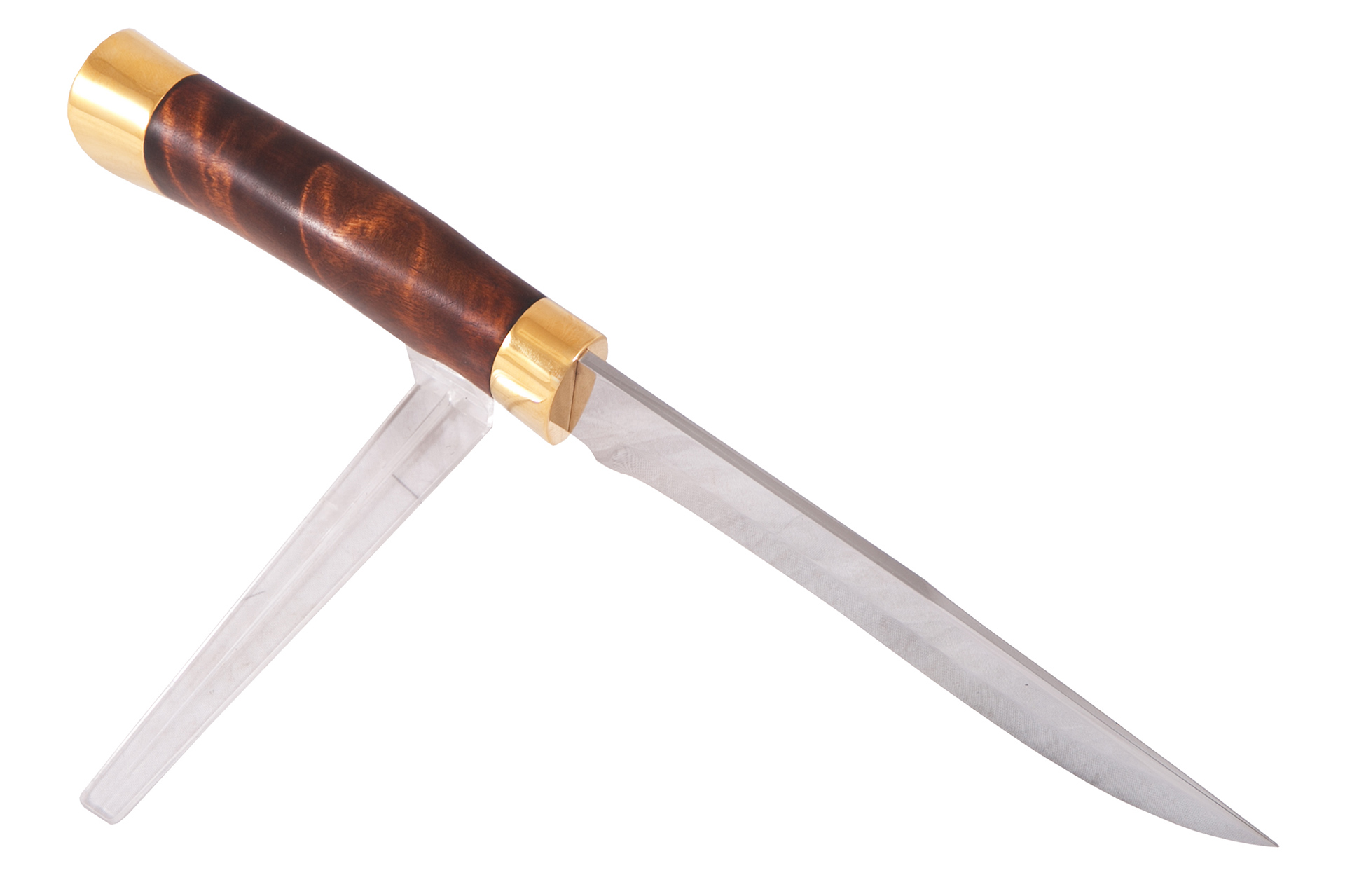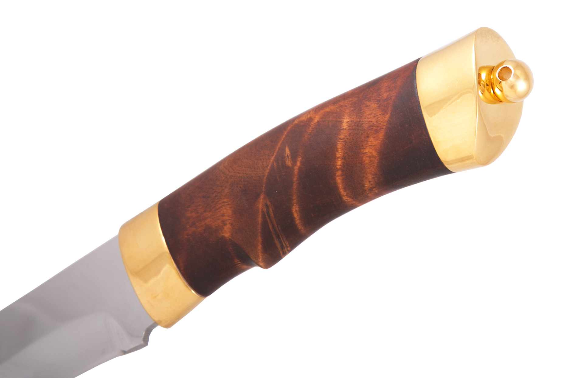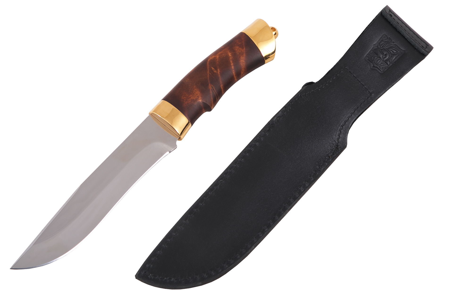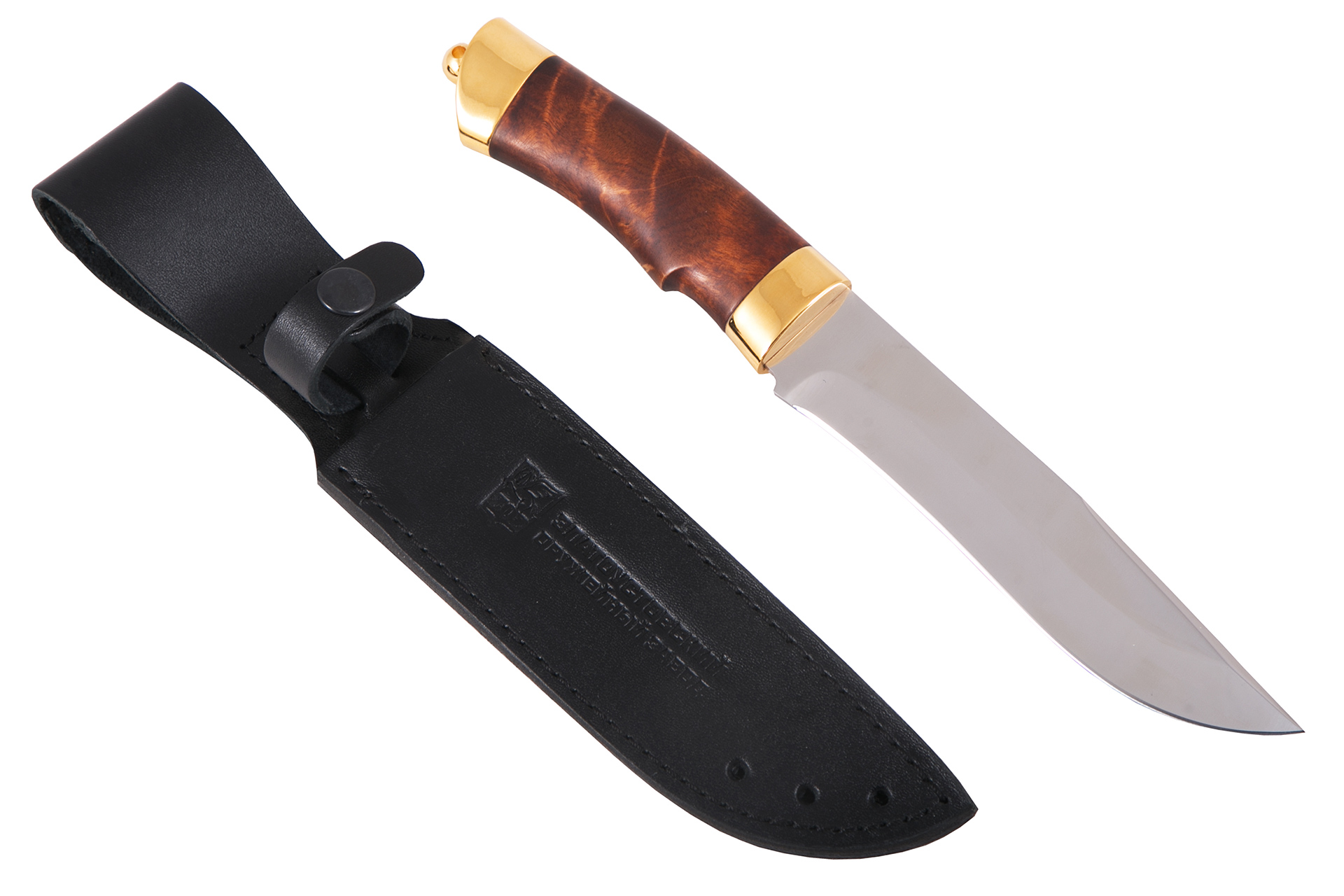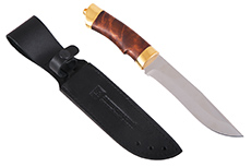Материал: клинок из стали ЭИ-107; рукоять - кап березовый; тыльник, гарда - латунь; кожаные ножны. Покрытие: золотом 999,9; никелем. Техника исполнения: токарные и слесарные работы, полировка. Характеристики Ножи Охотничьи Тип стали Кованная нержавеющая 40Х10С2М(ЭИ-107) Материал рукояти Березовый кап Общая длина, мм 295 Длина клинка, мм 155 Ширина клинка, мм 30 Толщина клинка, мм 3 Твердость клинка, HRC 58 Покрытие Гальванический метод Вес ножа, кг 0.309 Материал ножен Кожа