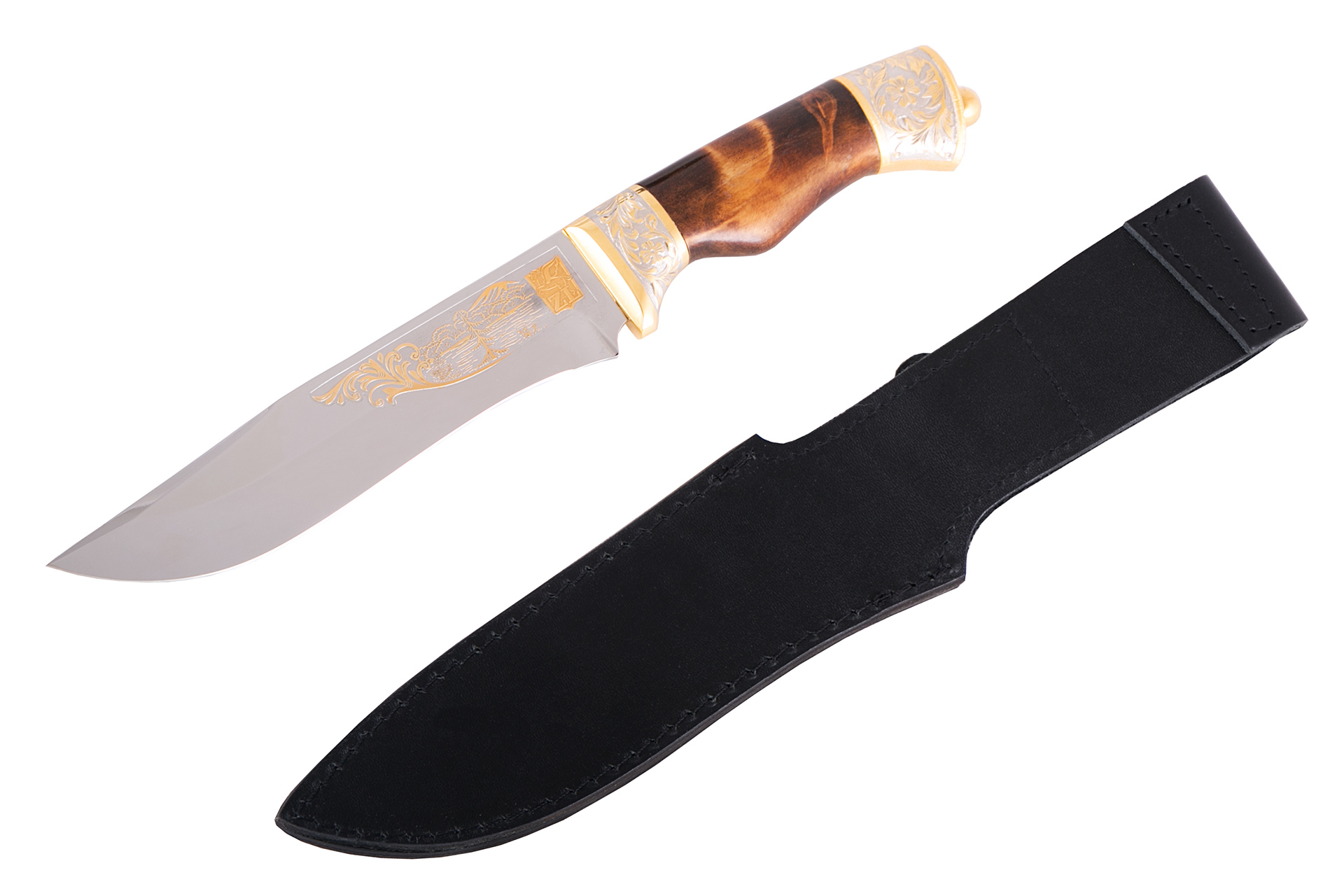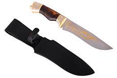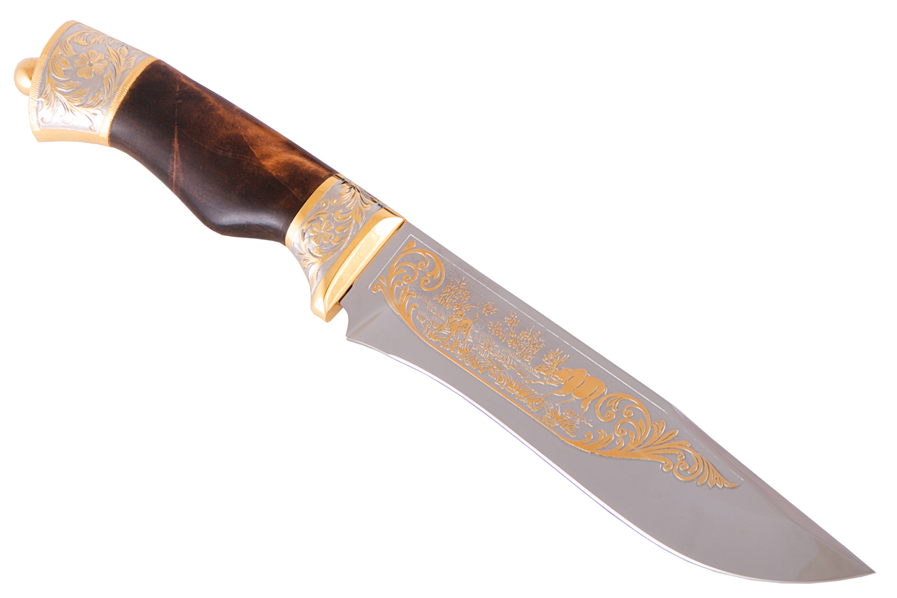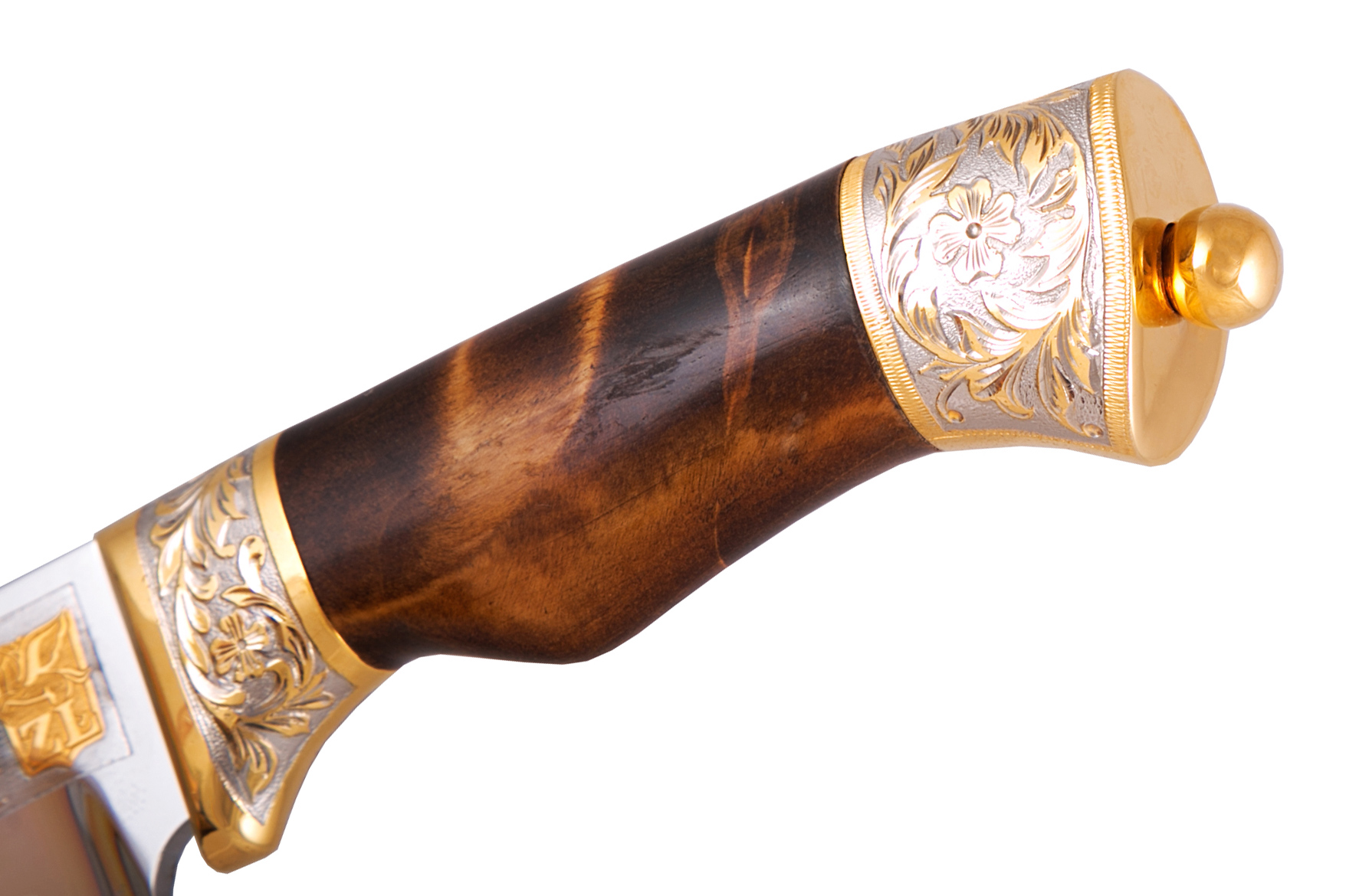 Материал: клинок из стали ЭИ-107(закалка 55 ед. по шкале Роквелла); рукоять - орех; кожаные ножны. Покрытие: золотом 999,9; никелем. Техника исполнения: токарные и слесарные работы, рисовка кистью на металле, многоступенчатая гравировка иглой по лаку, травление, ручная подрезка, полировка. Размеры: общая длина - 300 мм длина клинка - 170 мм ширина клинка - 38 мм Характеристики Тип стали Кованная нержавеющая 40Х10С2М(ЭИ-107) Материал рукояти Дерево Покрытие Гальванический метод Материал ножен Кожа