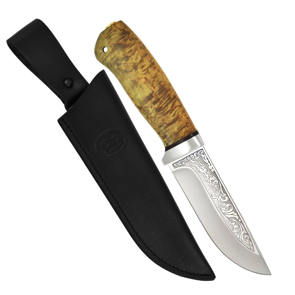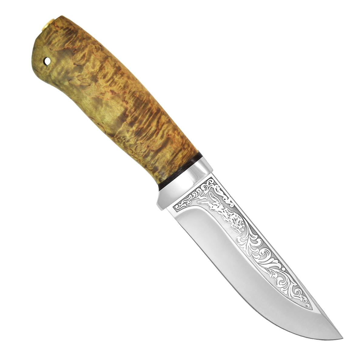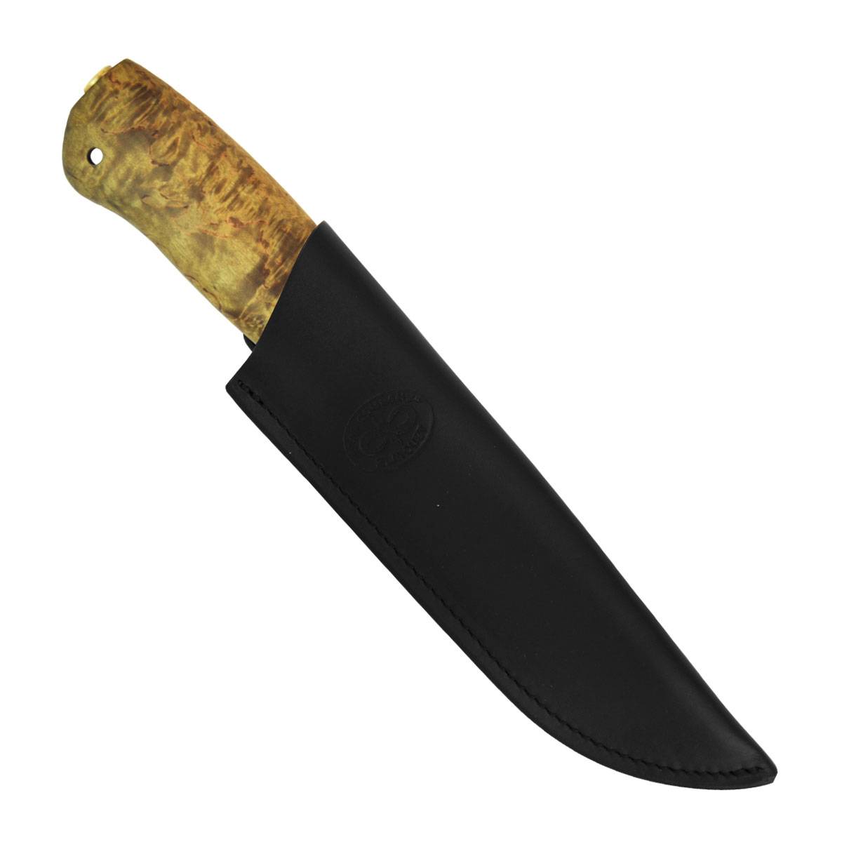 Средний универсальный, легкий и прочный нож с широким клинком, имеющим вогнутые линзовидные спуски от середины клинка, образующие тонкое, прекрасно режущее лезвие. Демонстрирует отличные режущие качества. Поэтому в умелых руках становится весьма серьезным инструментом. Клинок классической формы с приспущенным к острию обушком и толщиной 2,4 мм имеет широкую голомень. Эргономичная форма рукояти удобна даже для большой руки, уверенно и прочно ложится в любую ладонь. А оптимальной величины гарда не дает соскользнуть пальцам при резах от себя. Монтаж рукояти сквозной, неразборный. Отличный выбор для большинства видов работы в лесу. Пользуется заслуженной популярностью у покупателей.