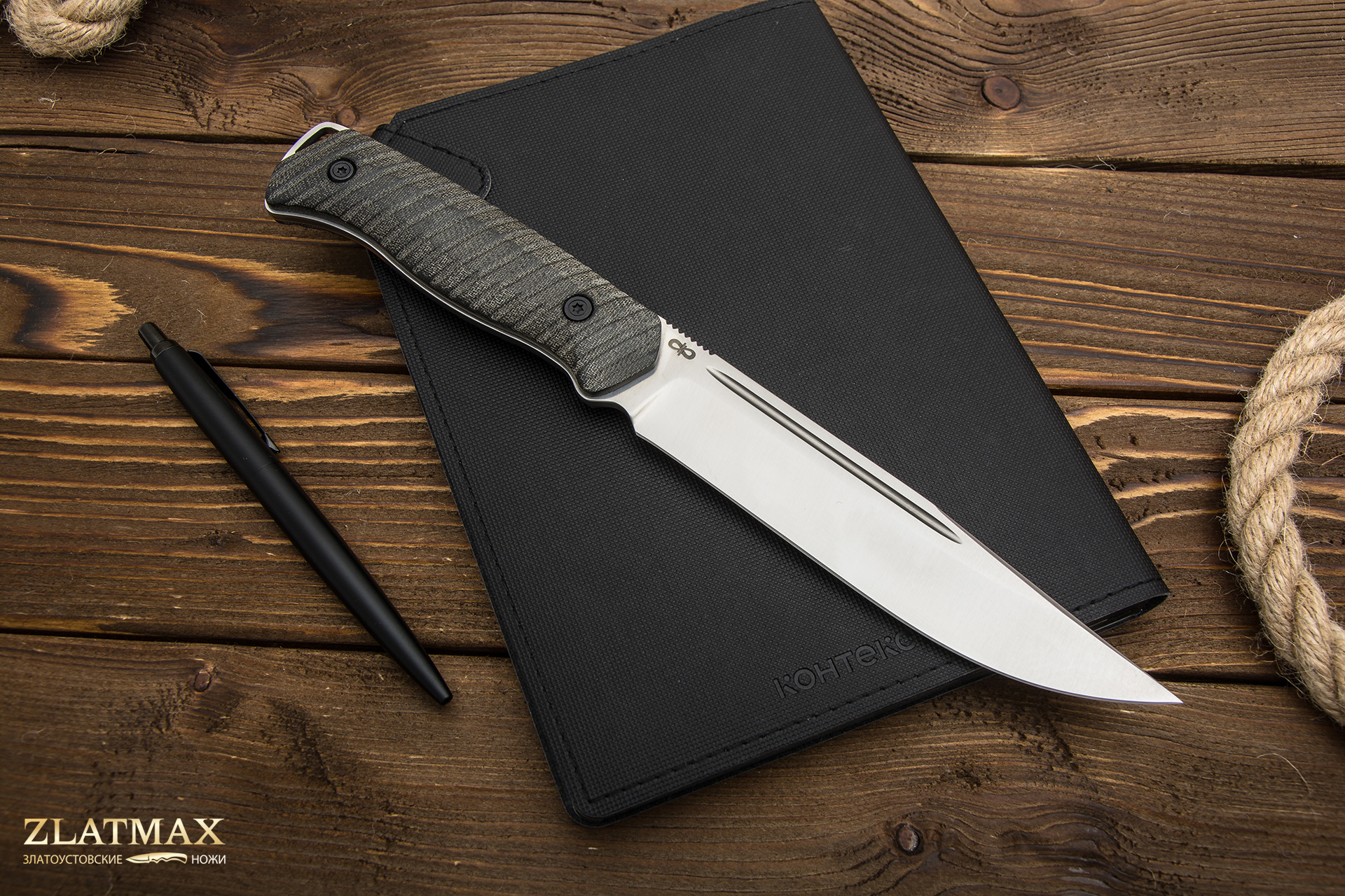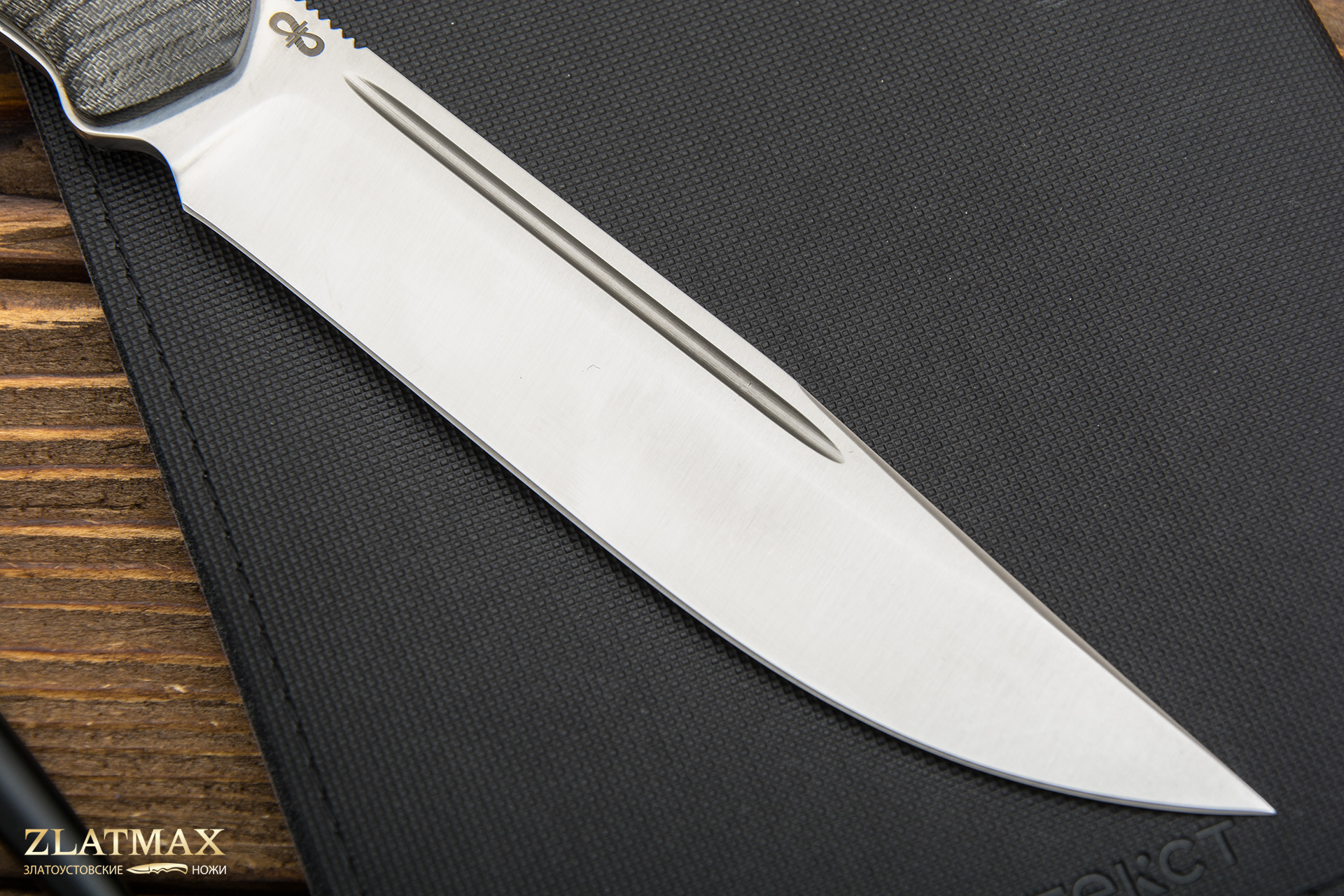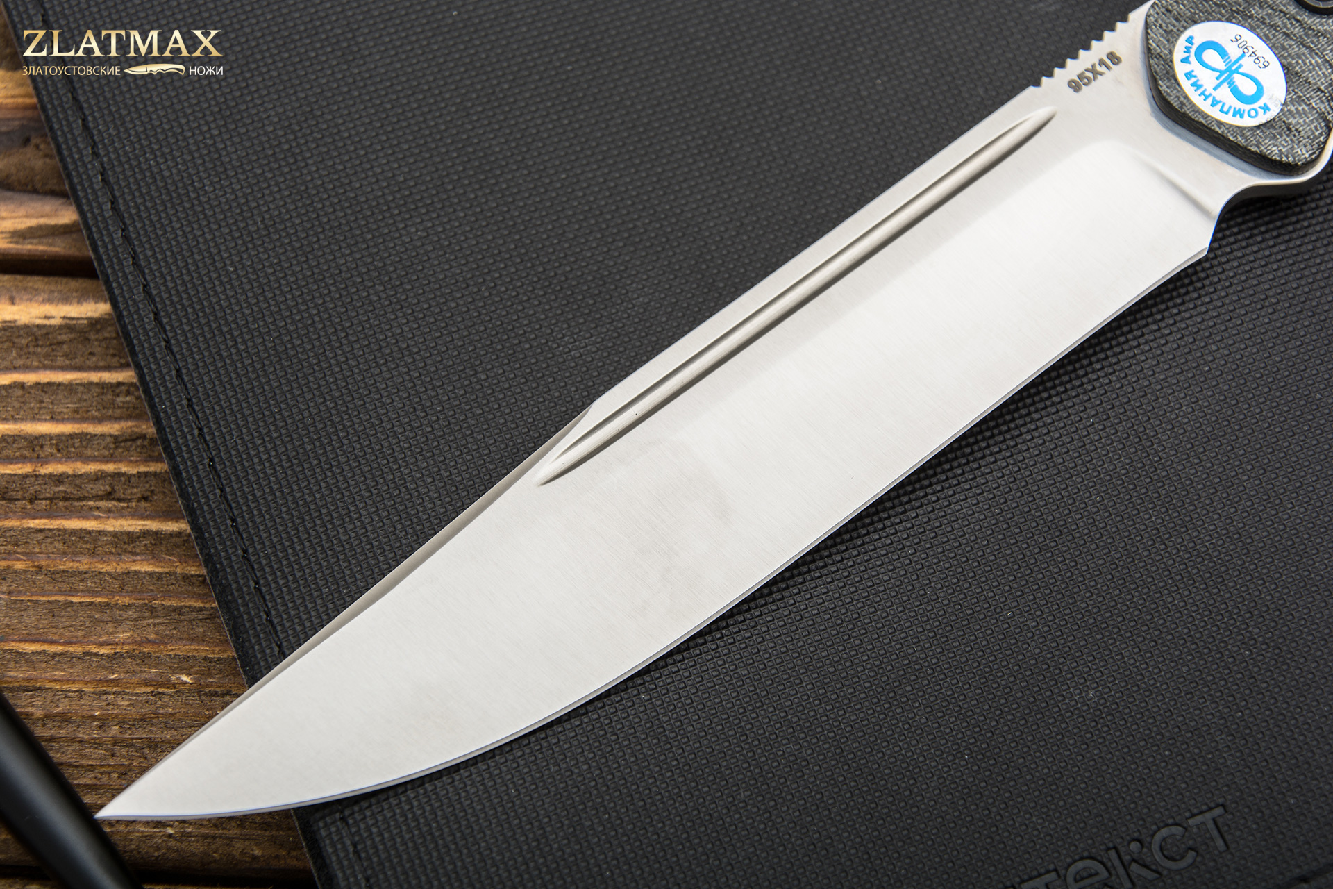 Нож «Леший-Т» – модифицированная версия ножа «Леший» с серьезным мощным клинком. Входит в линейку ножей "Техно". По сравнению с классической моделью, существенно уменьшена масса ножа за счет выборки металла на клинке. На клинке срезка линзовидных спусков поднята до 21 мм. Уменьшена площадь пяты, за счет этого получена более длинная режущая кромка. Вместо выраженного чойла выполнена аккуратная подпальцевая выемка. Монтаж рукояти накладной, разборный. Клепки заменены на болты, позволяющие разбирать рукоять и менять накладки. Дизайн рукояти немного переработан, «Леший-Т» имеет оригинальное отверстие под темляк. На рукояти выполняется декоративная насечка для того, чтобы нож не соскальзывал при работе. Рукоять более ухватистая за счет того, что накладка занимает меньшую площадь, чем пластина ножа. Долы на каждой стороне клинка значительно уменьшают его вес, при этом сохраняя прочность. Нож «Леший-Т» – идеальный рабочий нож для охоты, похода, выживания, использования в быту и фермерском хозяйстве.