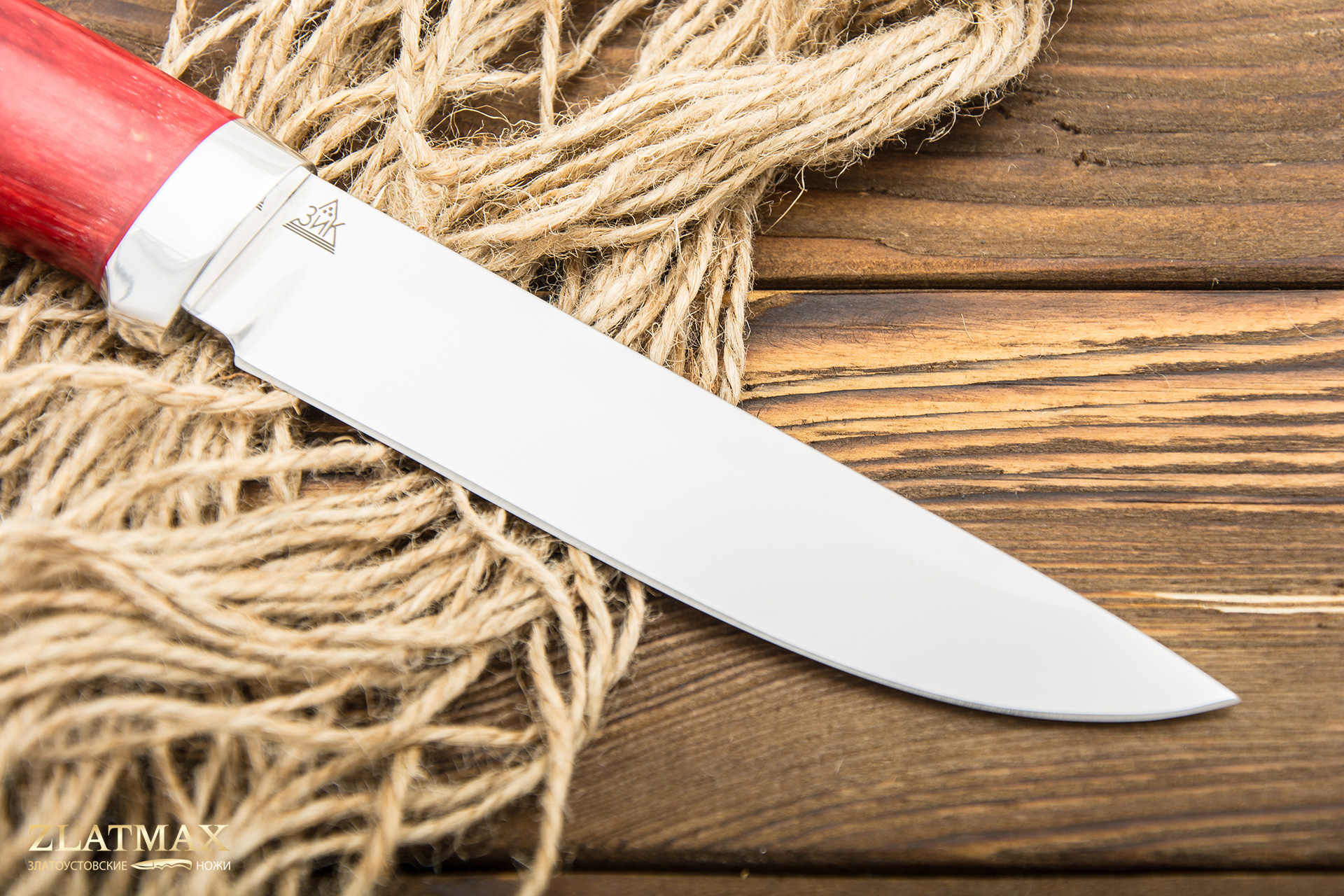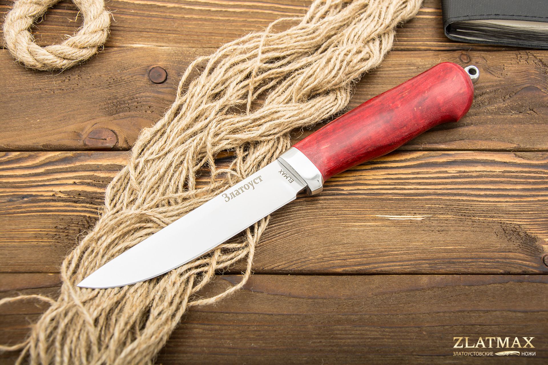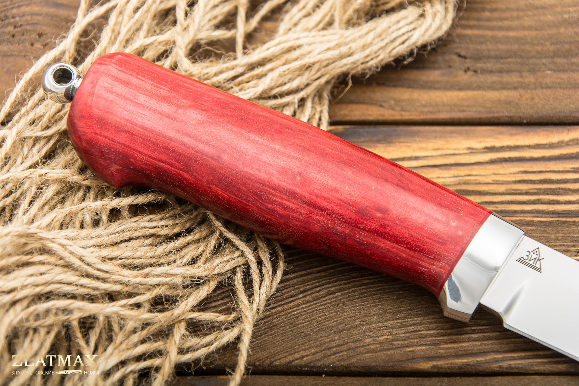 Древесина карельской березы смотрится очень эффектно на рукояти ножа. Необычная текстура материала и красивая палитра оттенков делают вид орудия очень презентабельным.