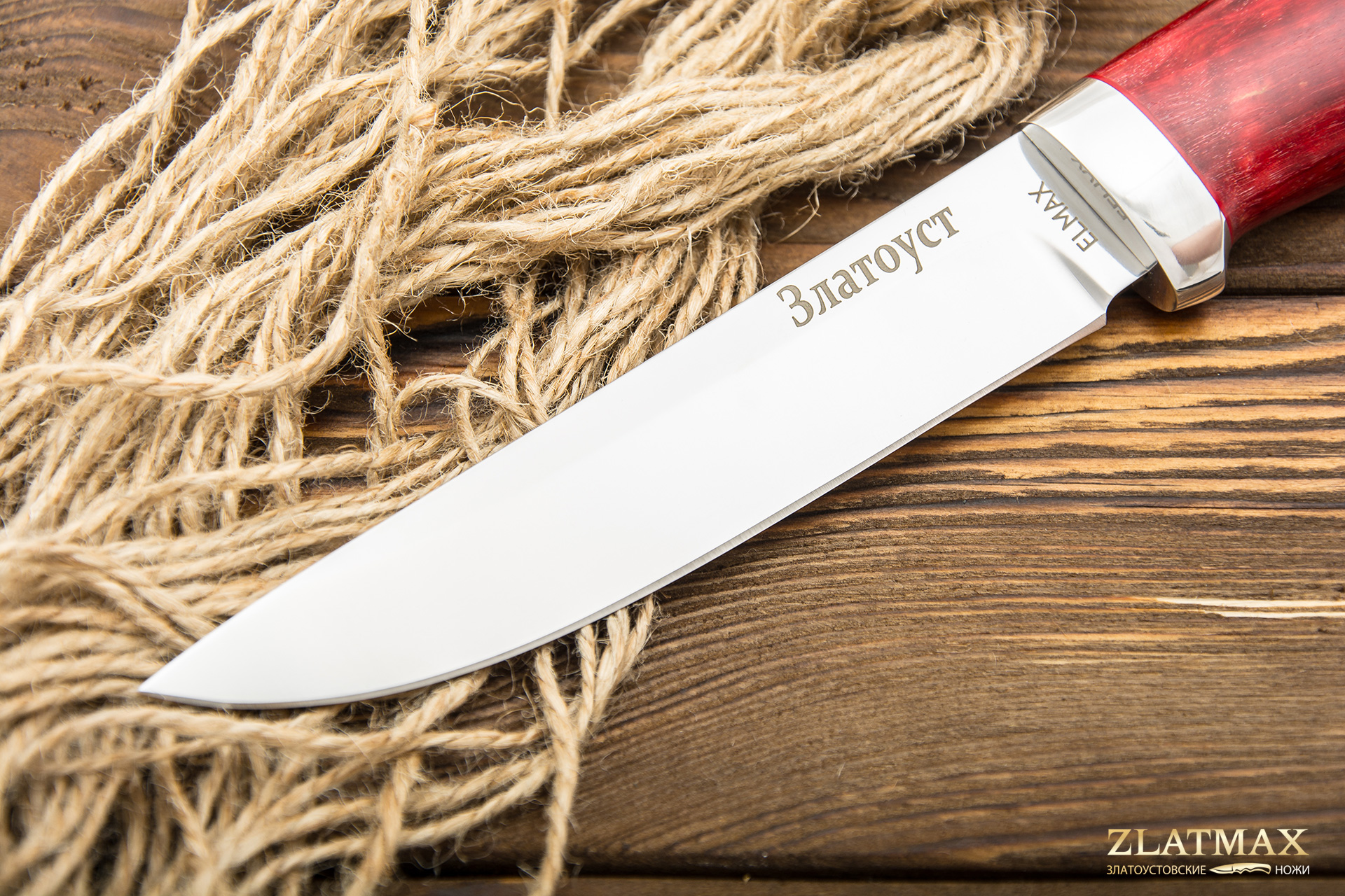 ELMAX - один из признанных лидеров мировой металлургии. Эта сталь была изобретена в Швеции. Она нержавеющая, изготавливающаяся из специального порошка. Обладает большой износоустойчивостью. Благодаря химическому составу, она почти не деформируется, легко переносит воздействие влаги. Специальная термическая обработка позволяет легко затачивать и полировать ножи. Причем поверхность клинка получается практически зеркальной.