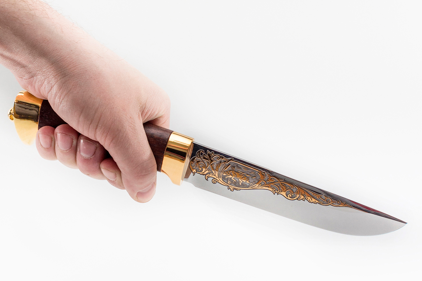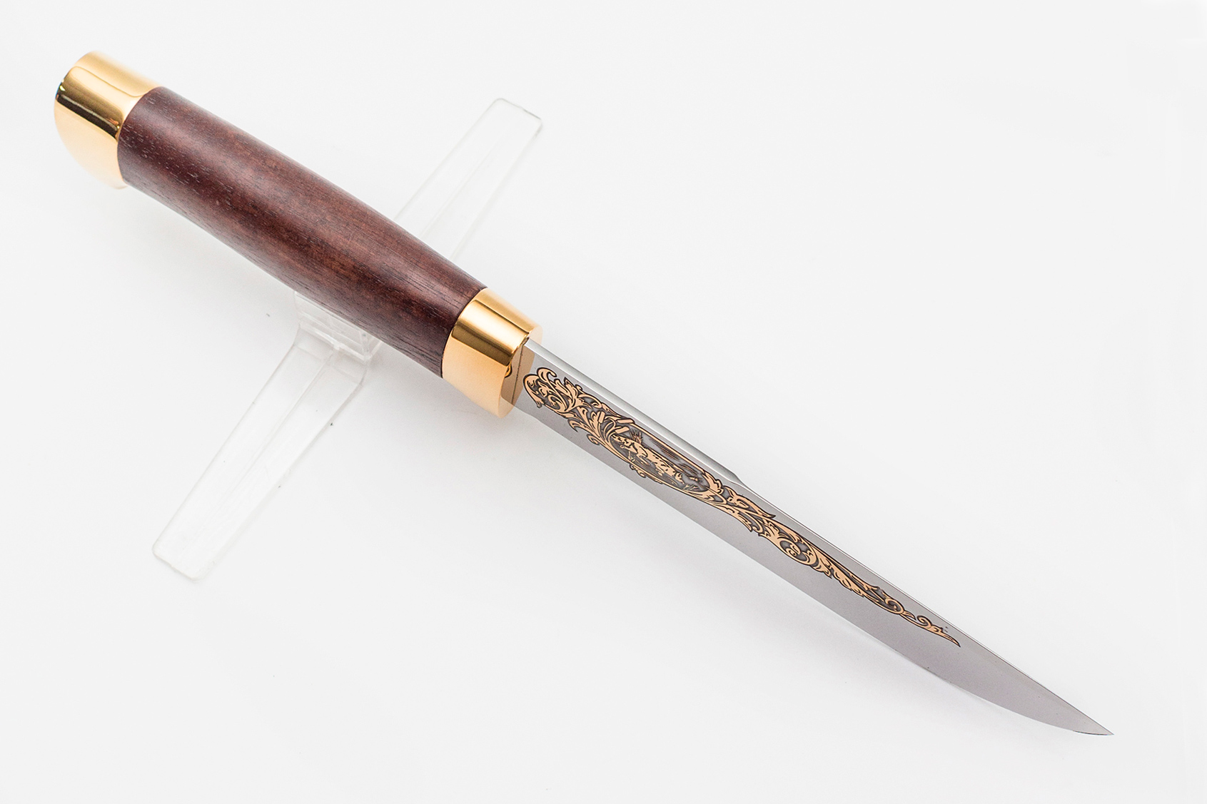 Материал: клинок из стали ЭИ-107; рукоять - кап березовый; тыльник, гарда - латунь; кожаные ножны. Покрытие: золотом 999,9; никелем. Техника исполнения: токарные и слесарные работы, полировка. Характеристики Ножи Охотничьи Тип стали Кованная нержавеющая 40Х10С2М(ЭИ-107) Материал рукояти Березовый кап Общая длина, мм 295 Длина клинка, мм 155 Ширина клинка, мм 30 Толщина клинка, мм 3 Твердость клинка, HRC 58 Покрытие Гальванический метод Вес ножа, кг 0.309 Материал ножен Кожа