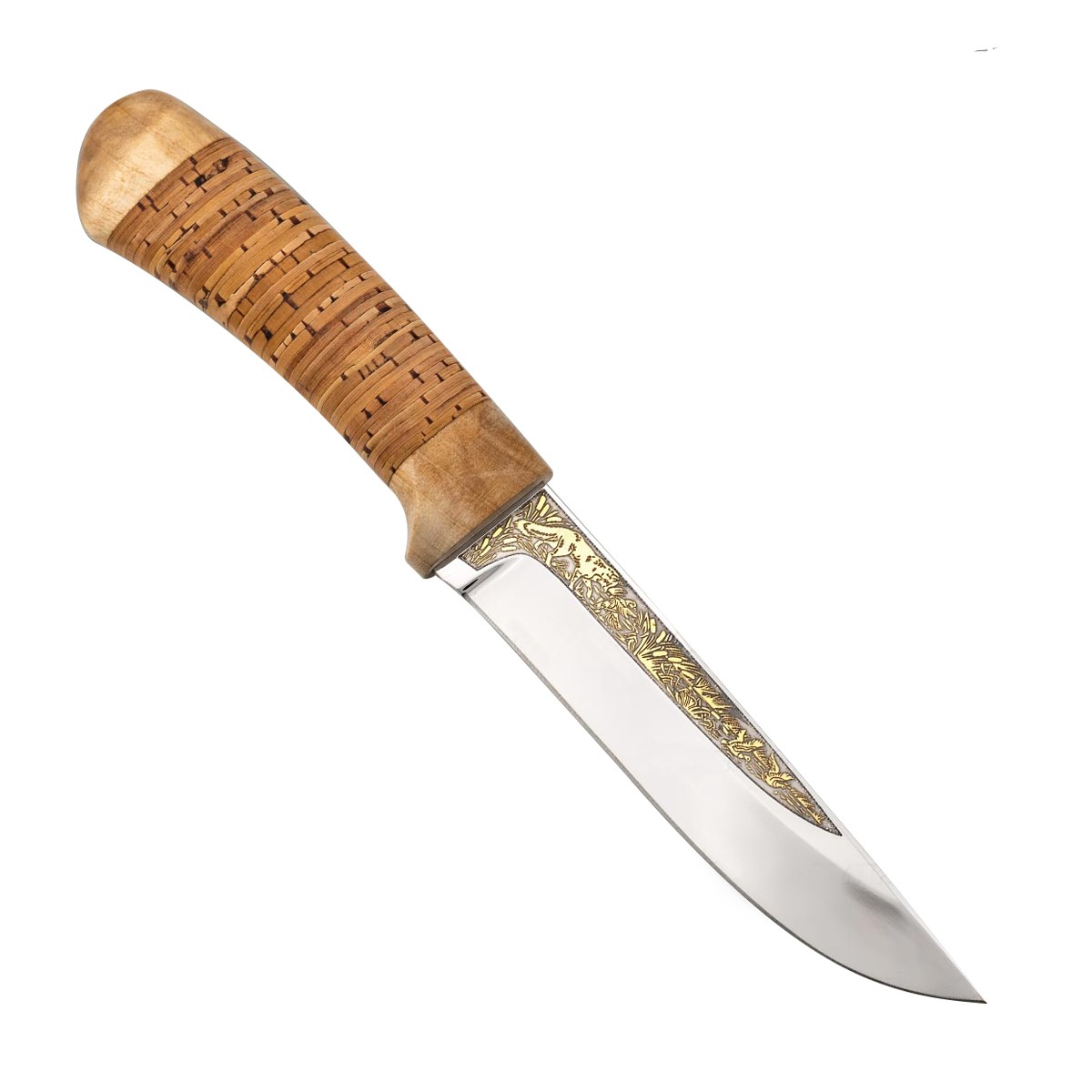 На клинке ножа методом травления, золочения, гравировки нанесен орнамент или рисунок на природные и охотничьи темы. Нож, украшенный златоустовскими узорами, – вполне функциональный инструмент, а не сувенирное изделие. Даже при частом использовании в быту или в дороге, он сохранит свои режущие свойства, и с золотым покрытием на клинке ничего не случится. Это связано с особой техникой нанесения золотого узора – он наносится гальваническим методом на глубину 1 мкм, благодаря чему рисунок не сотрется.