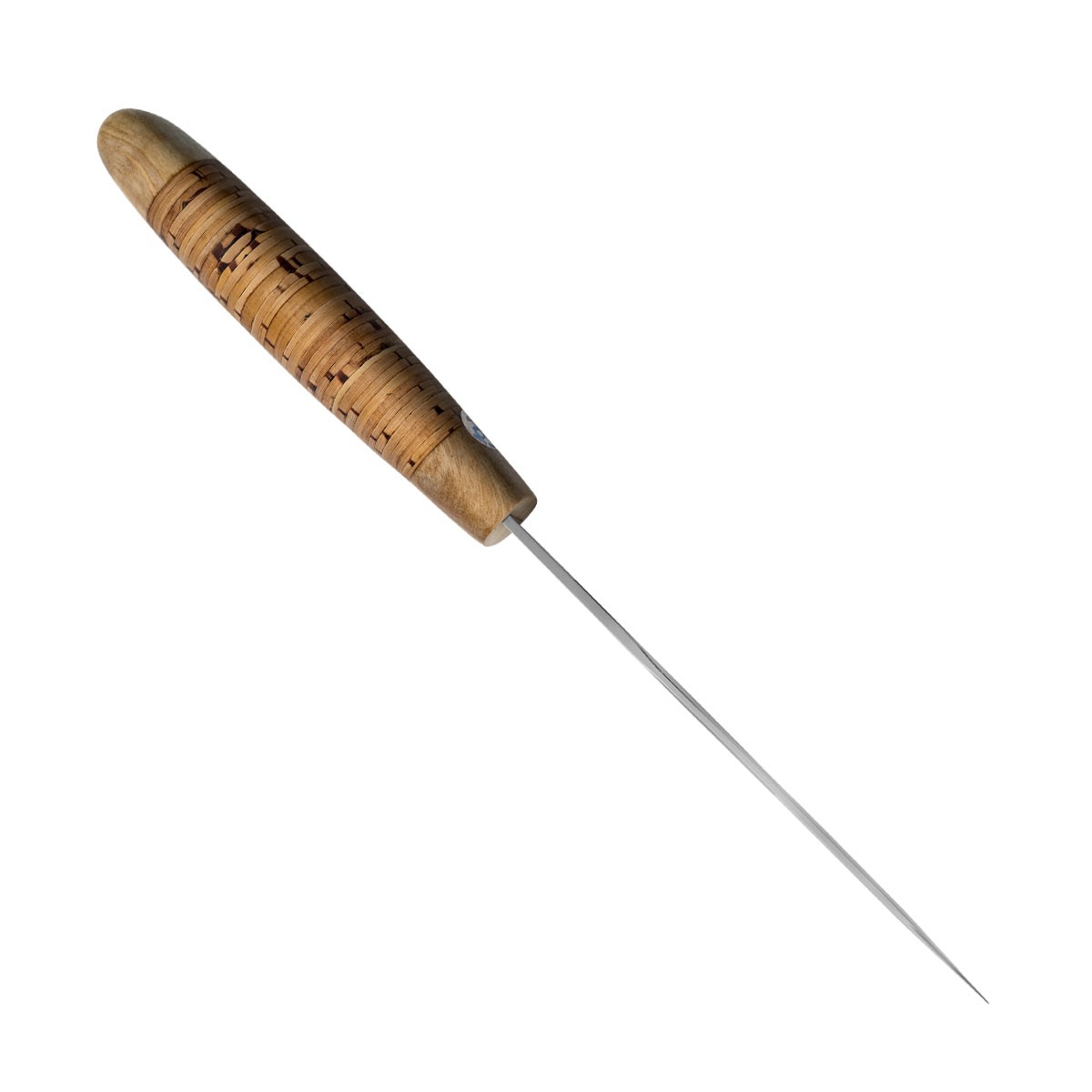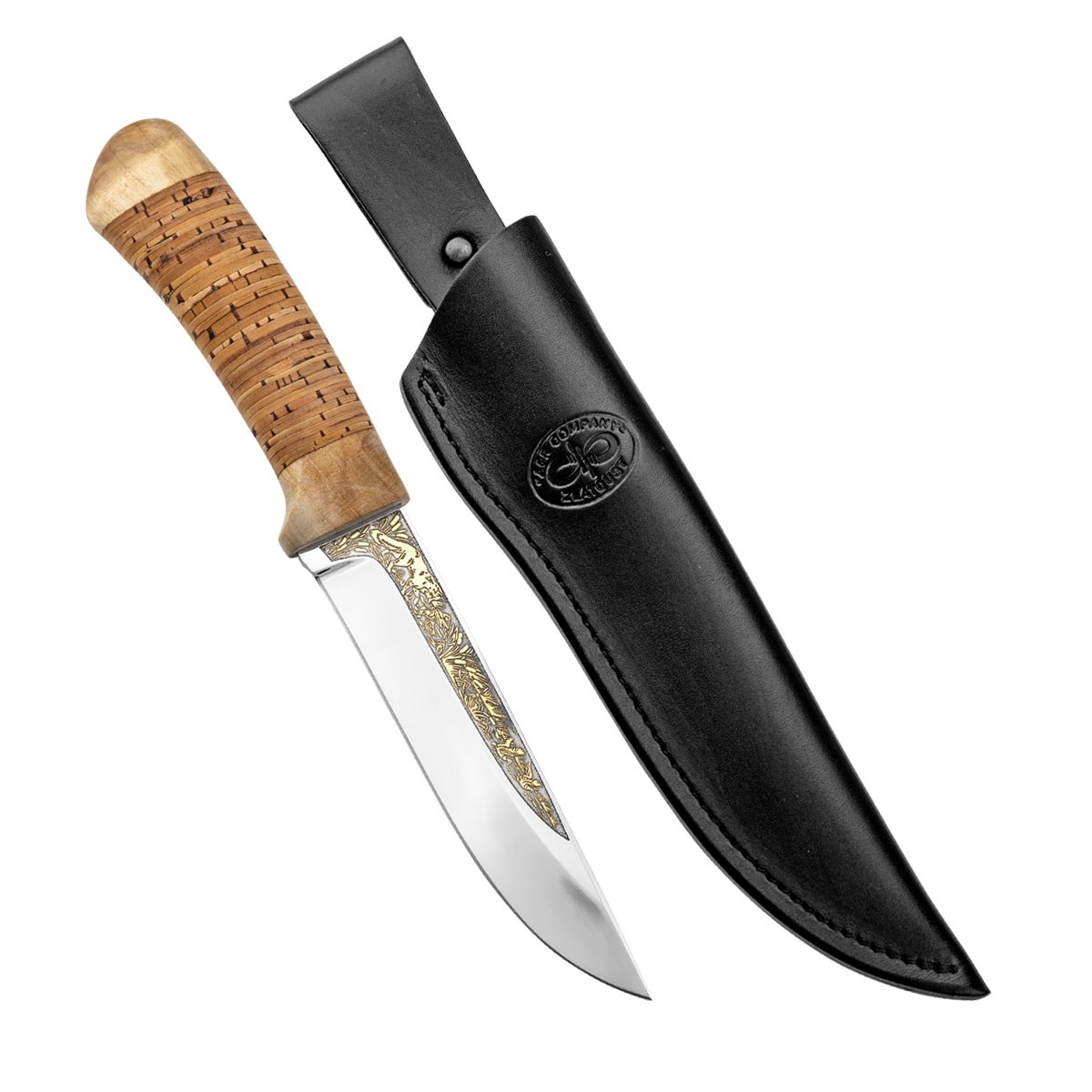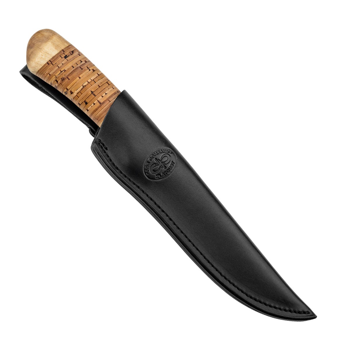 Сравнительно небольшой, универсальный, легкий и прочный нож с клинком, имеющим чуть приспущенный к острию обушок. Спуски в виде линзы на большую часть ширины клинка образуют тонкое, изумительно режущее лезвие. Толщина обуха в 2,4 мм позволяет оставить приличную голомень, что придает ему дополнительную прочность. Рукоятка имеет эргономичную форму, что позволяет пользоваться ножом человеку с любым размером ладони. Гарда умеренной величины защищает пальцы при резе. Монтаж клинка сквозной, неразборный. На навершии рукояти имеется отверстие под темляк. Великолепное решение для тех, кто любит проводить время на природе и вдали от городской суеты. Пользуется неизменной популярностью у покупателей.