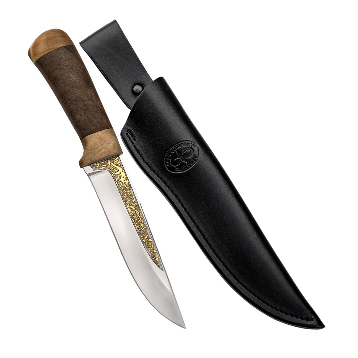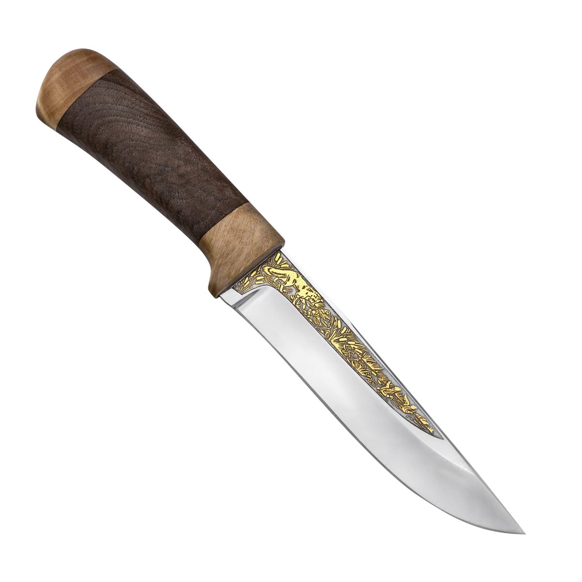 На клинке ножа методом травления, золочения, гравировки нанесен орнамент или рисунок на природные и охотничьи темы. Нож, украшенный златоустовскими узорами, – вполне функциональный инструмент, а не сувенирное изделие. Даже при частом использовании в быту или в дороге, он сохранит свои режущие свойства, и с золотым покрытием на клинке ничего не случится. Это связано с особой техникой нанесения золотого узора – он наносится гальваническим методом на глубину 1 мкм, благодаря чему рисунок не сотрется.